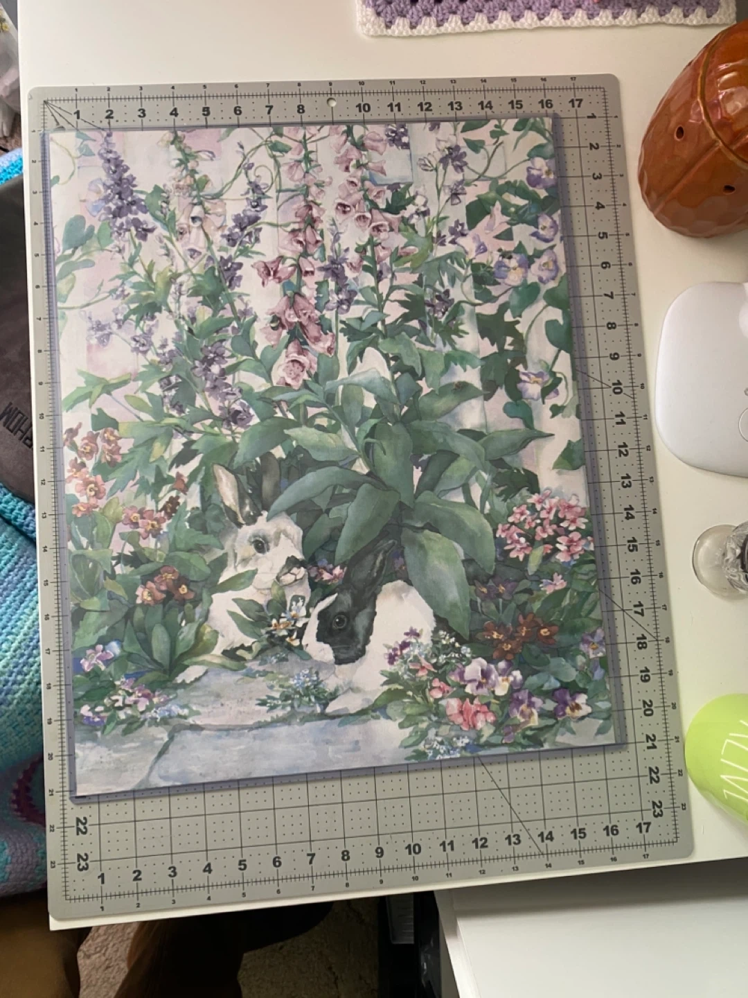 Selling a lovely floral art print featuring adorable bunnies. It measures approximately 17x22 inches, perfect for adding a touch of nature to any room! It's in great condition and ready to be displayed