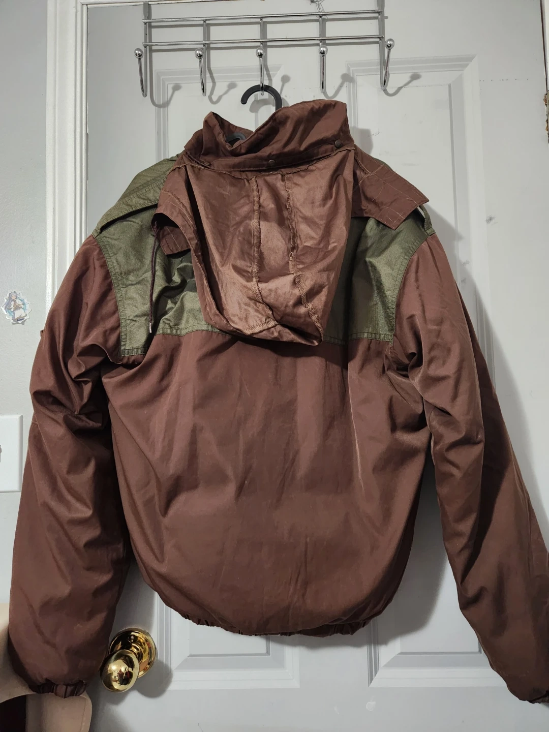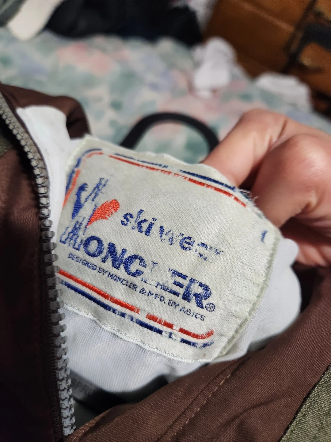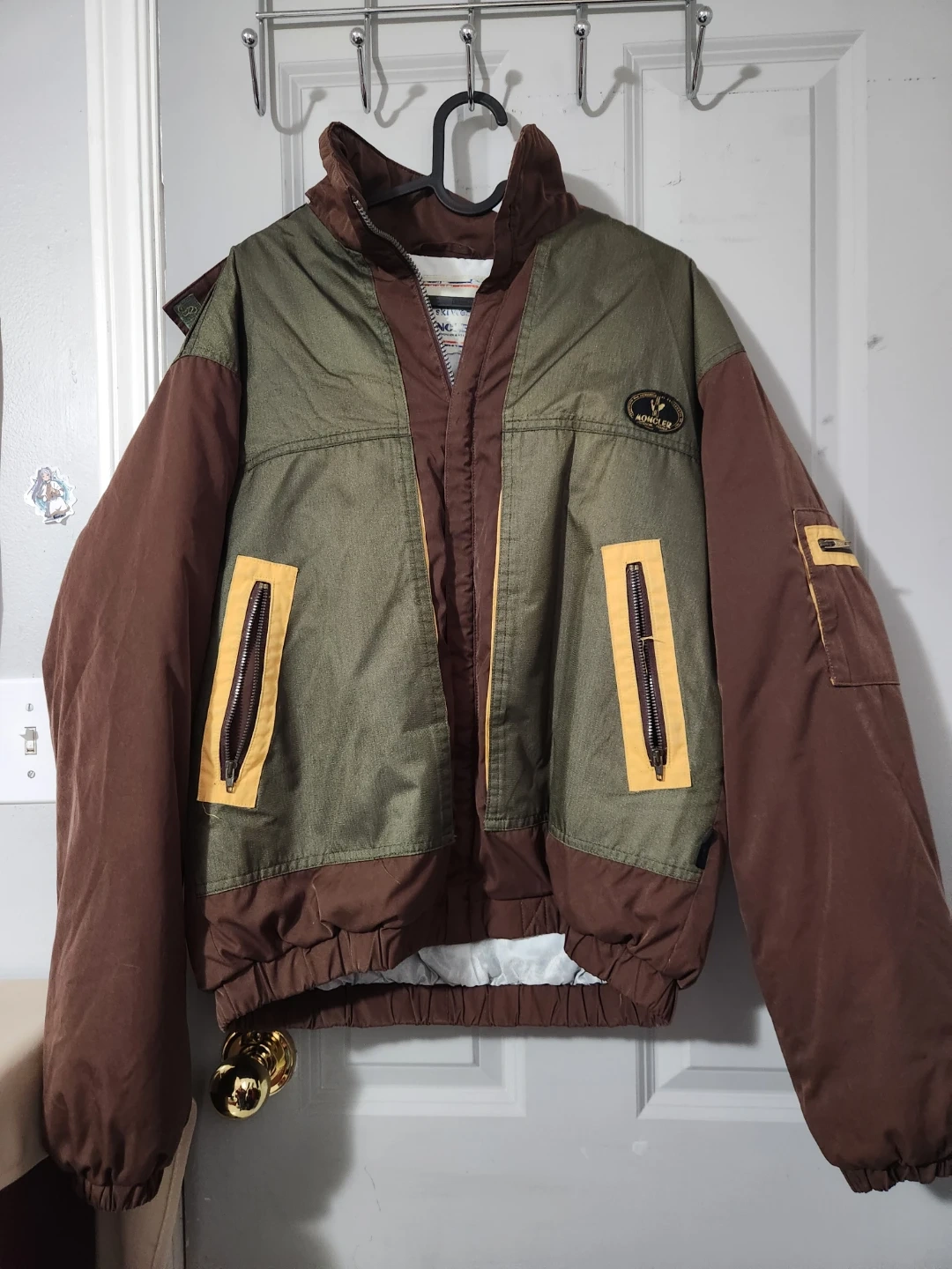 Selling a Moncler jacket in brown and olive green! It's in great condition and perfect for the slopes. The design is quite unique with yellow zipper accents.