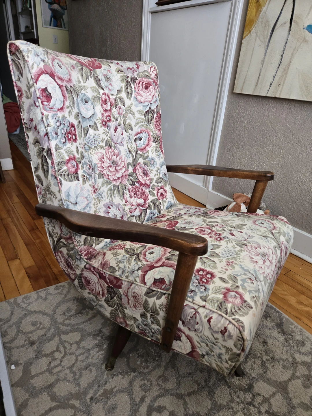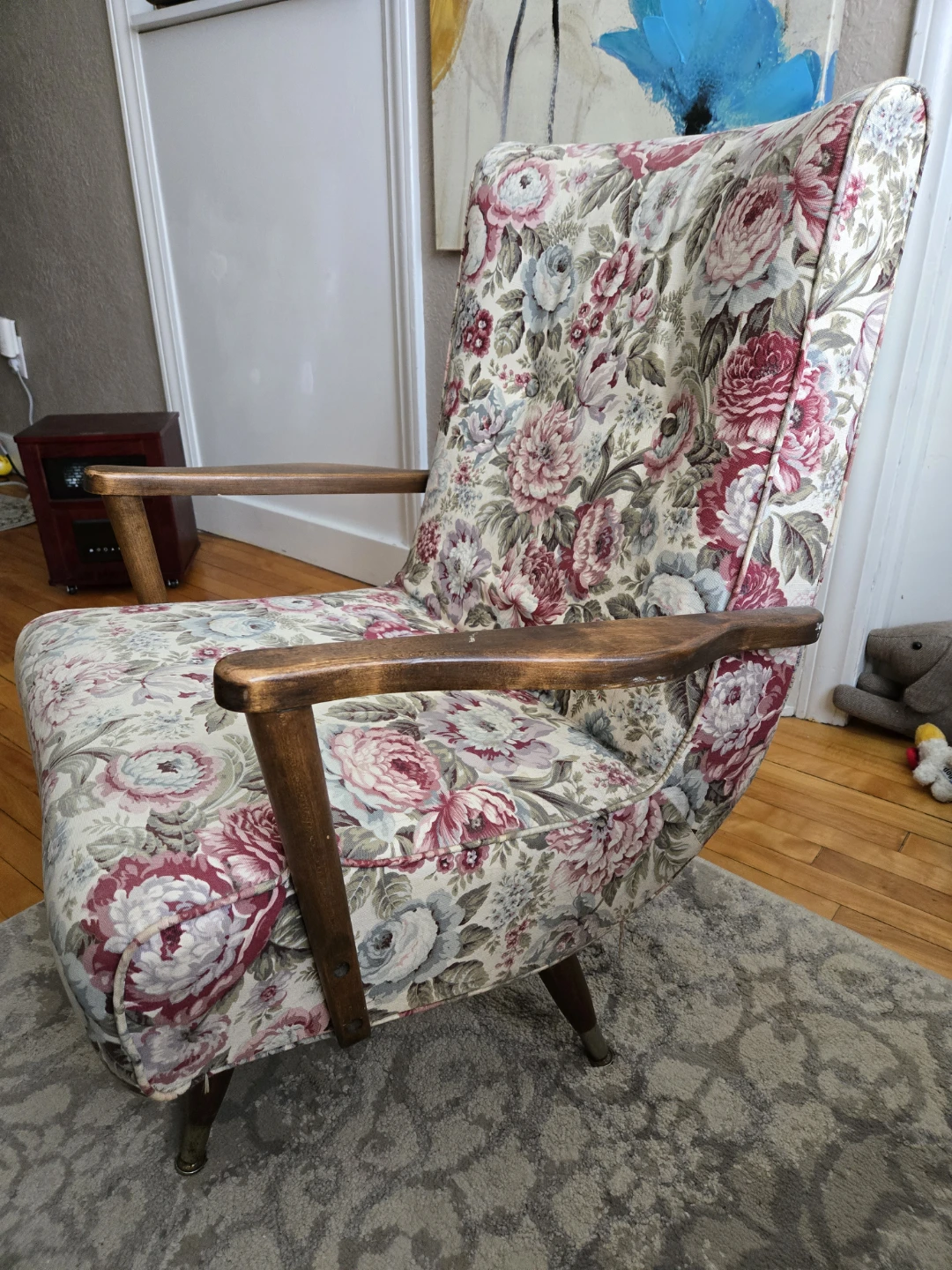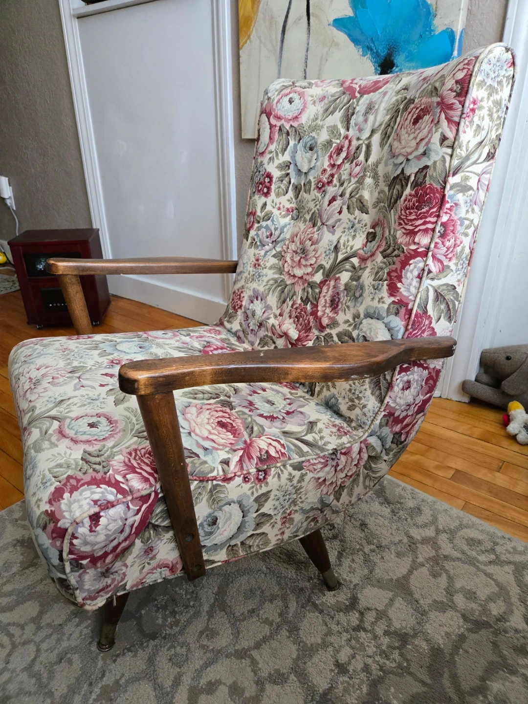 Selling a vintage rocking armchair with a beautiful floral pattern. The chair features wooden armrests and legs. It's a unique piece that would add a touch of retro charm to any room!