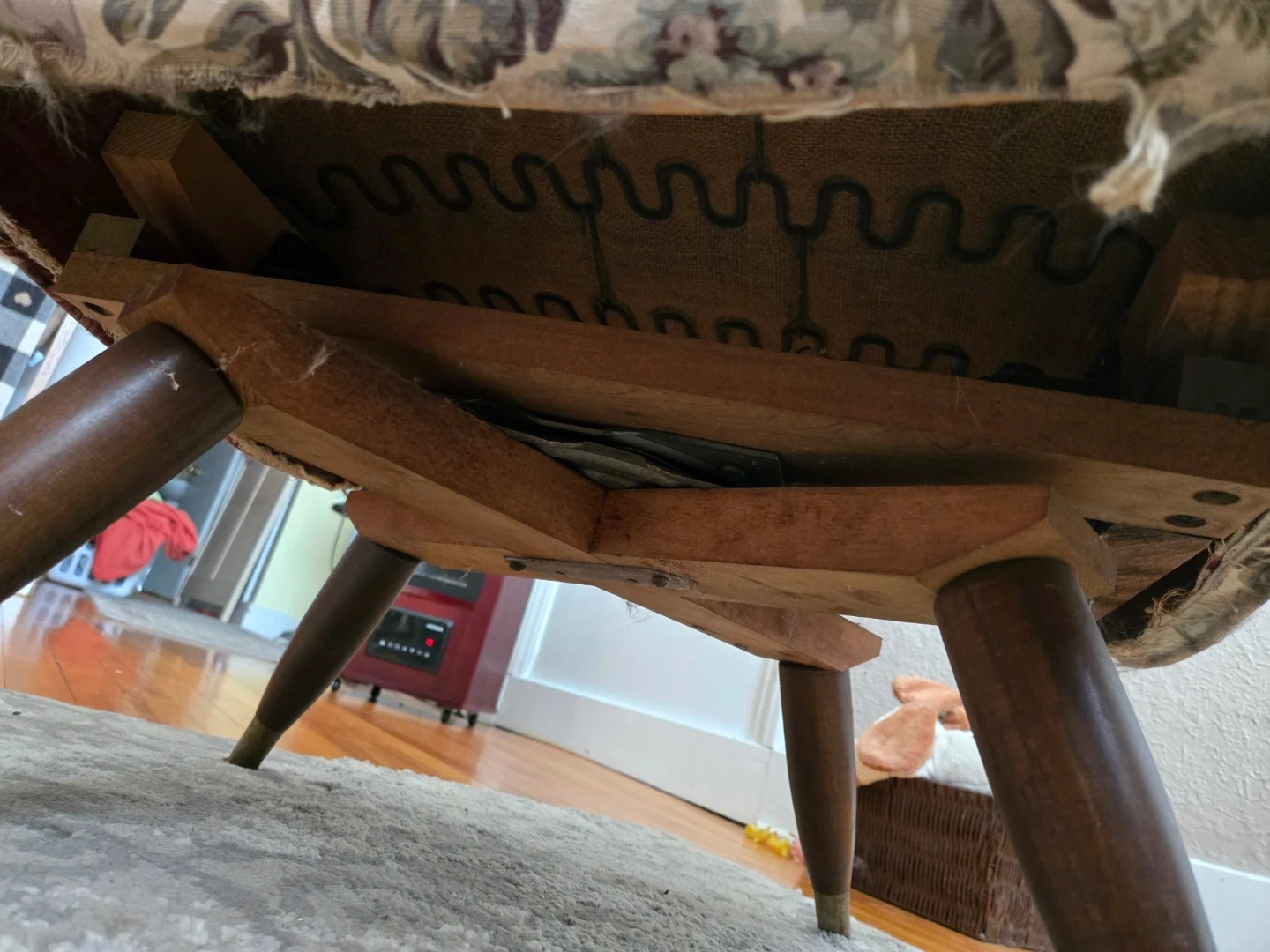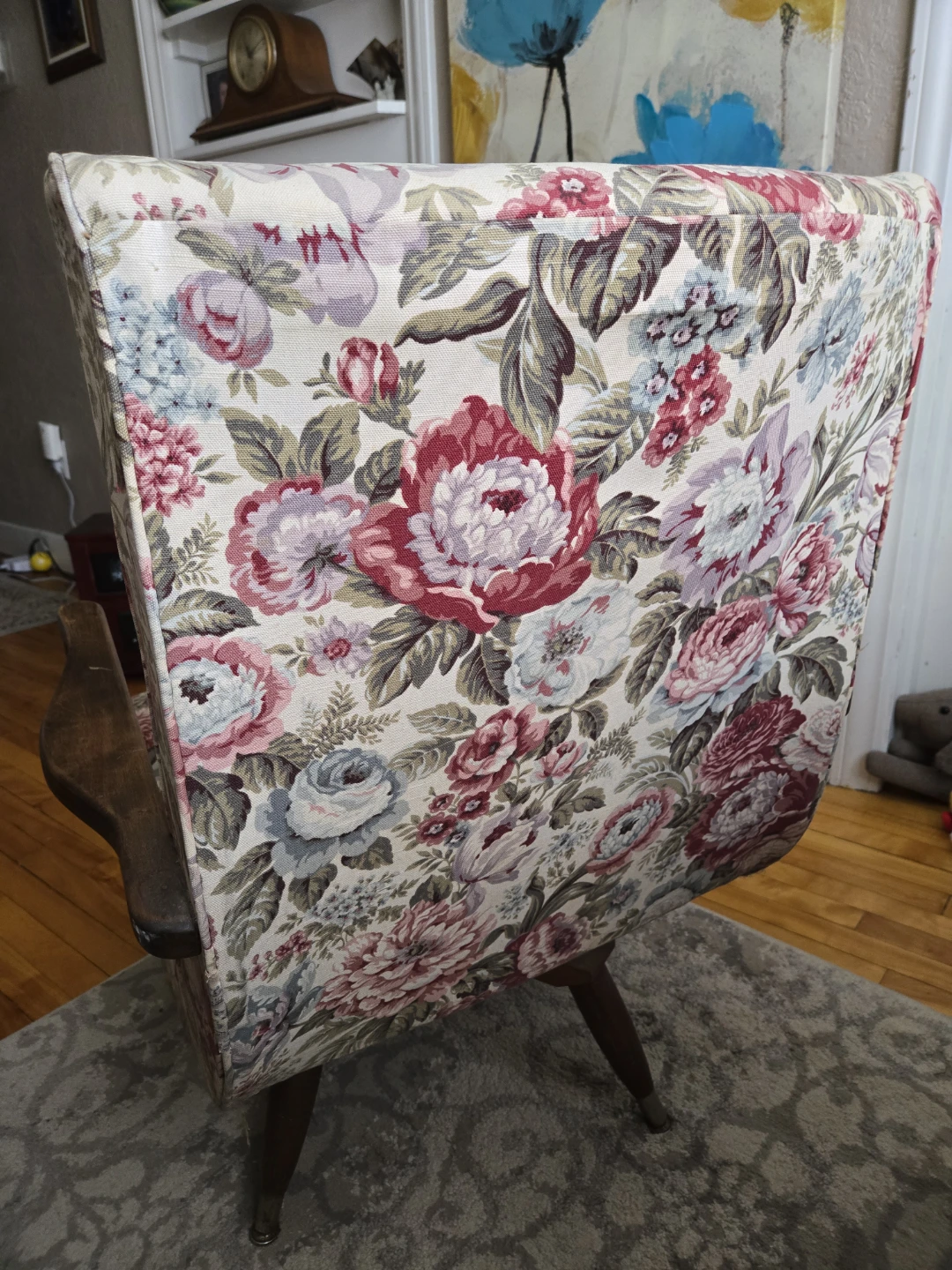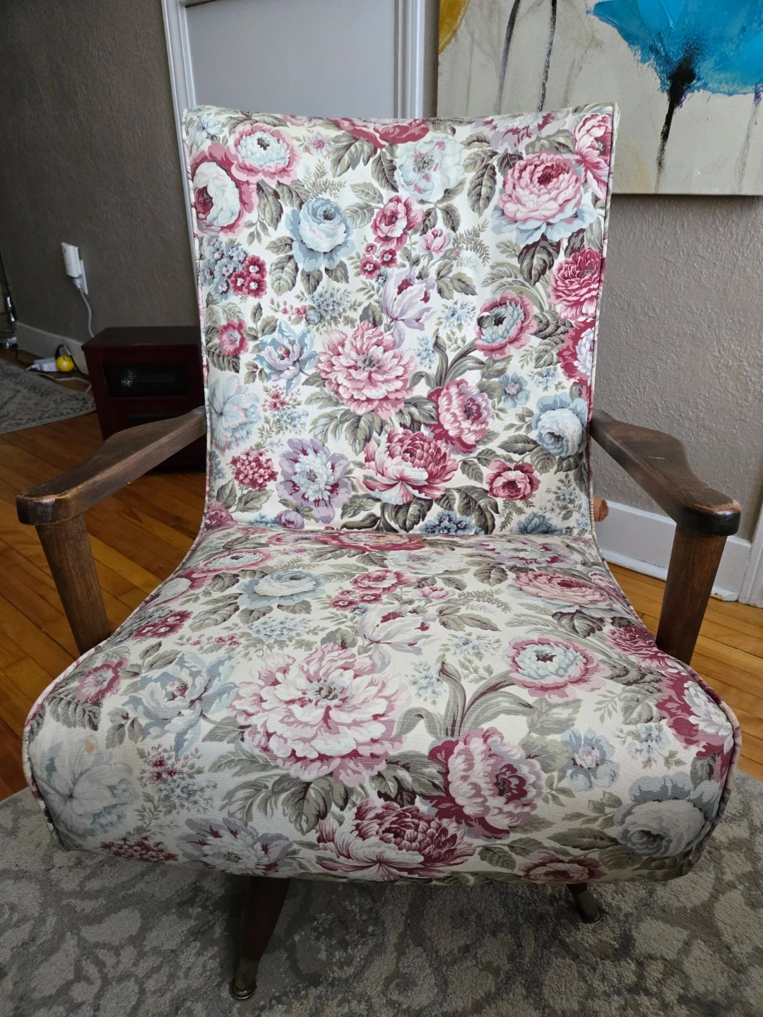 Selling a vintage rocking armchair with a beautiful floral pattern. The chair features wooden armrests and legs. It's a unique piece that would add a touch of retro charm to any room!