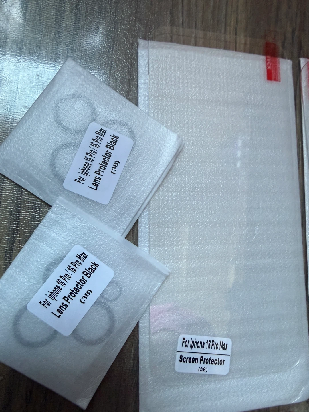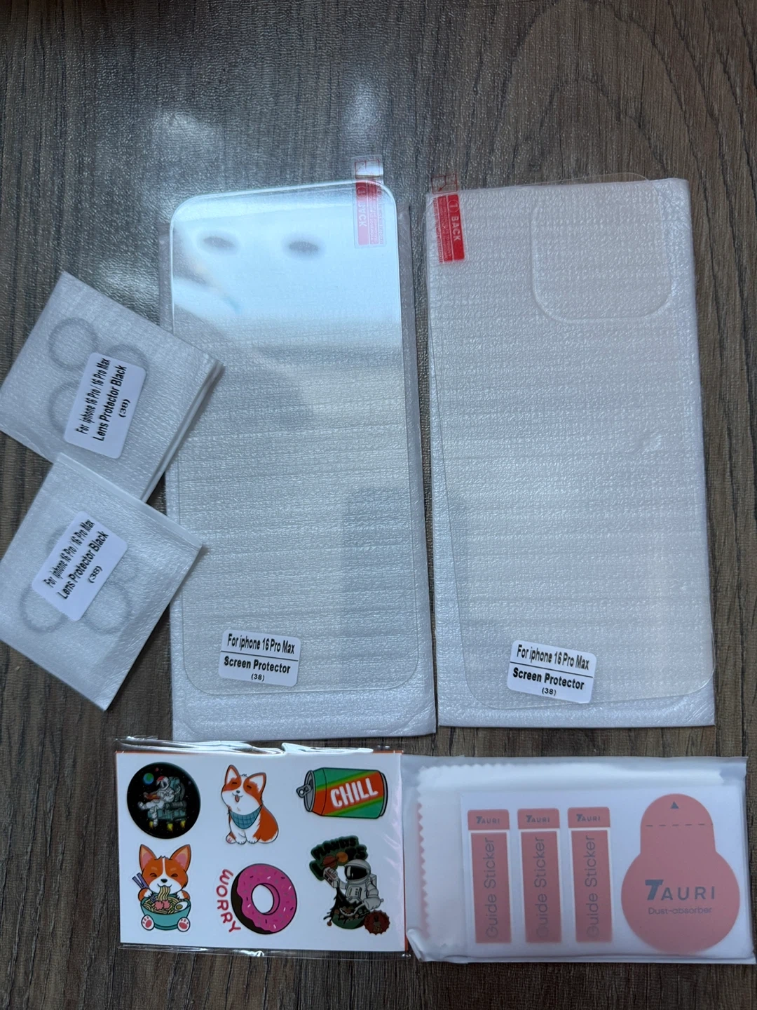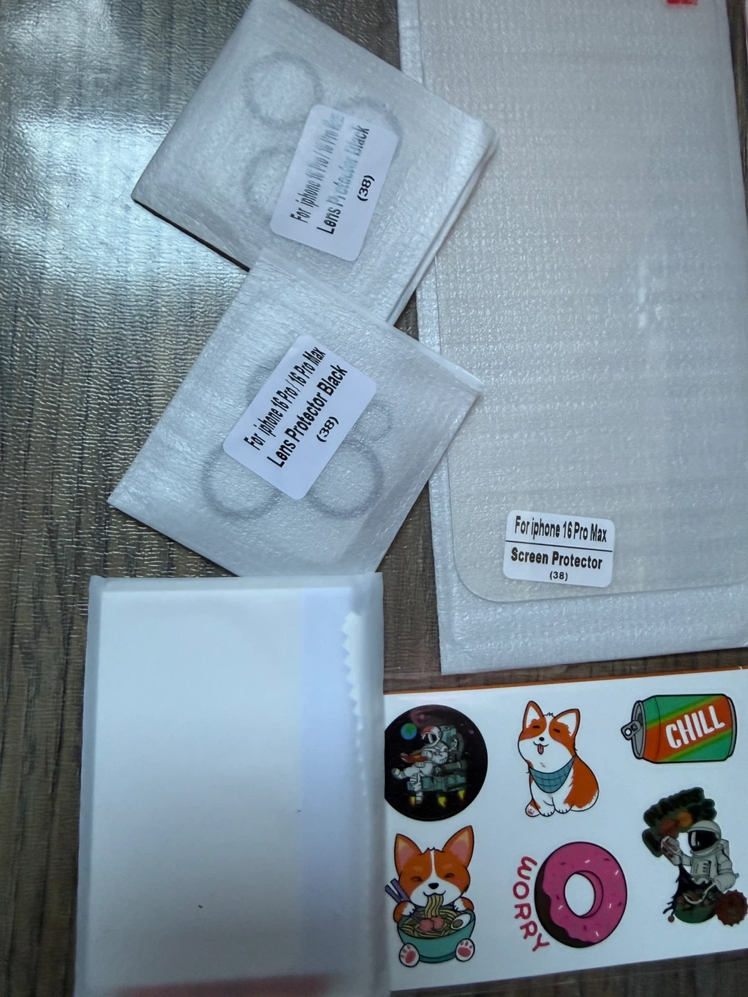 Selling screen and lens protectors for the iPhone 16 Pro and Pro Max. Includes black lens protectors and screen protectors. Also comes with a cleaning kit and some cute stickers!