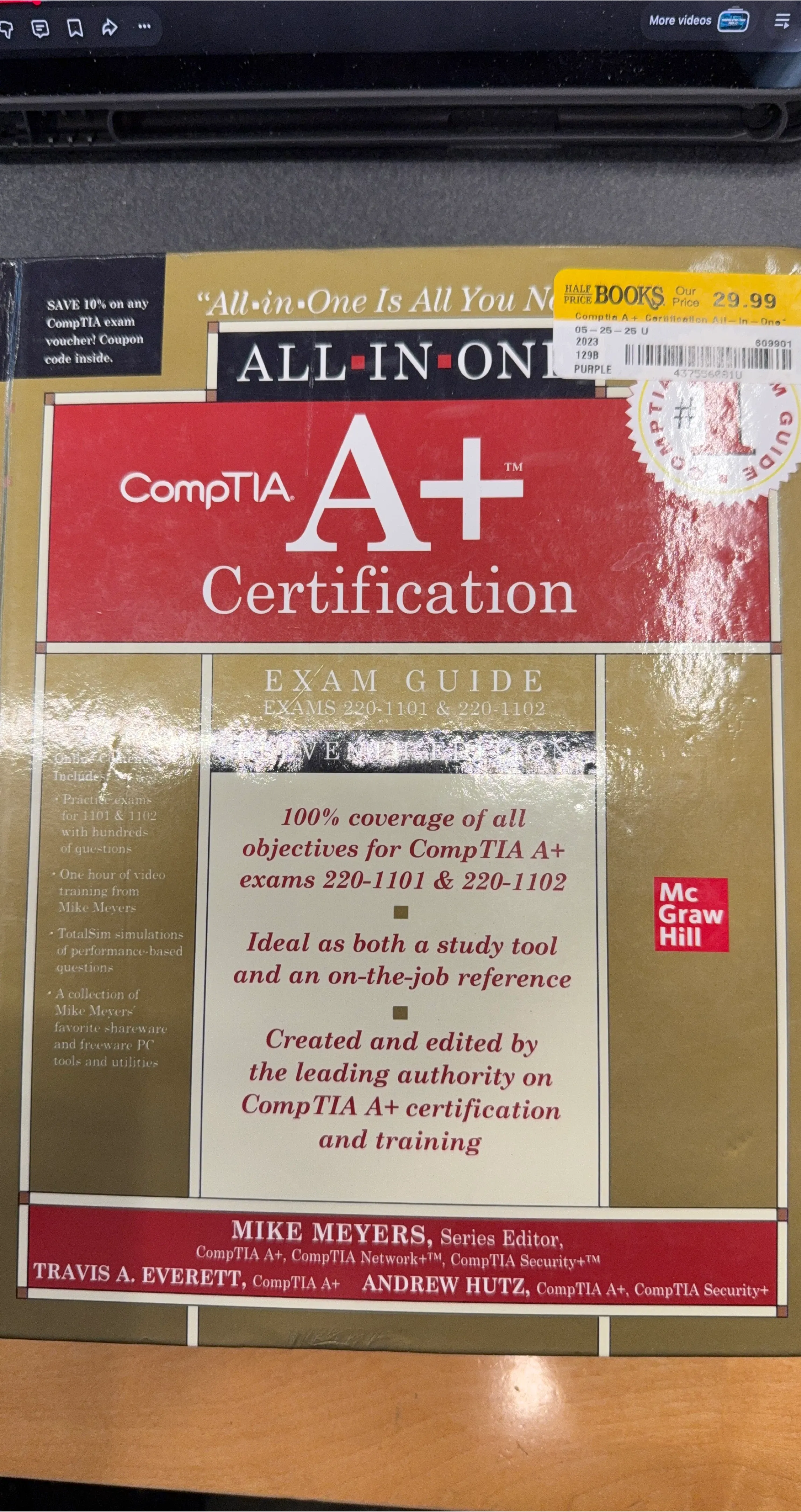 Selling a CompTIA A+ Certification Exam Guide. This guide covers exams 220-1101 & 220-1102. It includes practice exams with hundreds of questions and one hour of video training from Mike Meyers. Also includes TotalSim simulations of performance-based questions. Originally priced at $29.99.