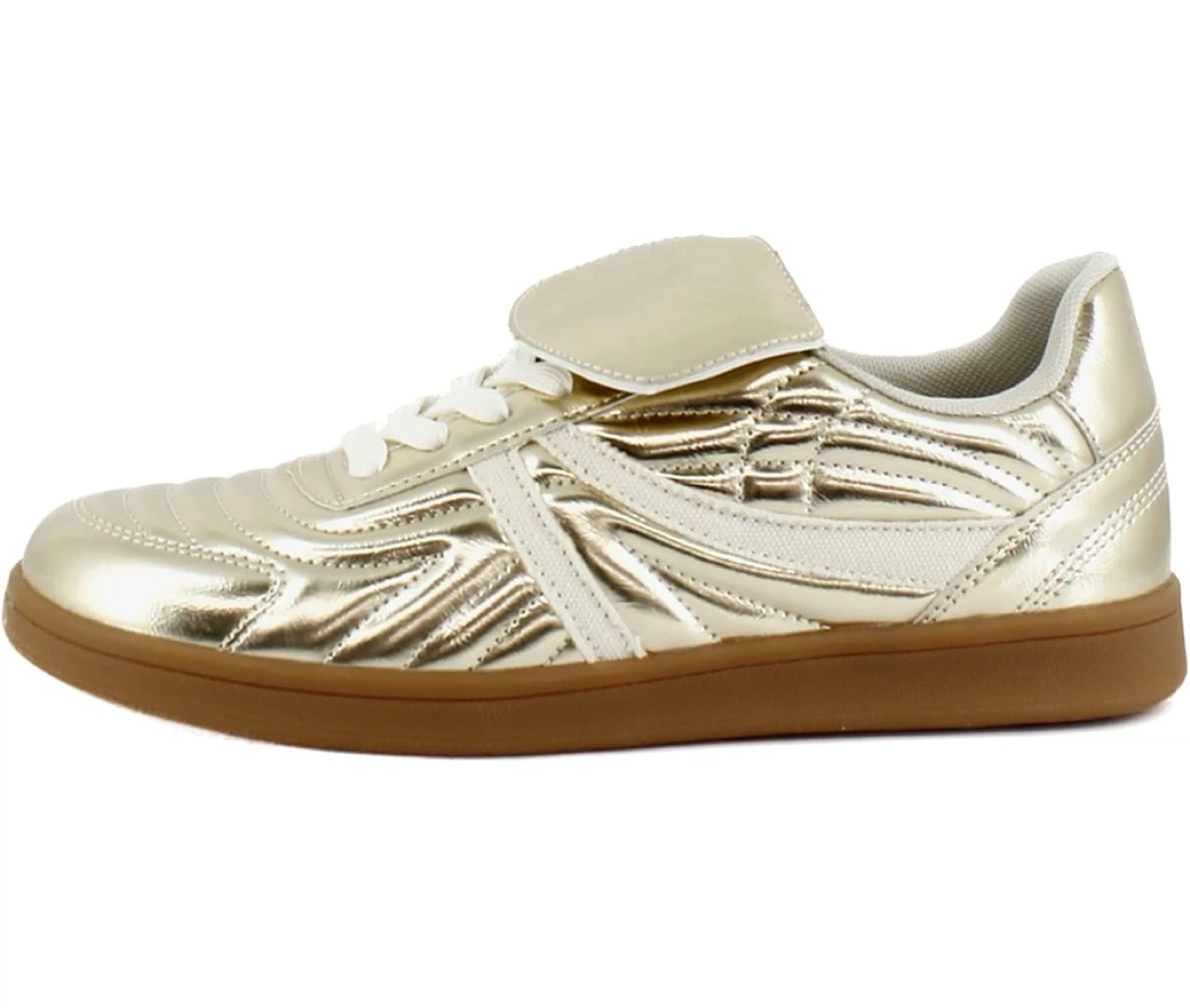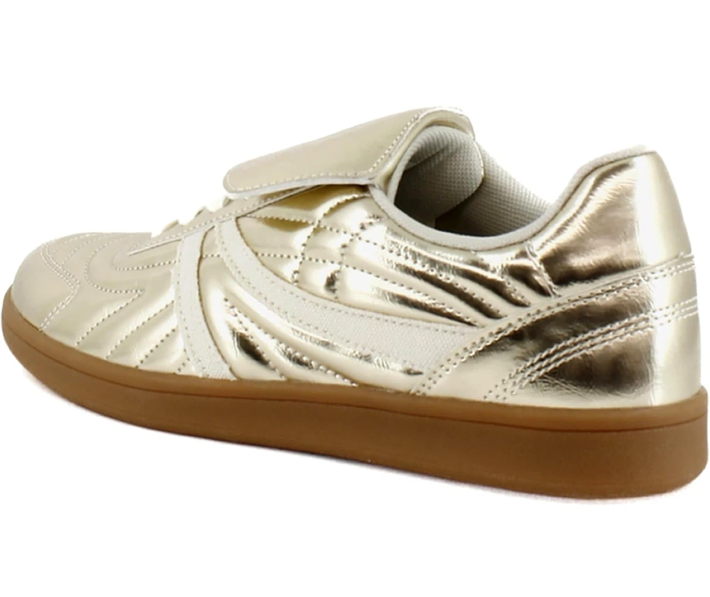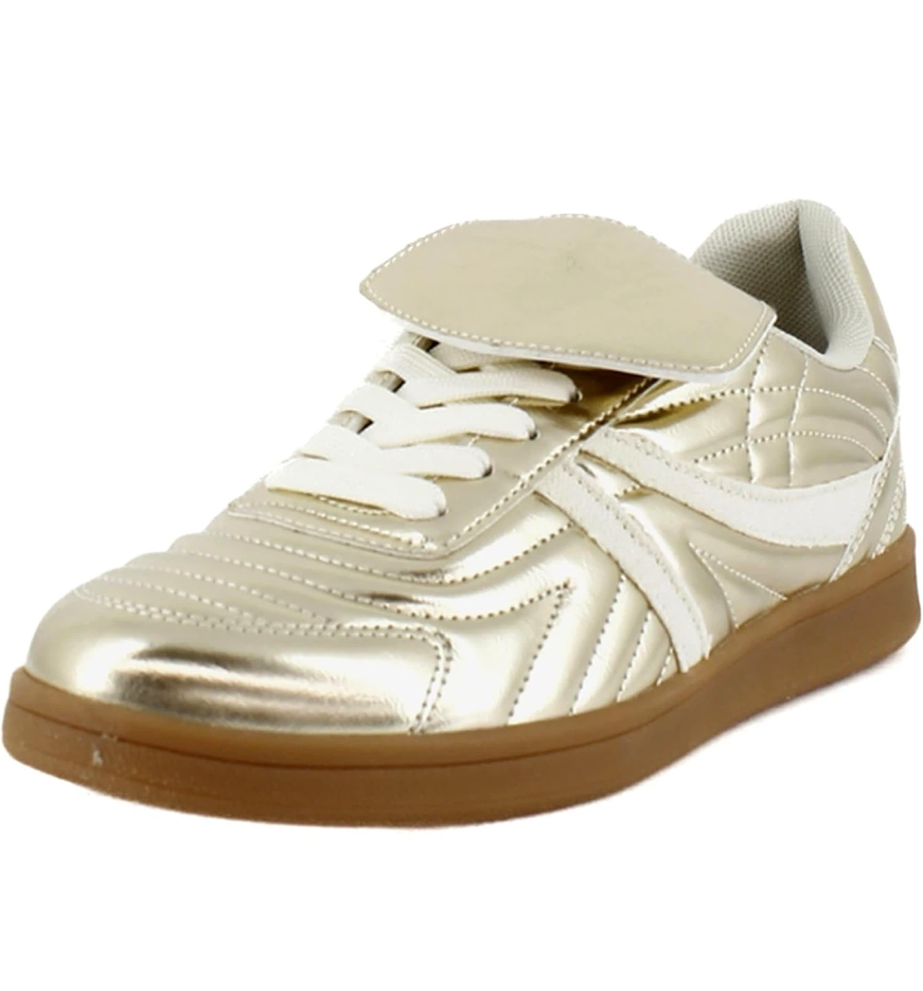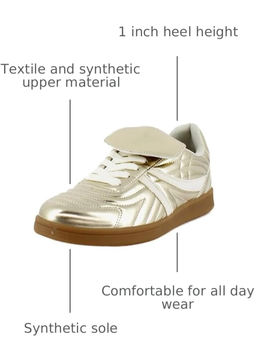 These gold metallic fashion sneakers are perfect for adding a bit of shine to your everyday look! They feature a textile and synthetic upper material and a comfortable synthetic sole. The heel height is 1 inch. Great for all-day wear! Brand new. Never worn. Comes with box.