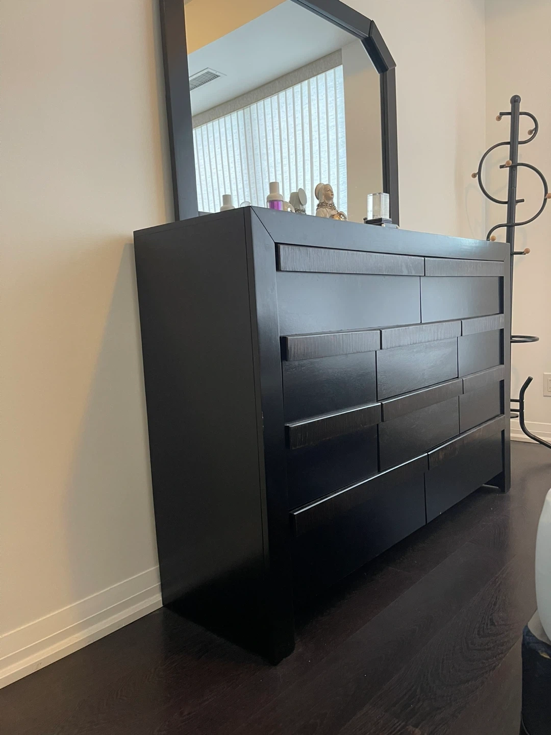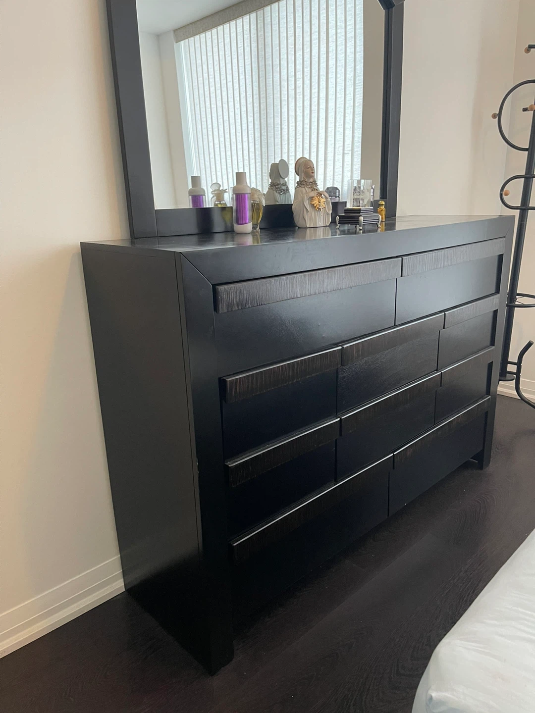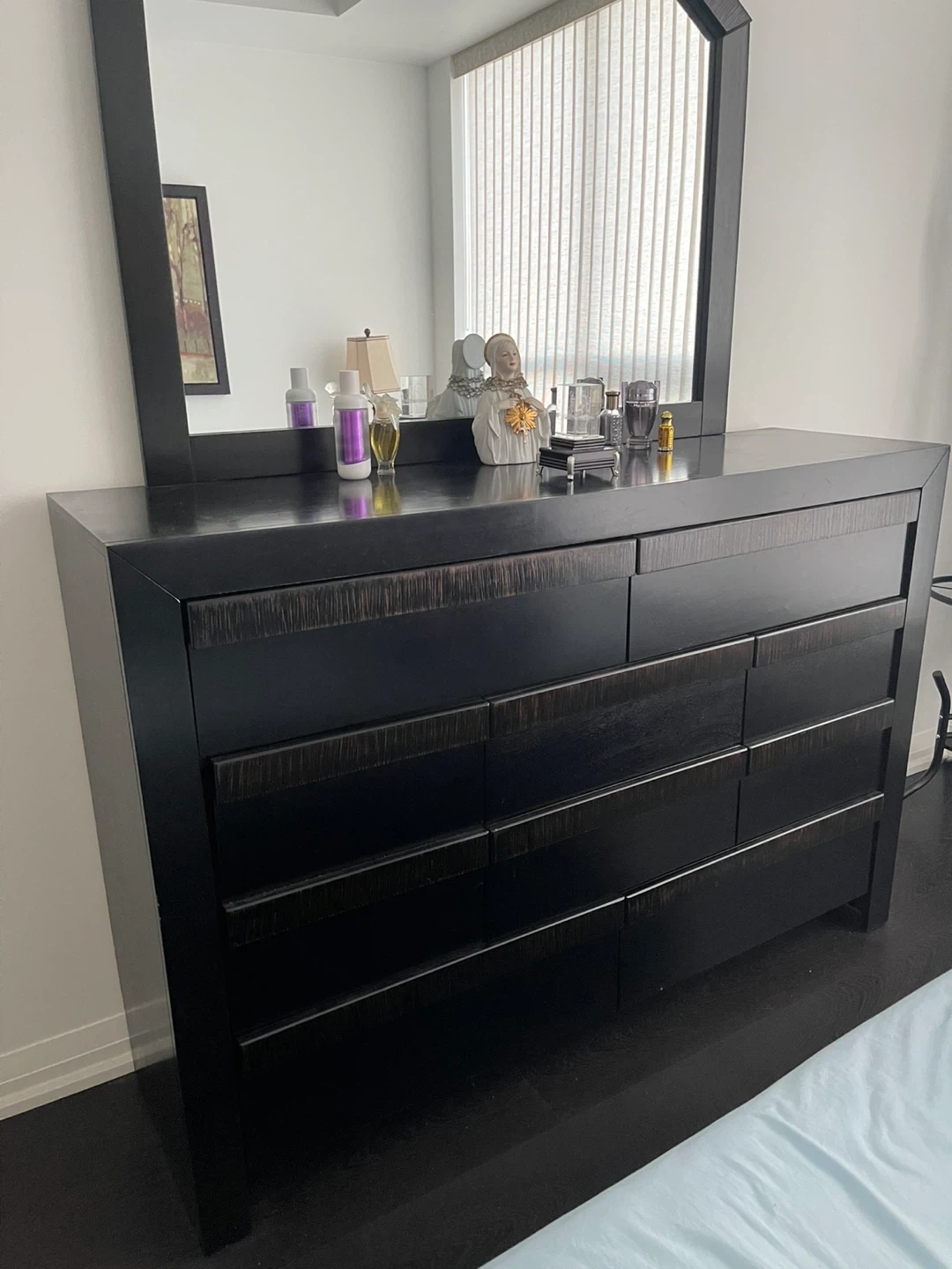 A dresser with a mirror and a 2 nightstand. Both 4 pieces are in great condition and would look great in any bedroom! No bed