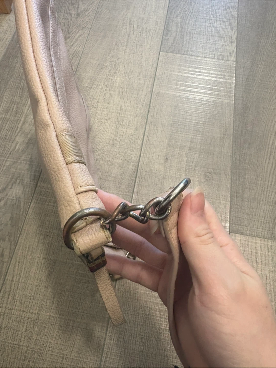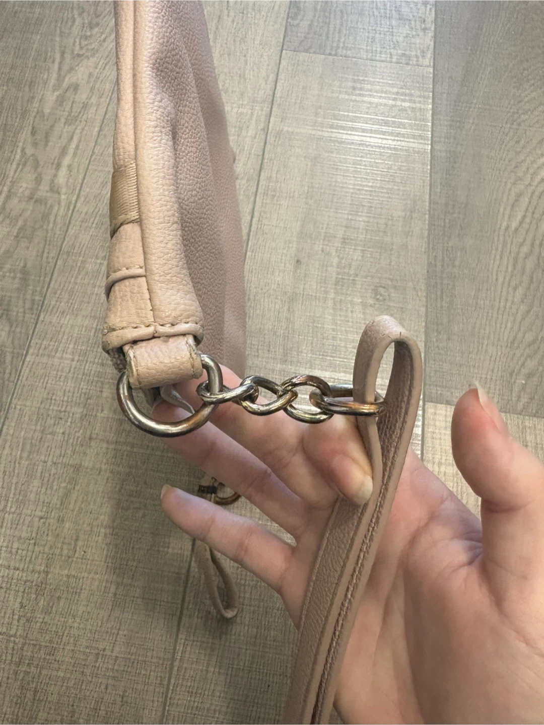 The metal chain got tarnished at some spots and some tiny peelings but still lots of life left. No stains.