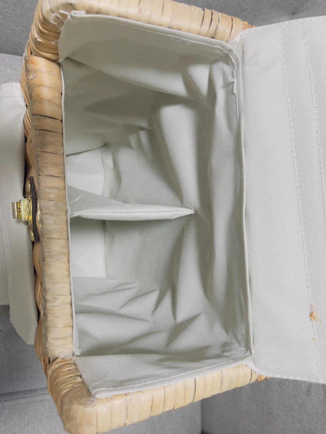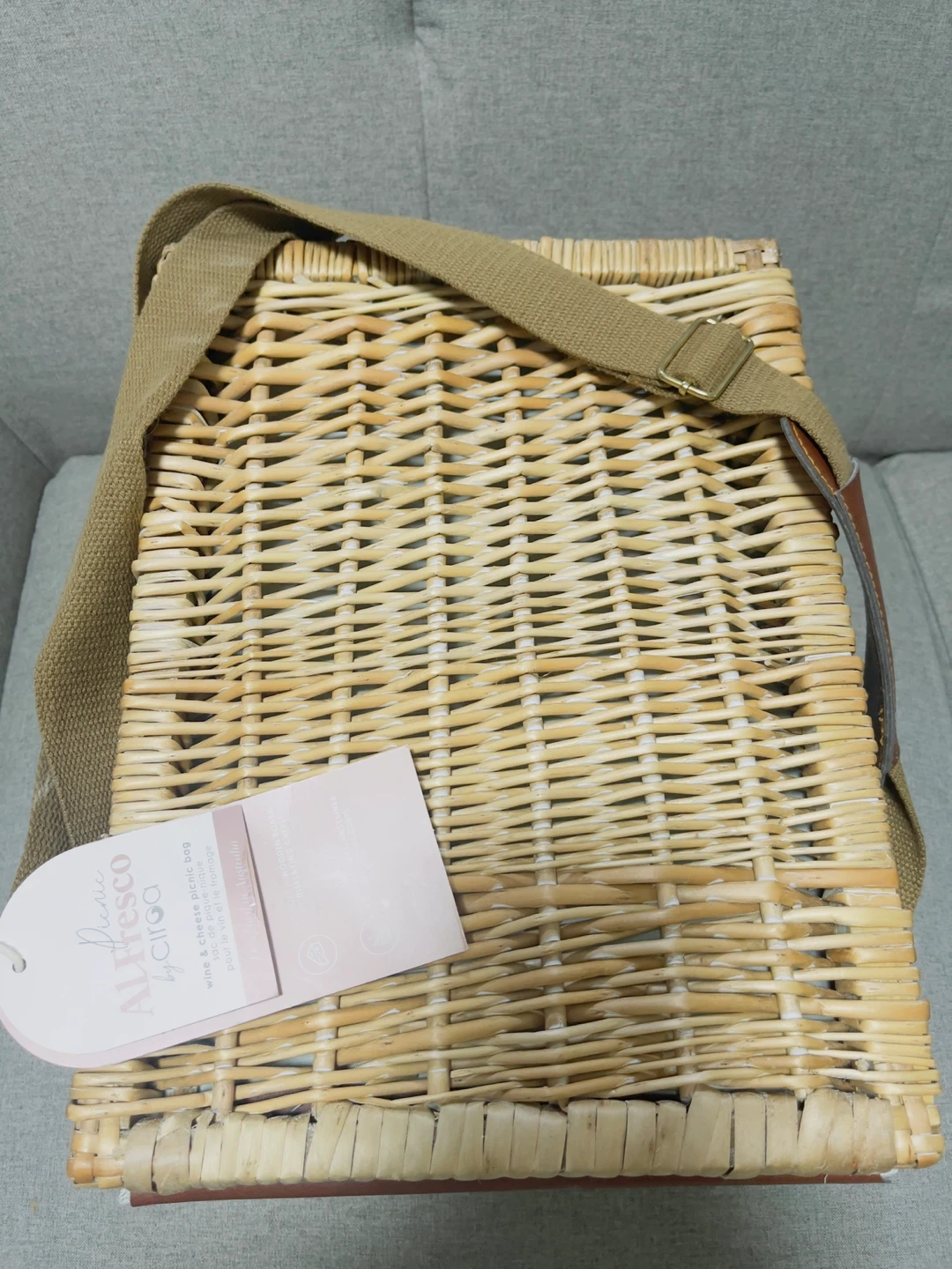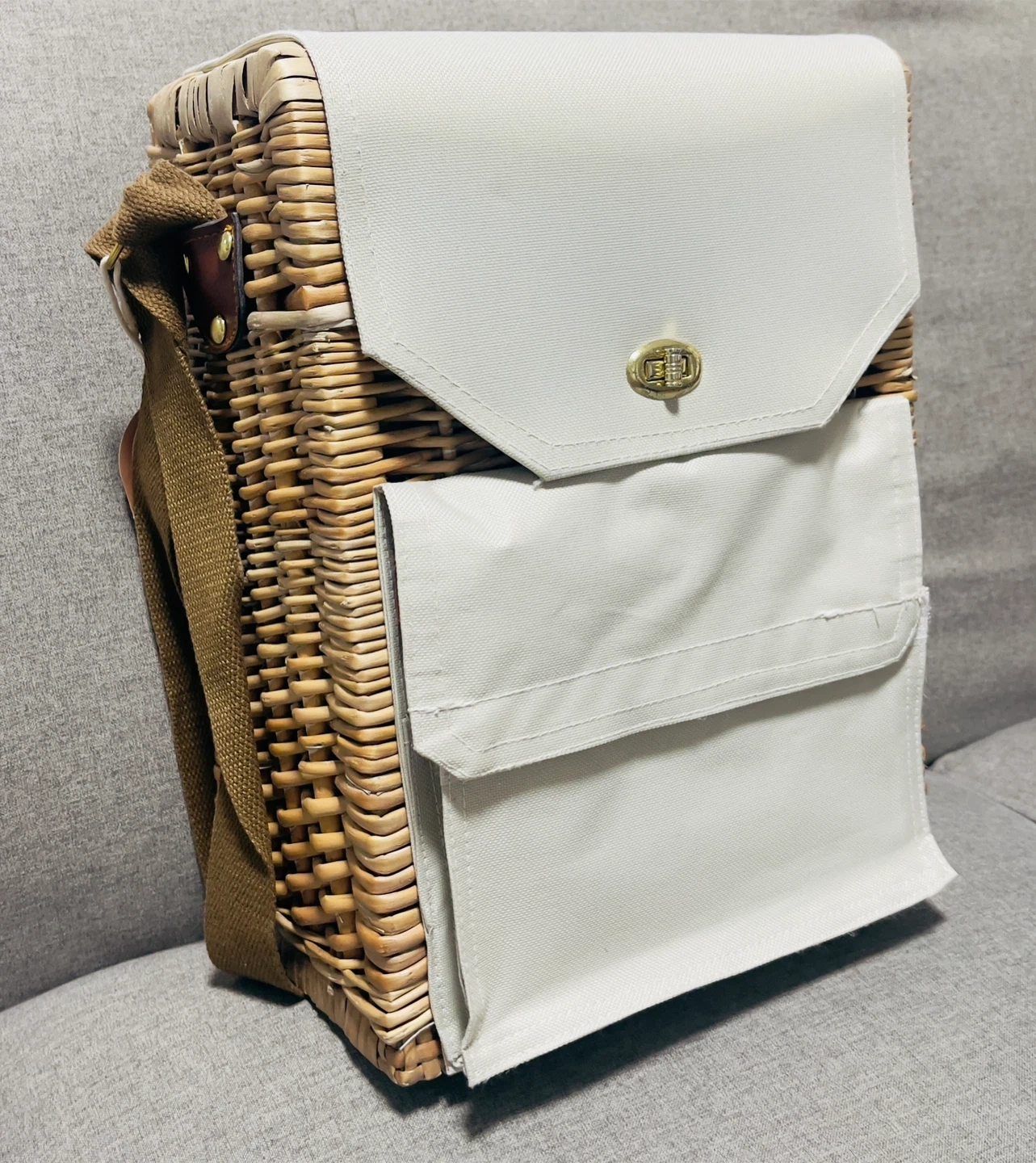 Charming wicker picnic basket with a beautiful rustic, vintage feel. Clean fabric-lined interior with compartments, sturdy handle and strap. Perfect for picnics, wine & cheese outings, cottage use, or even home décor/storage.