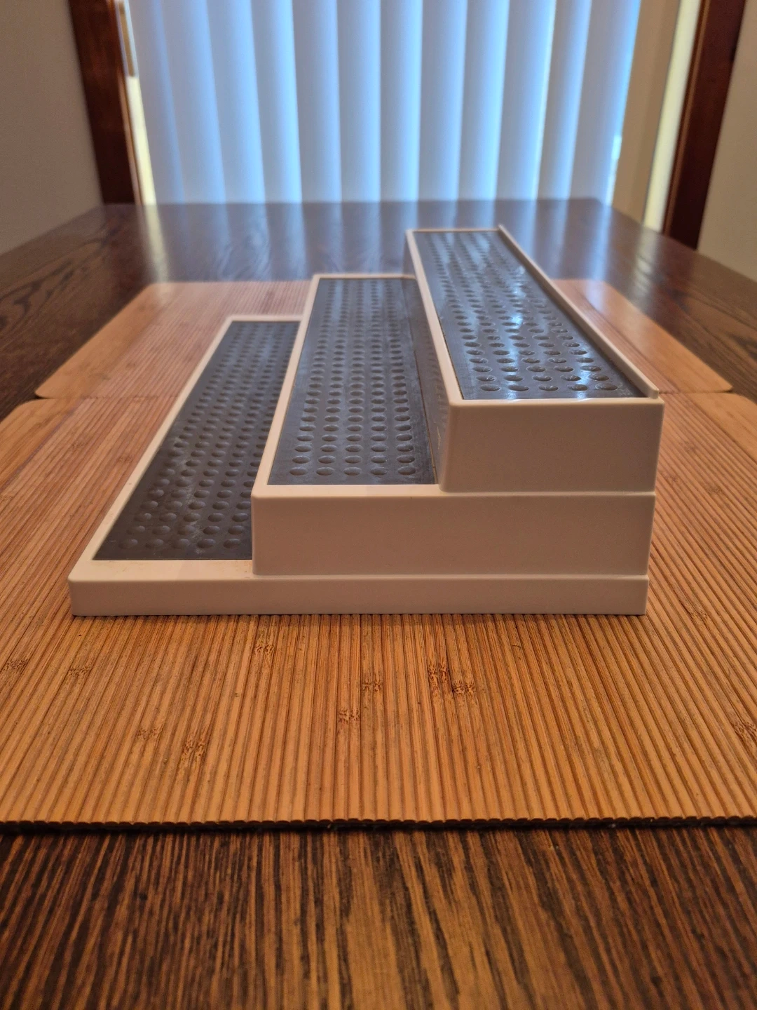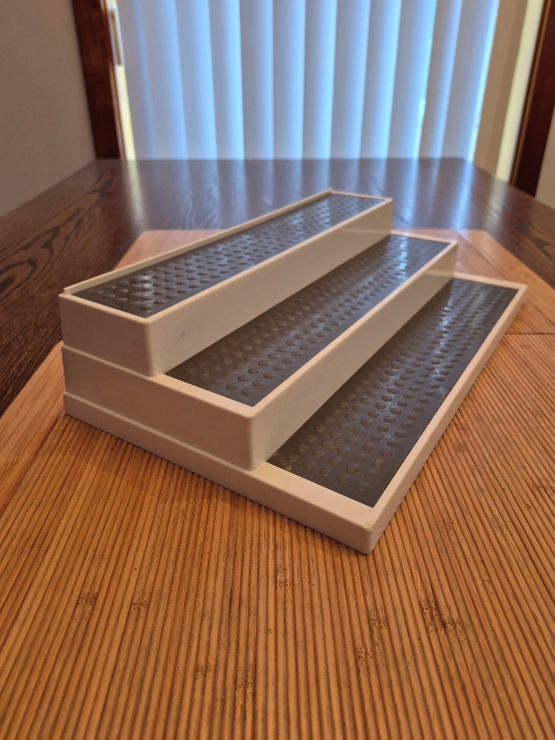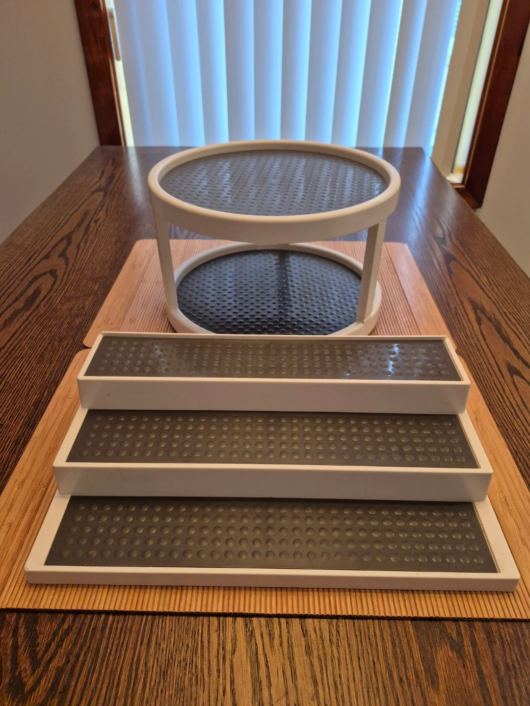 Has 3 levels so that you can see everything behind the 1st row. Very handy for organizing spices inside your kitchen cabinet!