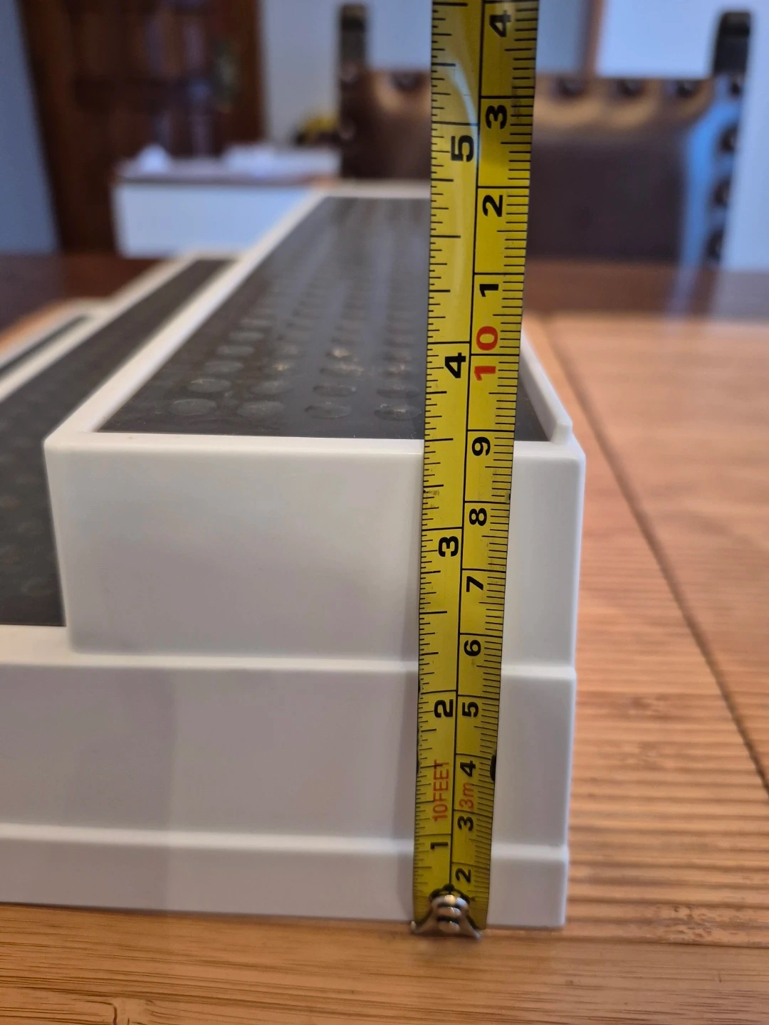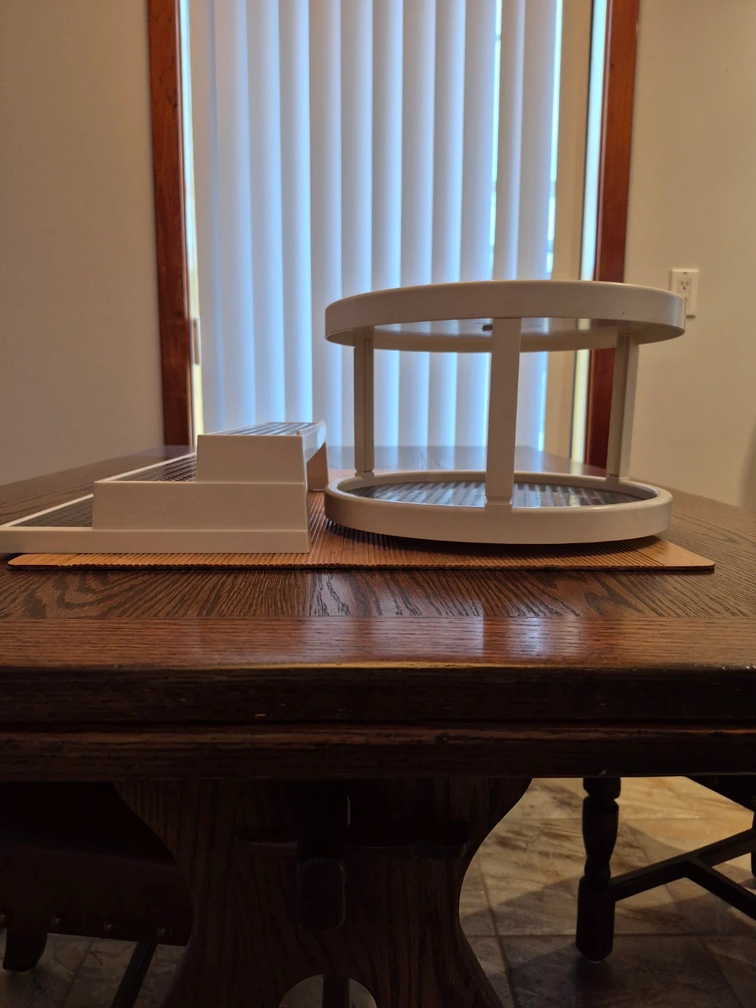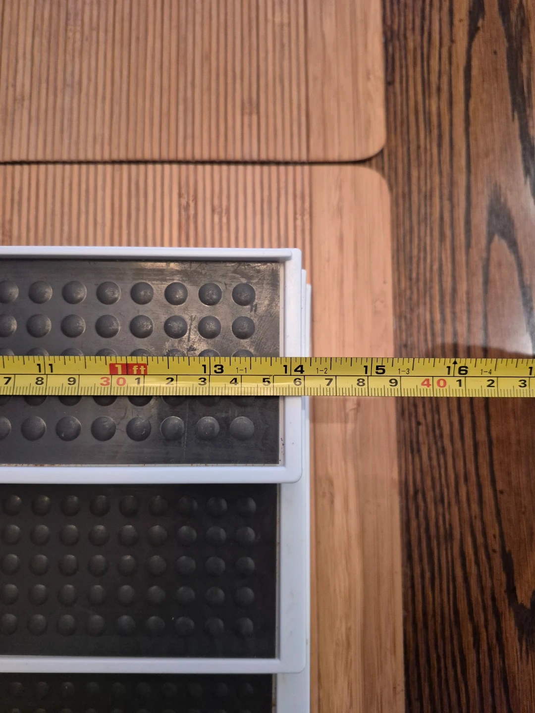 Has 3 levels so that you can see everything behind the 1st row. Very handy for organizing spices inside your kitchen cabinet!