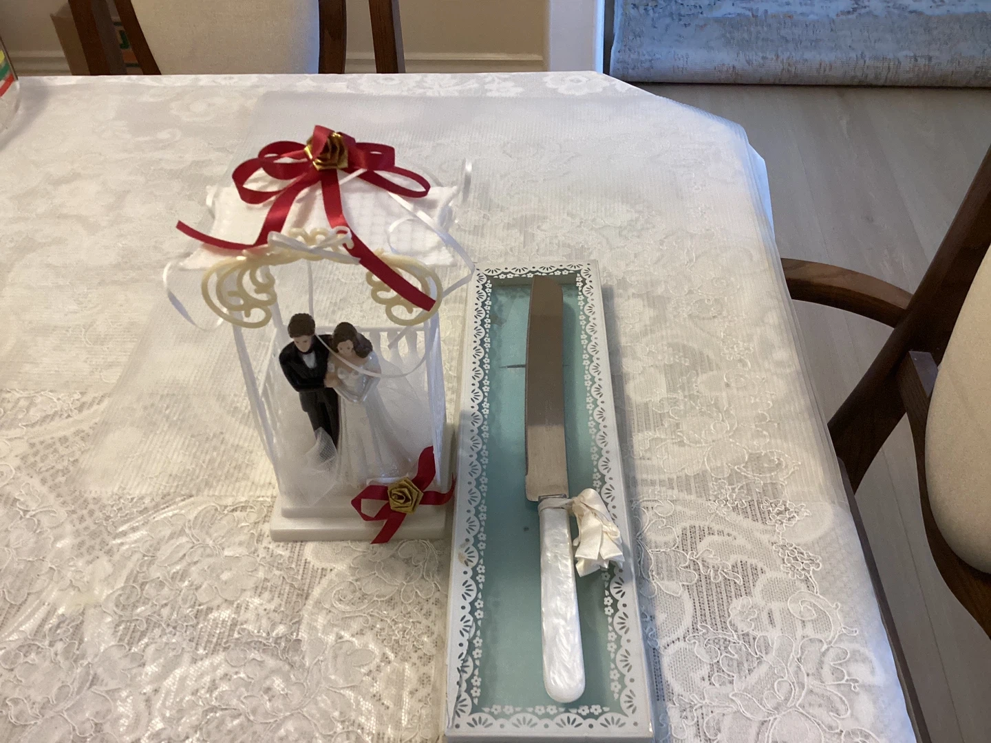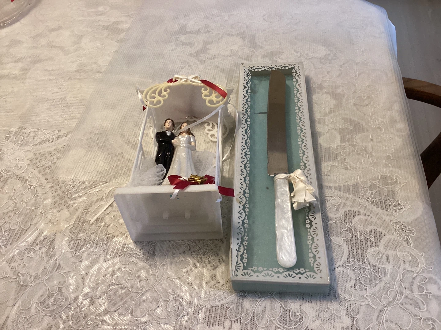 I'm selling a wedding cake topper and knife set, still in its original box! This set is perfect for adding a special touch to your wedding cake. The topper features a bride and groom figurine, and the knife has a beautiful handle. Great for a wedding or anniversary celebration