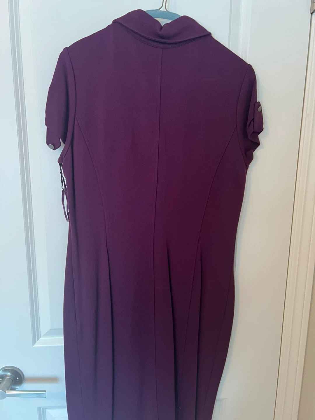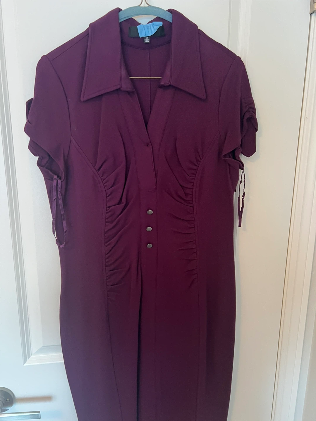 A lovely purple dress! The dress has a unique design with button details and tie accents on the sleeves. It's in great condition and ready for a new owner