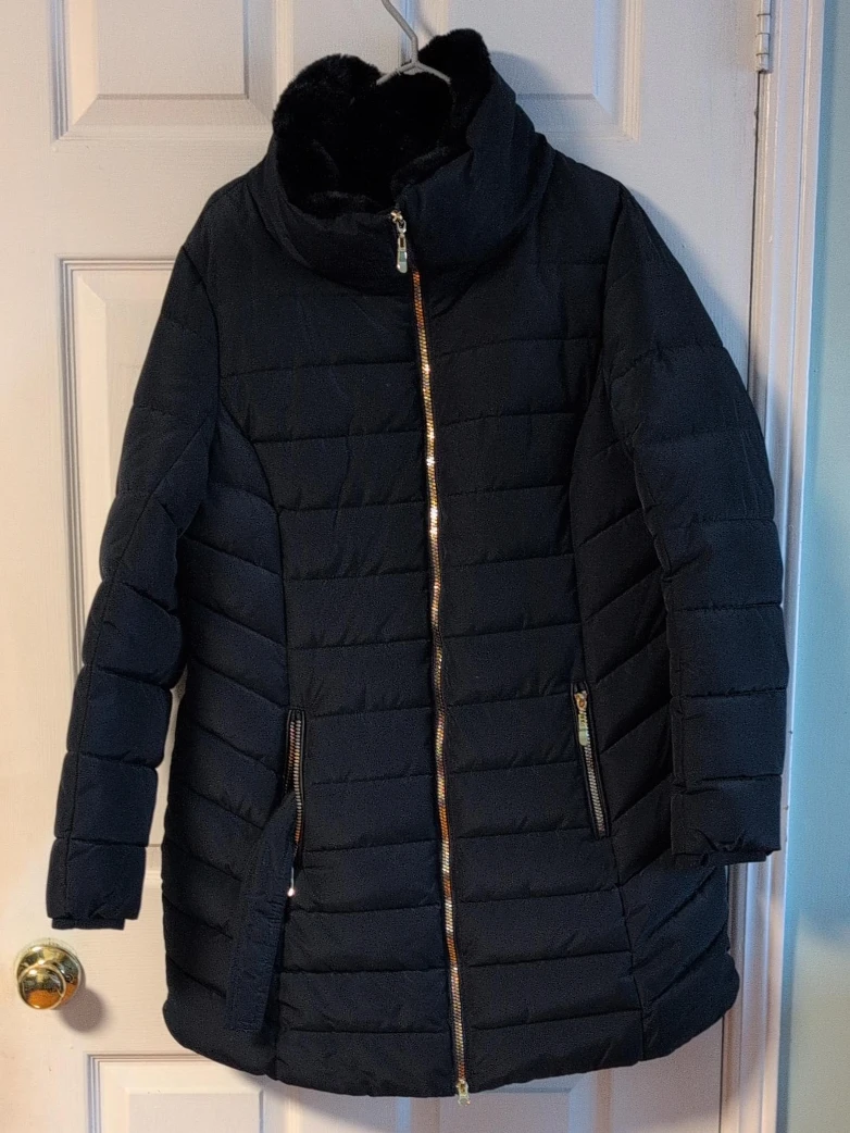 Here's a stylish black puffer coat that's perfect for staying warm! It features a cozy faux fur collar and a sleek design with gold-tone zippers. It's in great condition and ready to be your go-to winter jacket