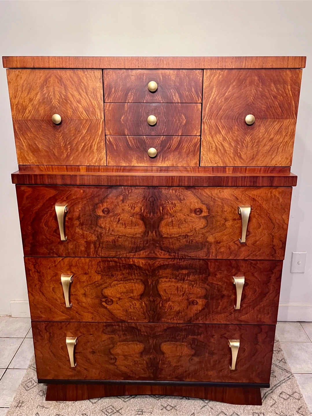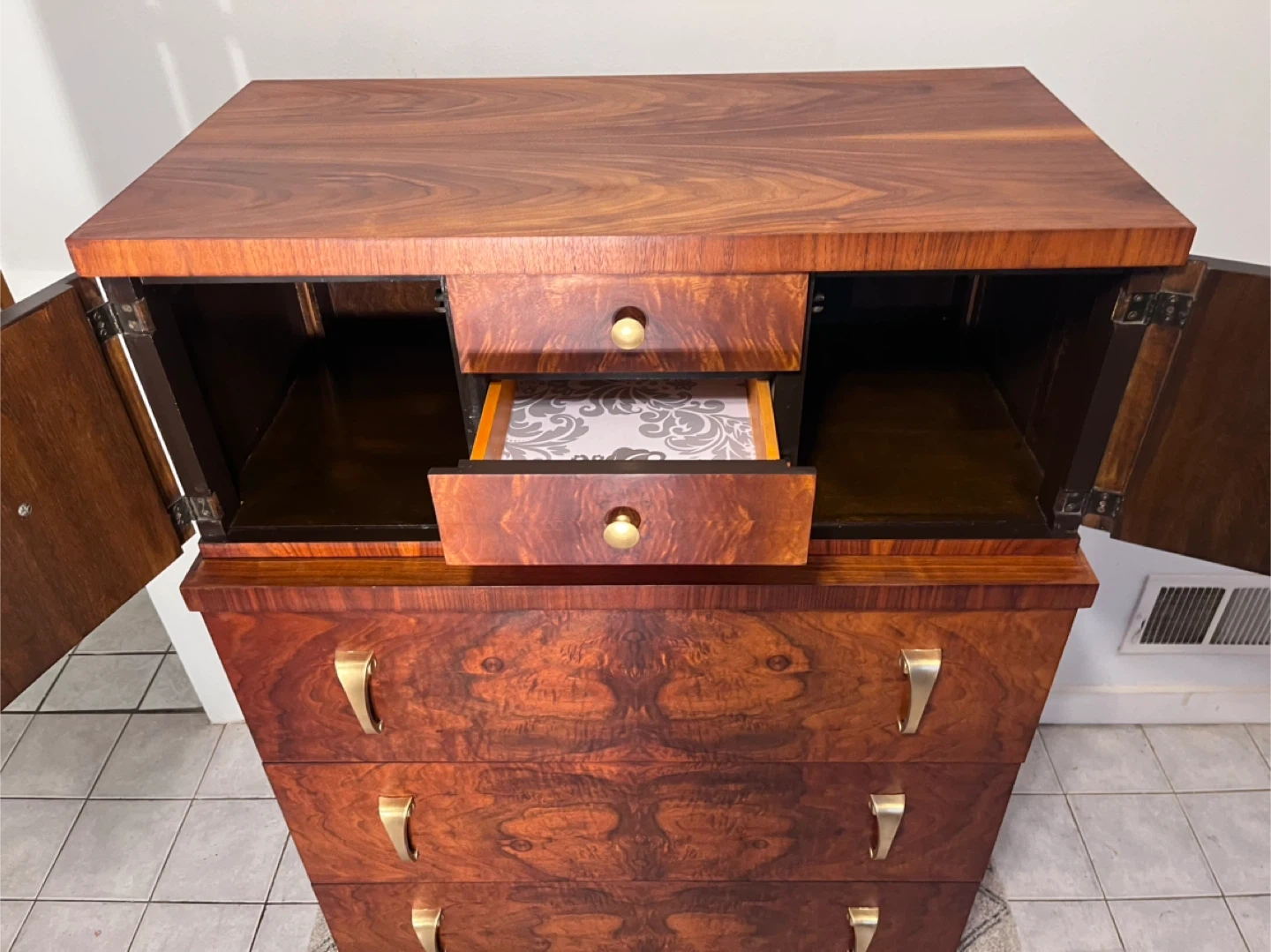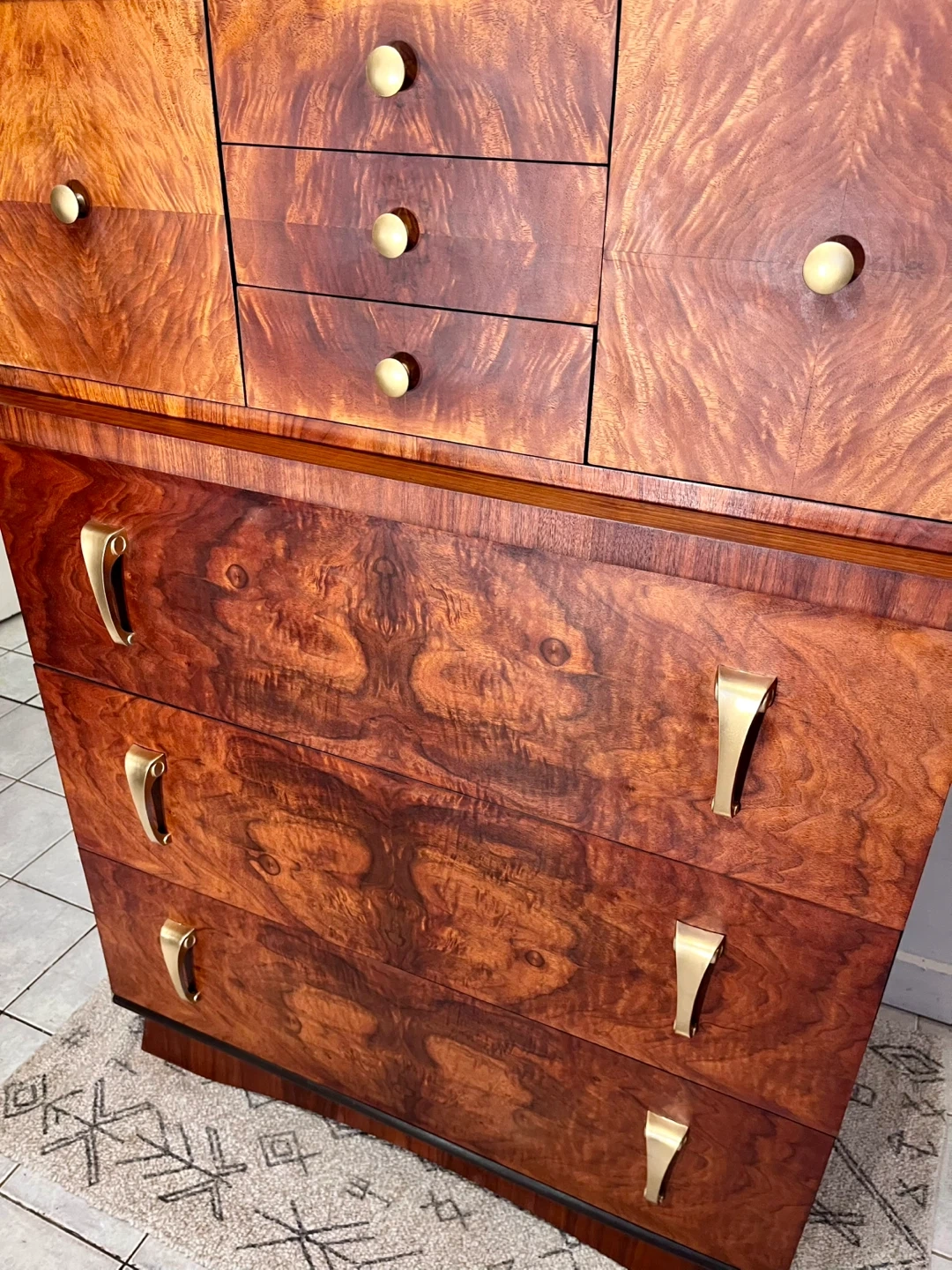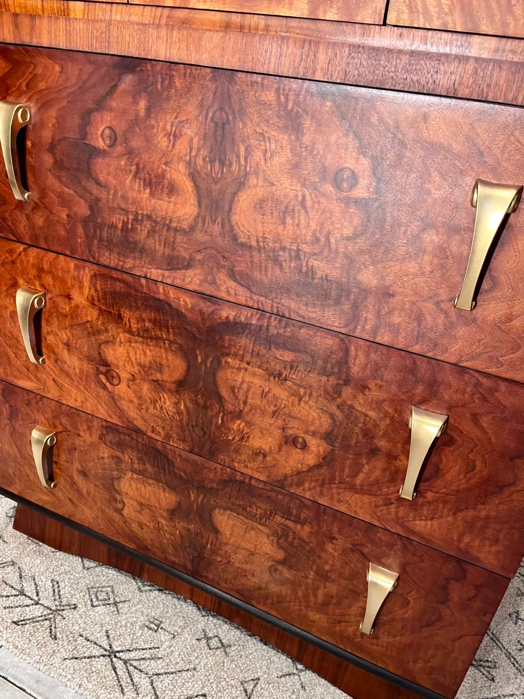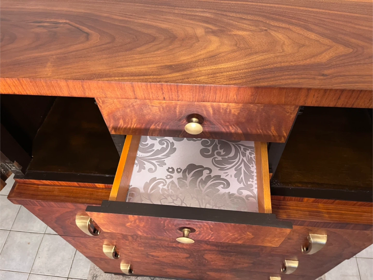 This beauty was painfully & completely restored head to toe, she’s stunning ! Two opening and latching cupboards left and right with a small 3 smooth drawers in between followed by deep lovely set of 3 lined drawers below. Unique timeless vintage design with gorgeous burl walnut fronts.