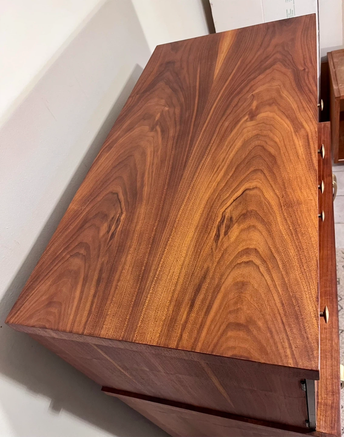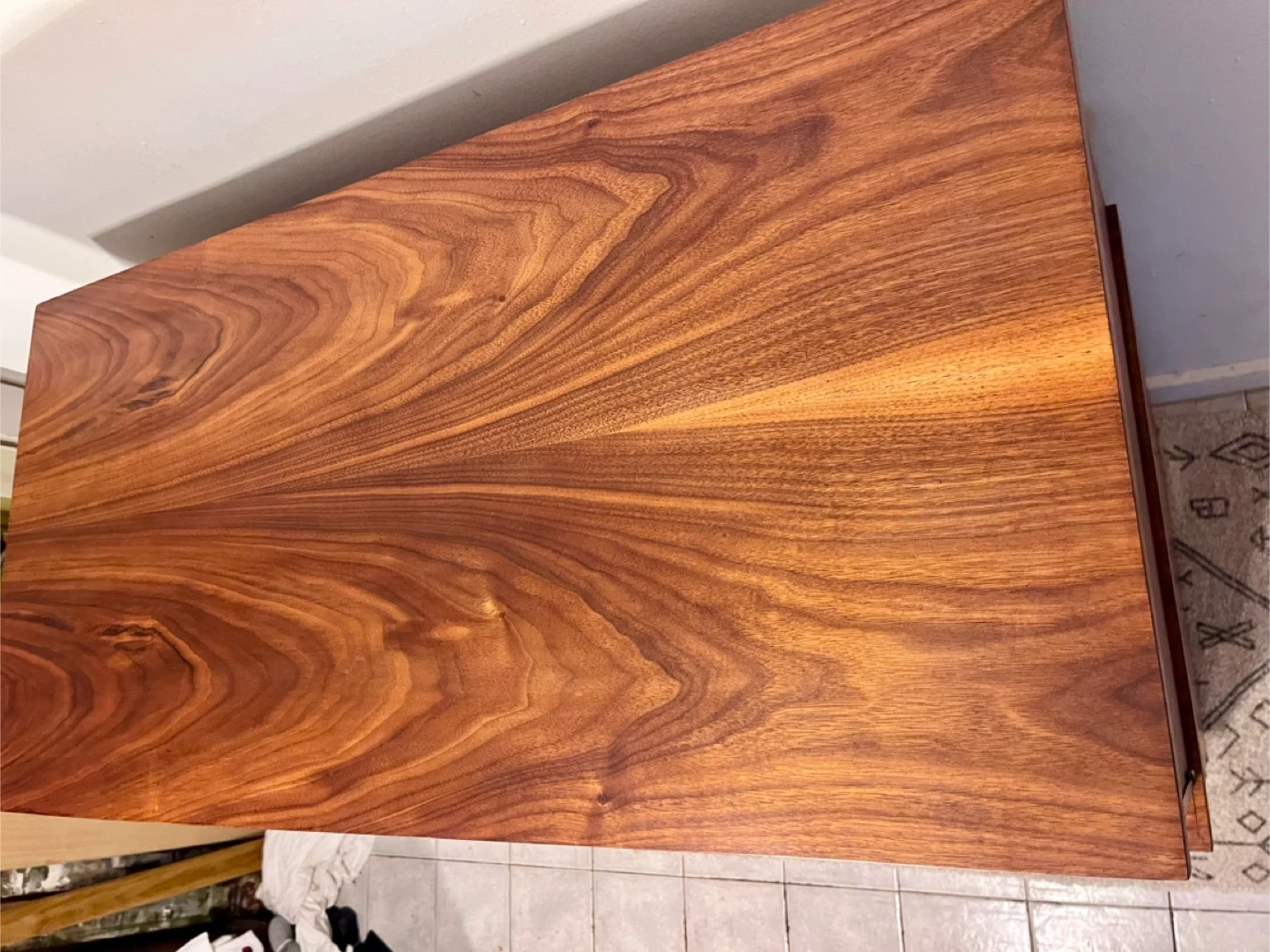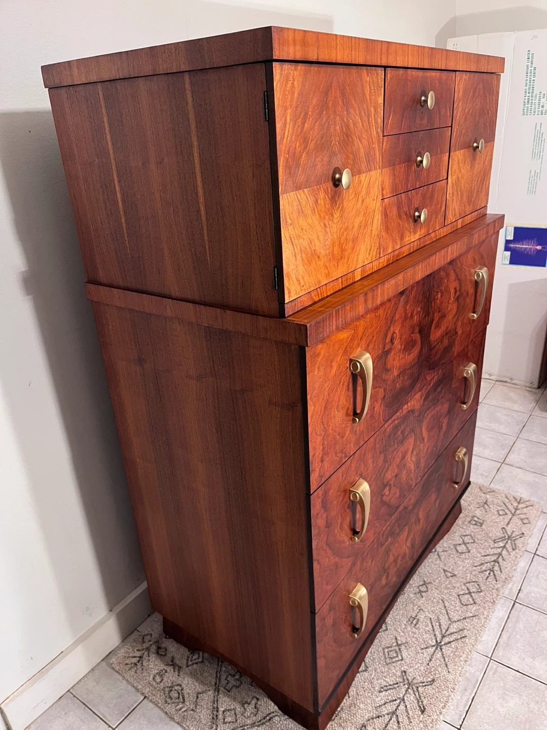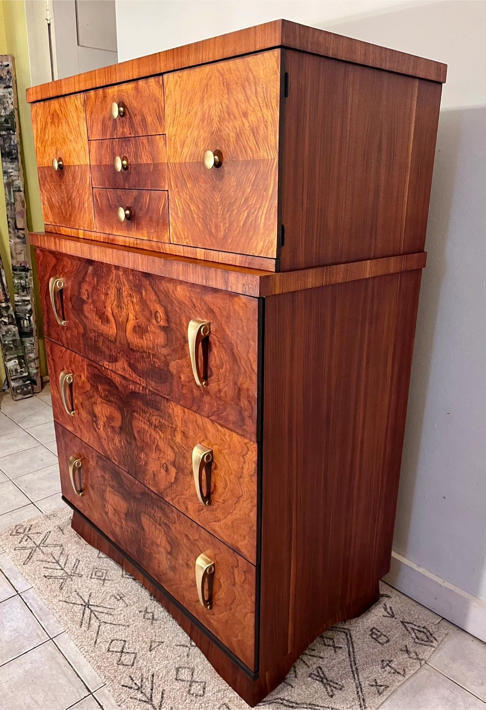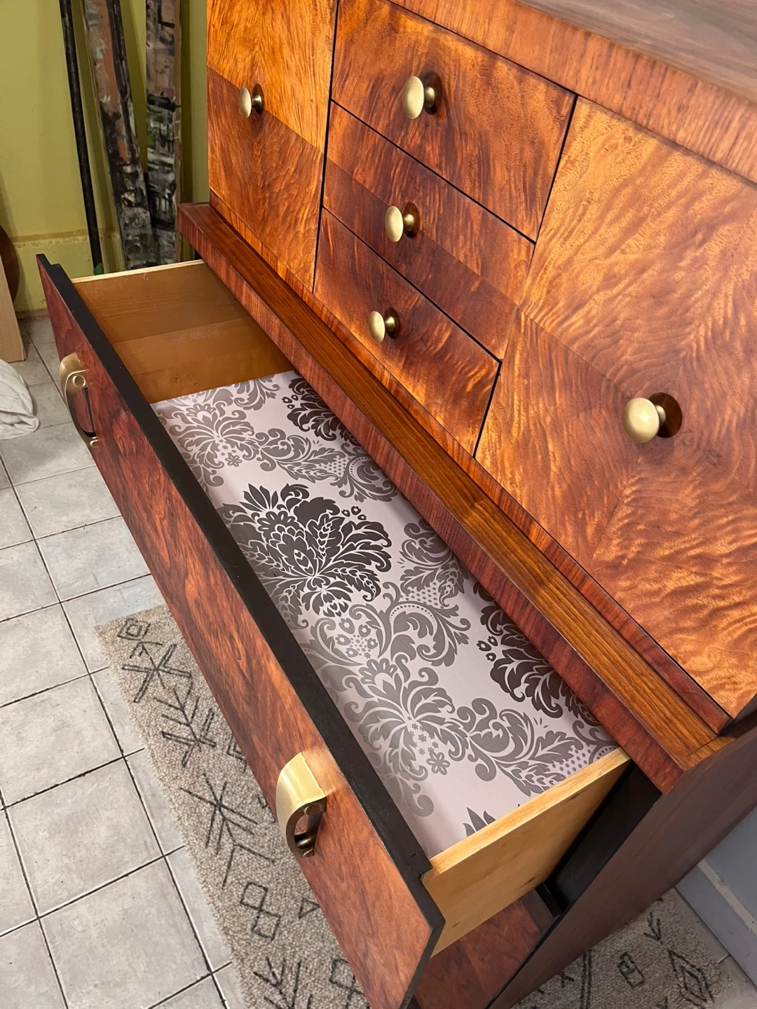 This beauty was painfully & completely restored head to toe, she’s stunning ! Two opening and latching cupboards left and right with a small 3 smooth drawers in between followed by deep lovely set of 3 lined drawers below. Unique timeless vintage design with gorgeous burl walnut fronts.