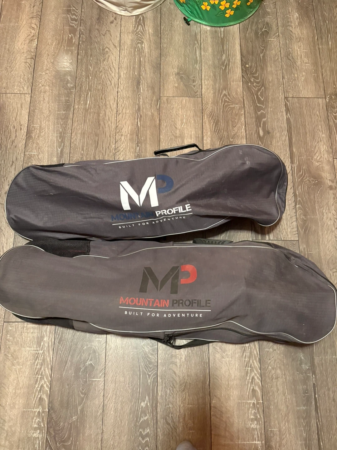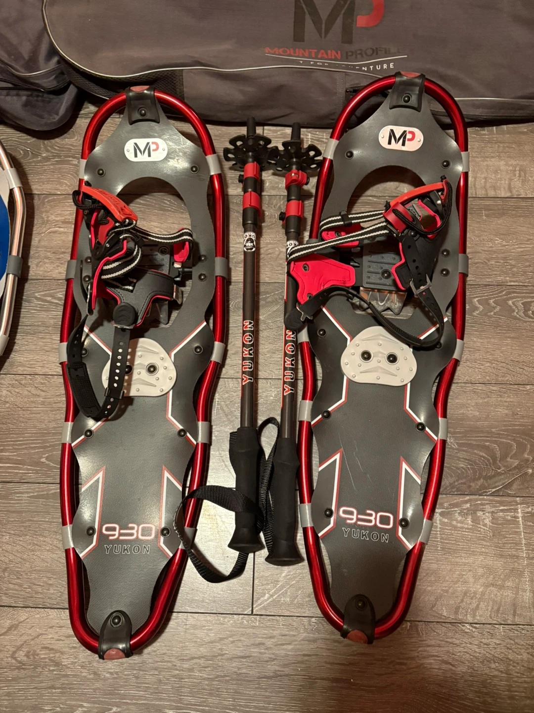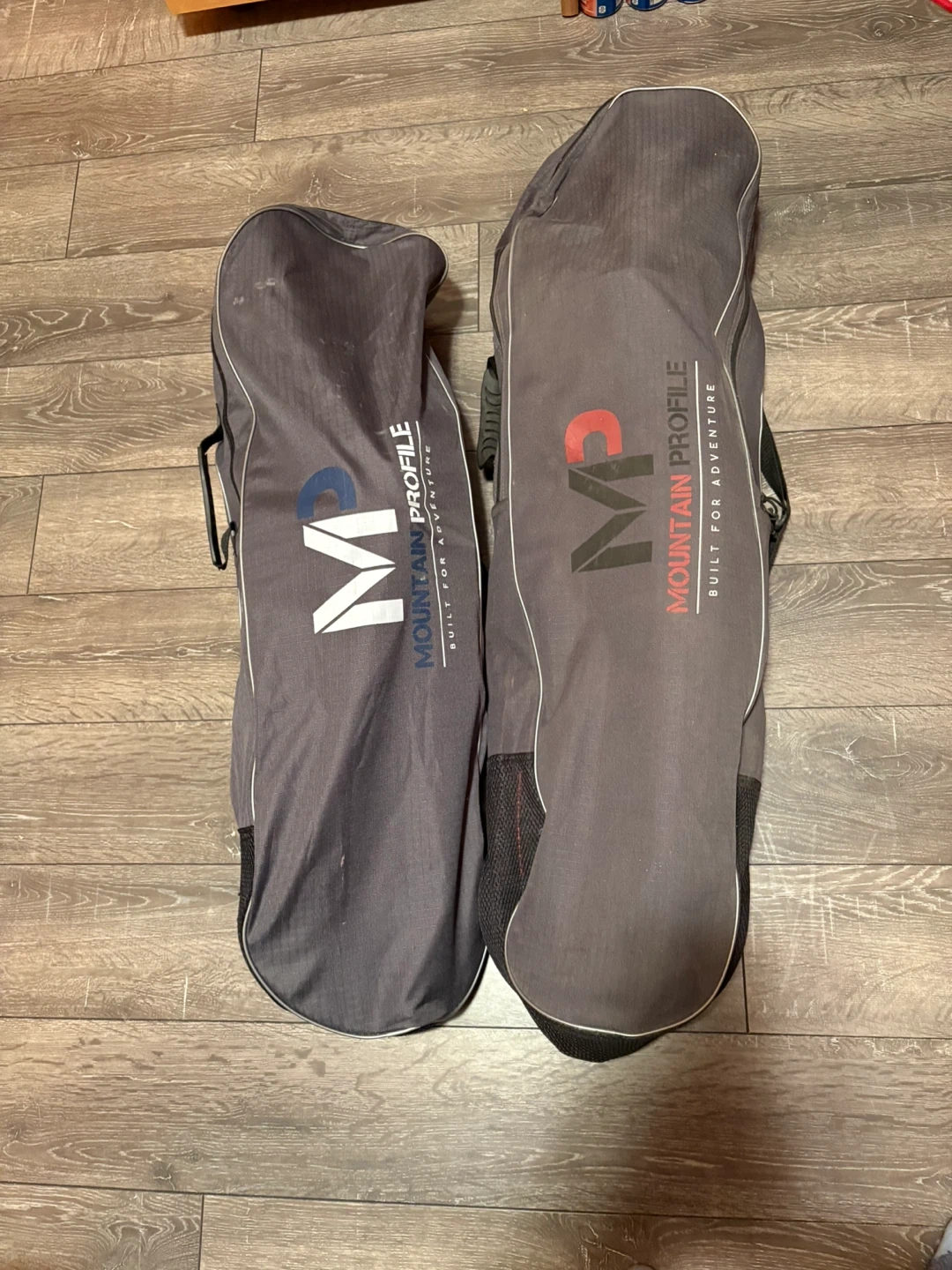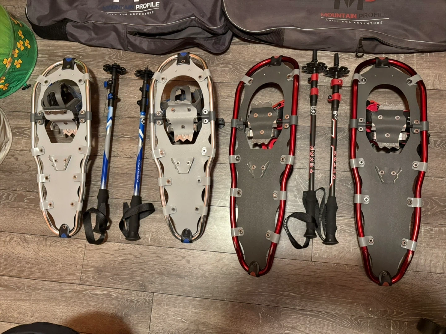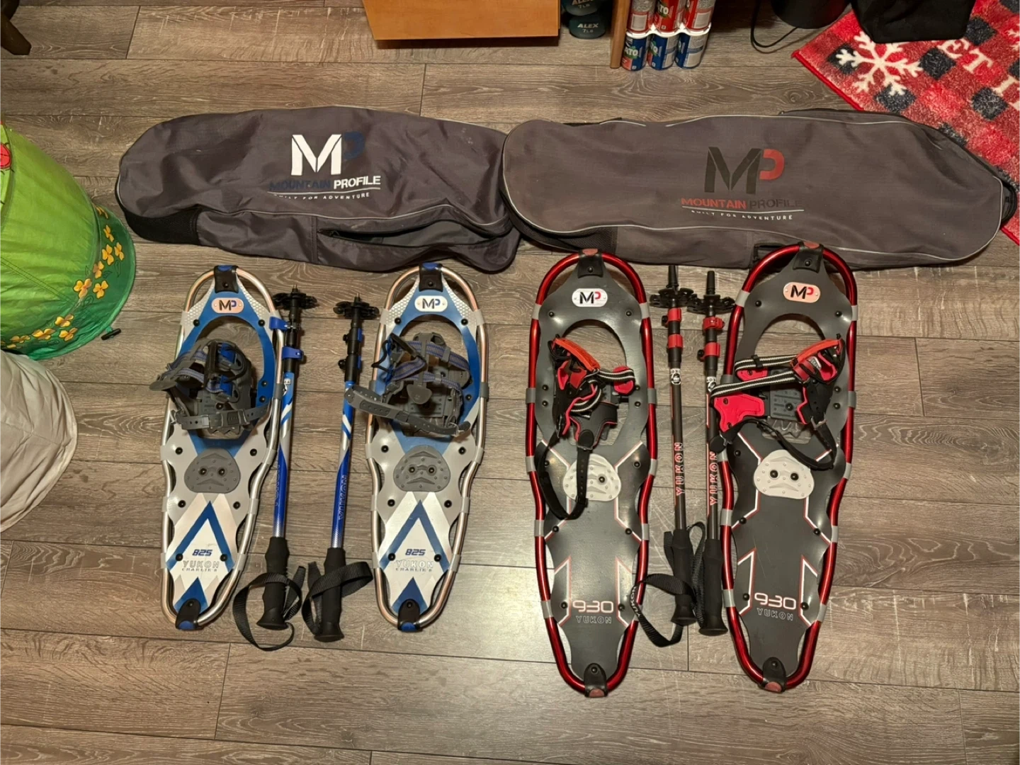 One pair is the Mountain Profile 930 Yukon, in red and black. The other is the Mountain Profile 825 Yukon Charlie's, in blue and white. Both sets come with adjustable poles and a carry bag/backpack for easy transport and storage