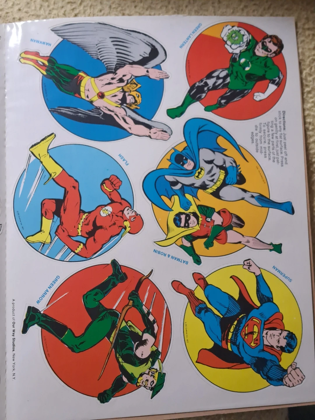 Selling a sheet of vintage DC Comics stickers featuring classic characters like Superman, Batman & Robin, Green Lantern, Green Arrow, Hawkman, and Flash! These stickers are from 1977 and are a product of Our Way Studios, New York, NY. Perfect for any DC Comics fan or collector!
