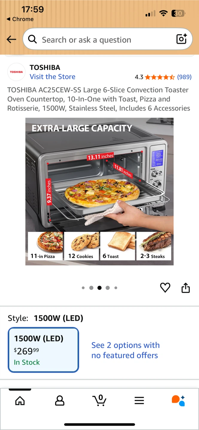 FAMILY-SIZED CAPACITY: With a Larger interior, this oven can fit up to 6 slices of bread, an 11" pizza, casseroles, cookies, and up to a 4-pound chicken. External Dimensions are approximately 18. 98" X 15. 59" X 10. 78".