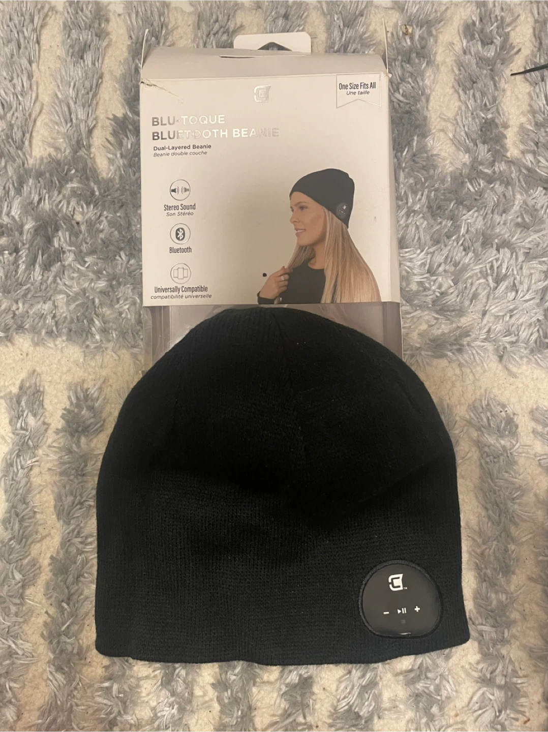 Selling a brand new Blu-Toque Bluetooth Beanie, still in its original box! This dual-layered beanie features stereo sound and Bluetooth connectivity. It's universally compatible and a one-size-fits-all item. Perfect for listening to music and answering calls on the go!