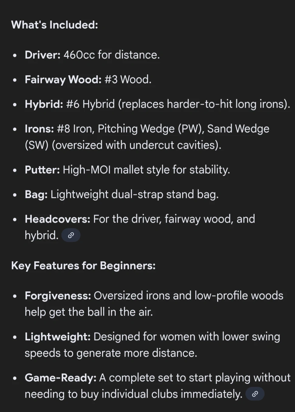 Starter set includes a Driver, 3 Wood, 6 Hybrid, 8 Iron, Pitching Wedge (PW), Sand Wedge (SW), and a Putter, along with a stand bag and 3 headcovers. See attached screenshots for kore descriptions. I have photos of individual clubs as well if you are interested to see them before purchasing just DM me.