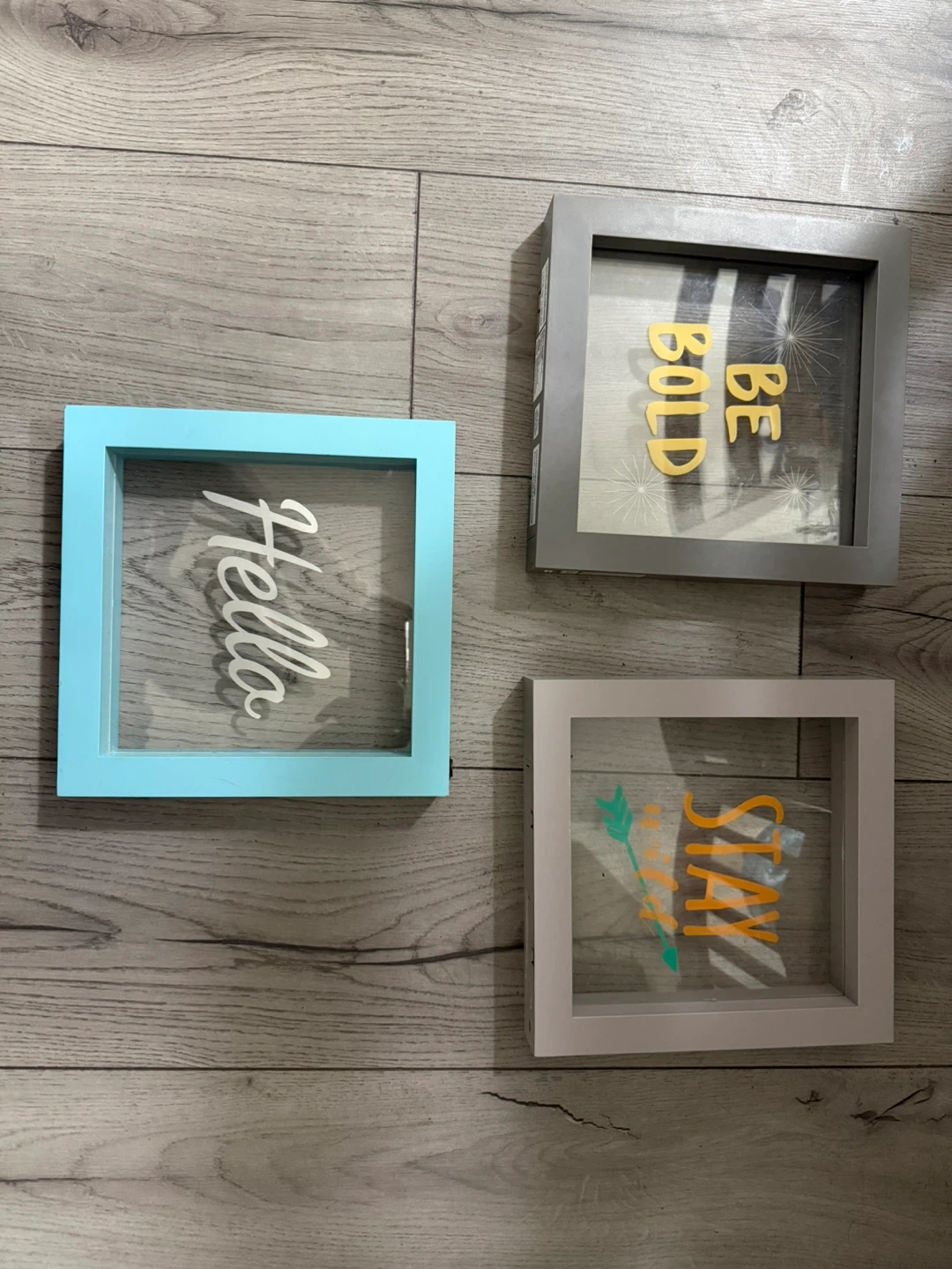 Selling a set of three shadow box frames! They each have different designs: "Stay Wild", "Hello", and "Be Bold". They would be perfect for adding a touch of personality to any room in your home