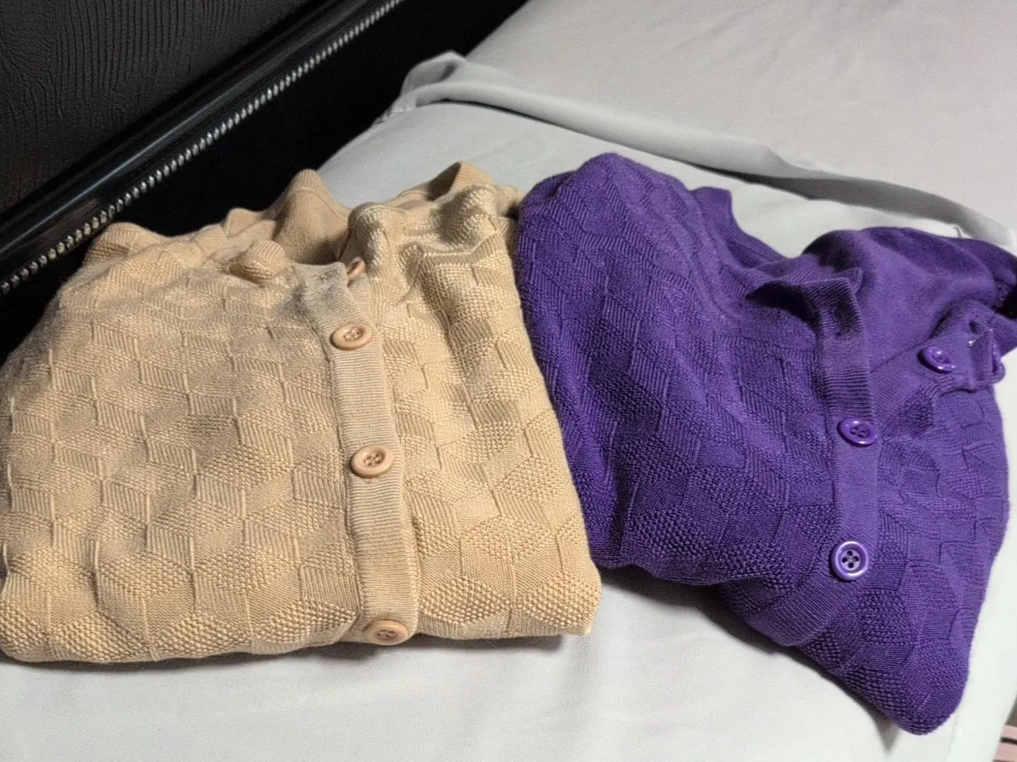 Two cute cardigans, one beige and one purple! They have a nice textured pattern and button-up closures. Great for layering or wearing on their own