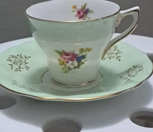Selling a beautiful vintage teacup and saucer. It features a delicate floral design and a lovely light green colour with gold trim. Perfect for collectors or anyone who enjoys a touch of elegance with their tea!