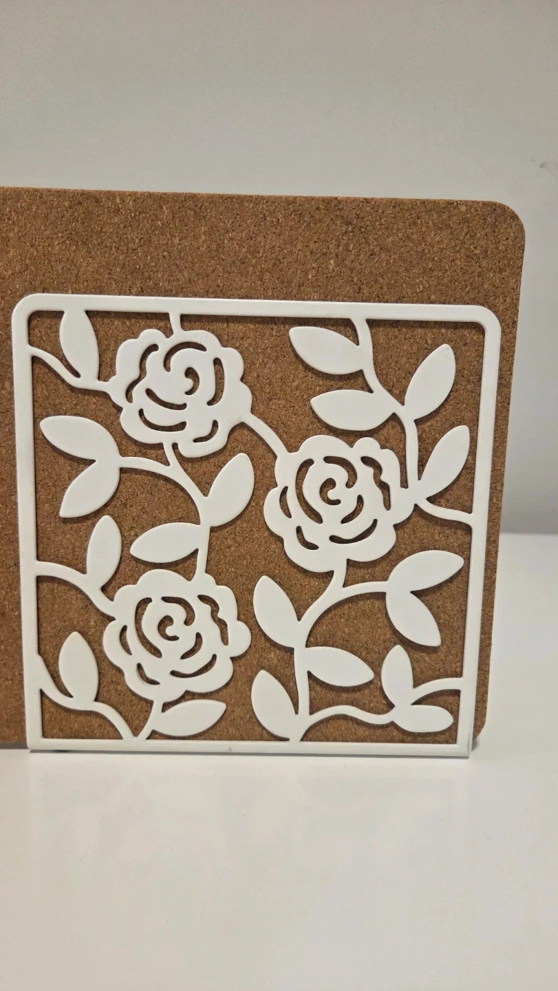 Here's a cute white metal napkin holder with a floral design! It's perfect for adding a touch of elegance to your table setting. In great condition and ready to hold your napkins in style