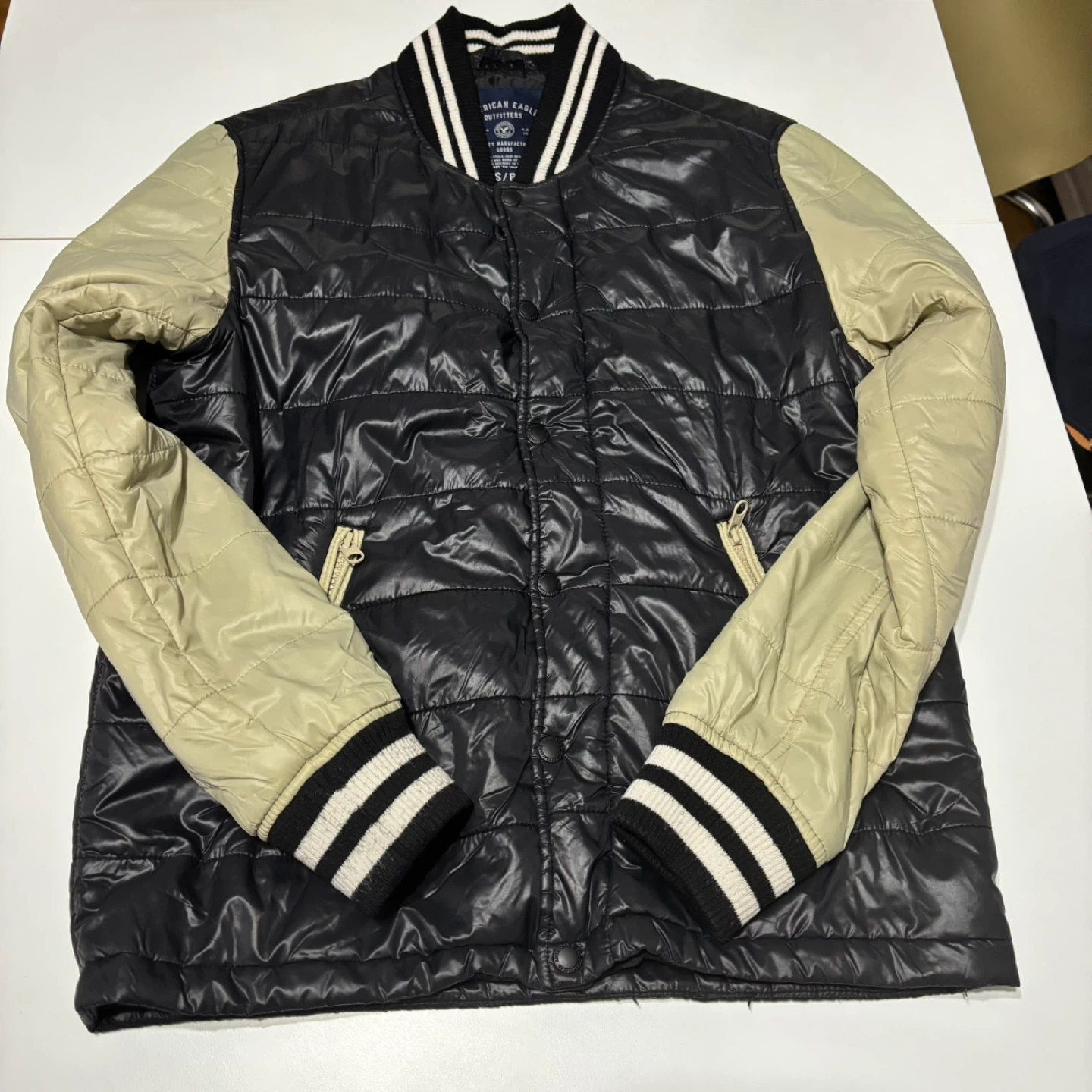 Here's a stylish bomber jacket from American Eagle Outfitters! It's a size small and features a classic design with black and beige colours. Perfect for adding a bit of flair to any outfit!