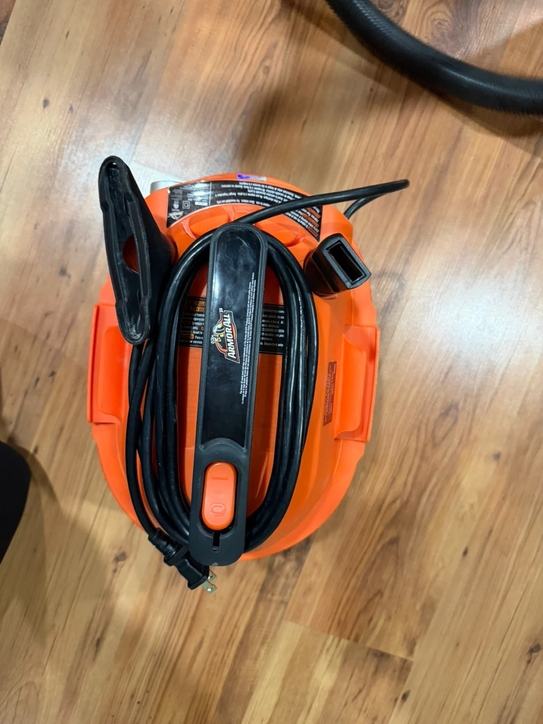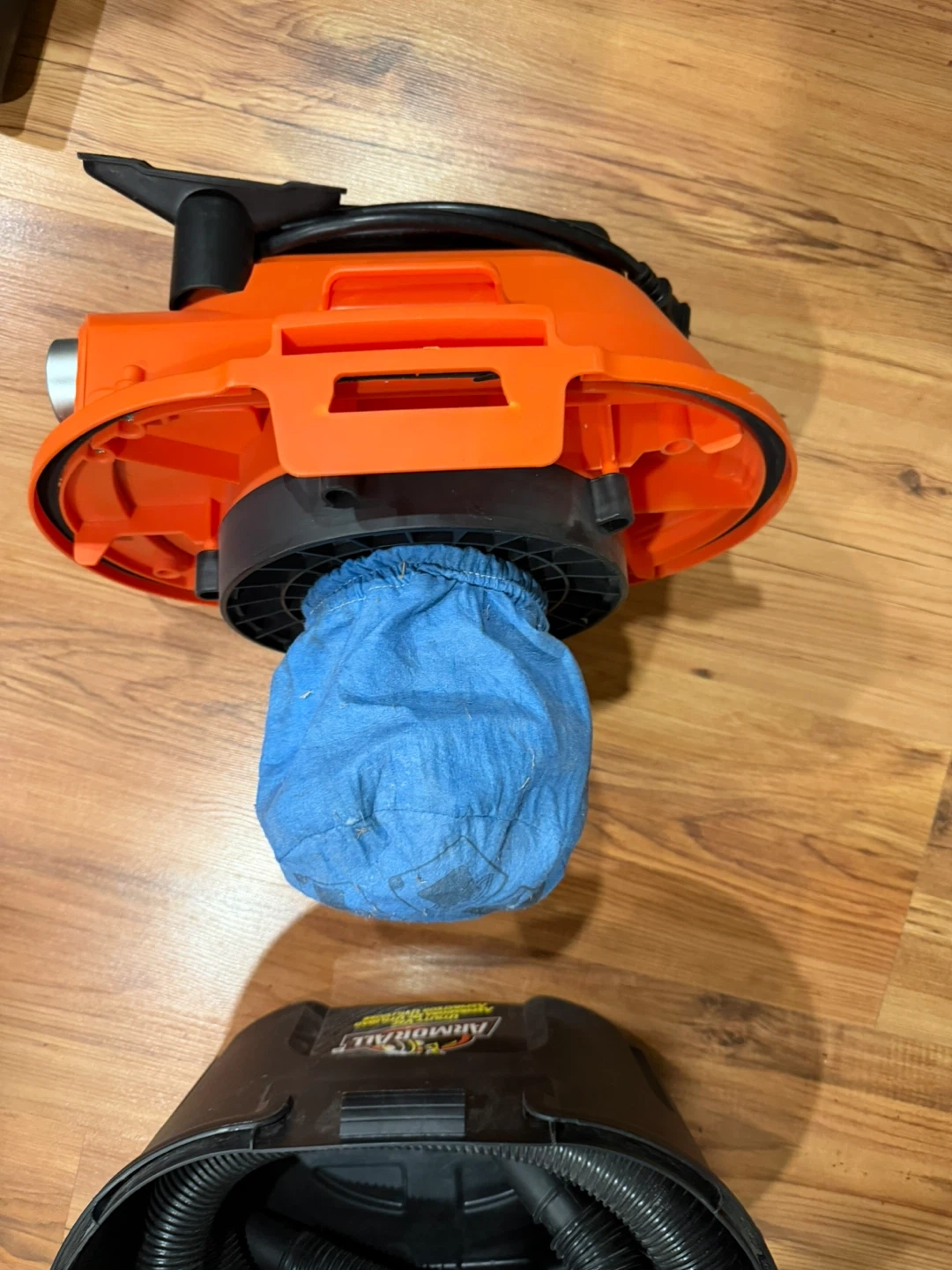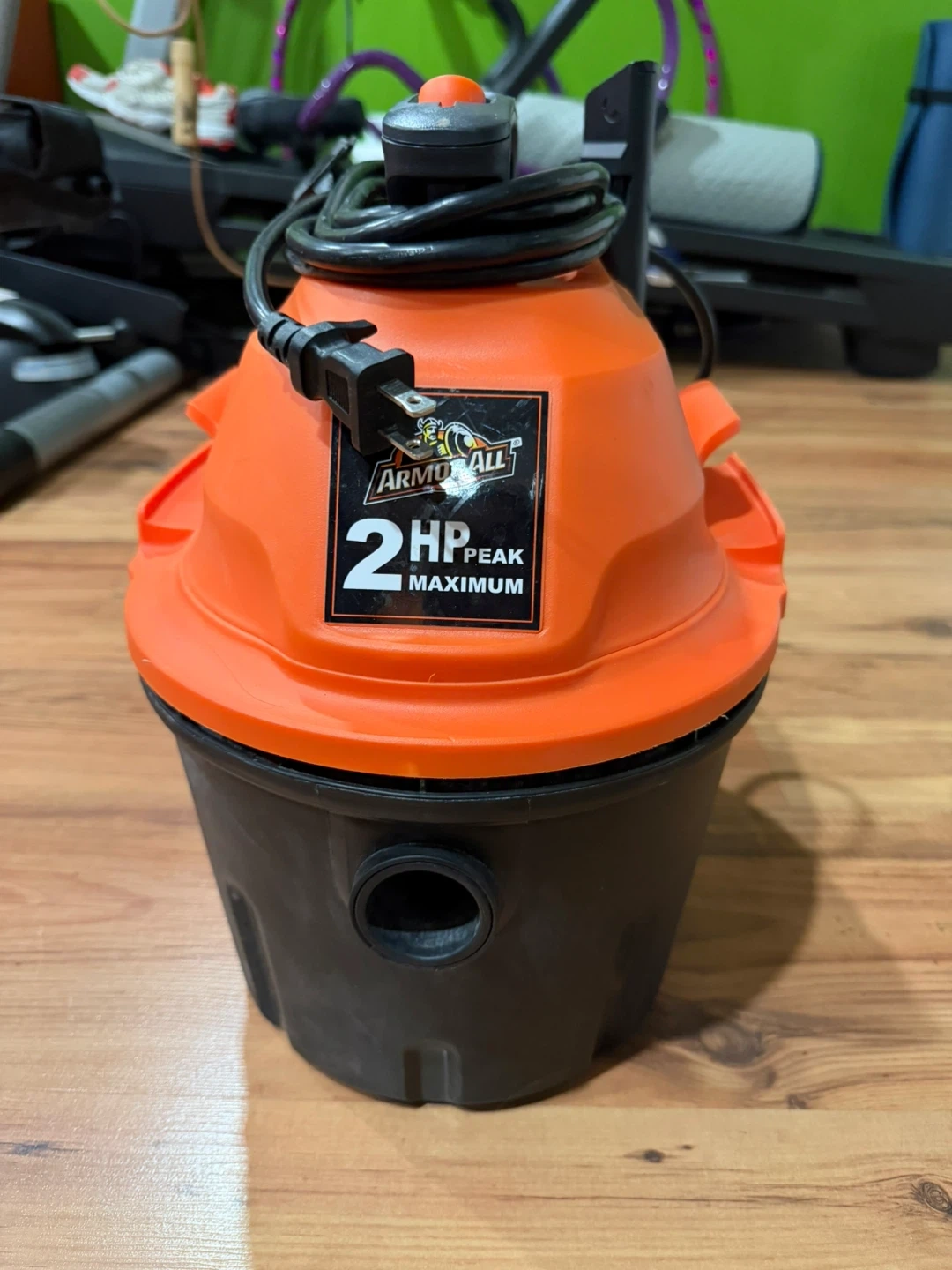 Selling an Armor All utility wet/dry vac. It has a 2.0 HP peak maximum. It comes with a hose and a blue filter bag.