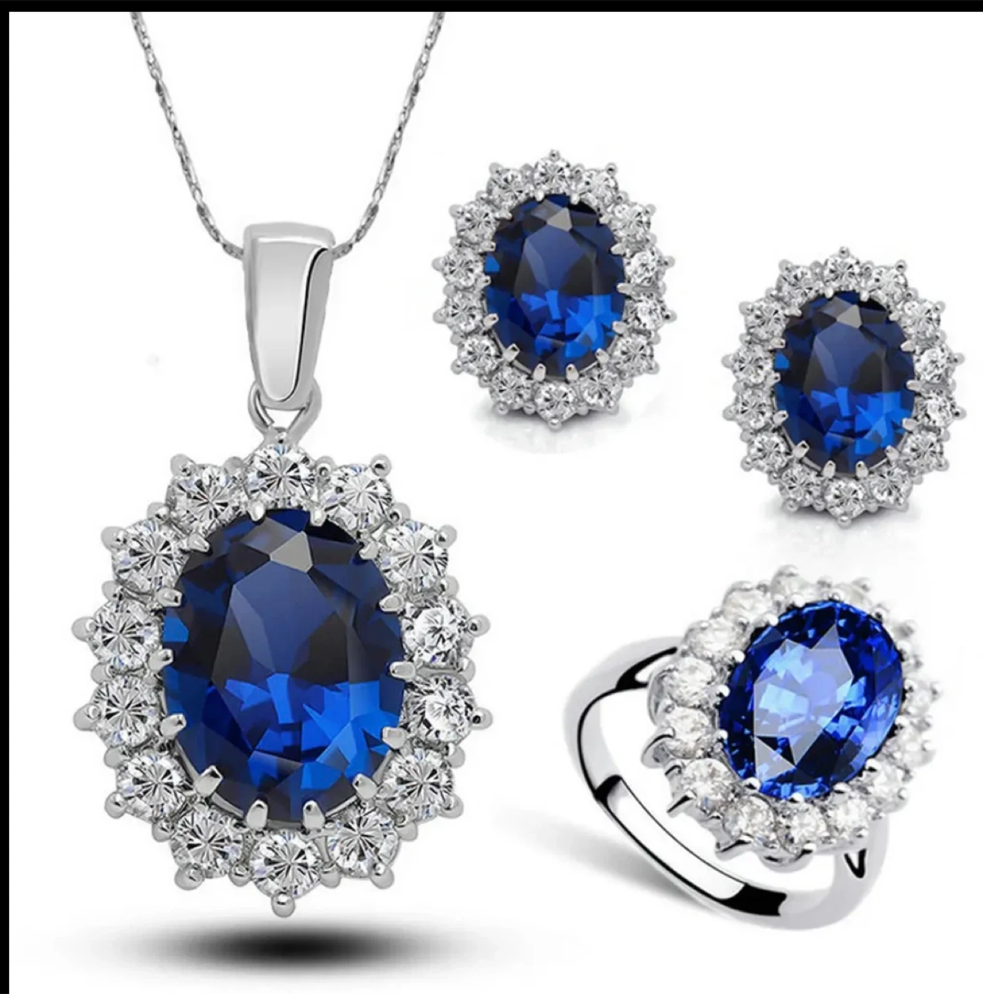 GB 2019 British princess diana prince william kate blue gem Ring necklace Earrings Three pieces Jewelry set Royal