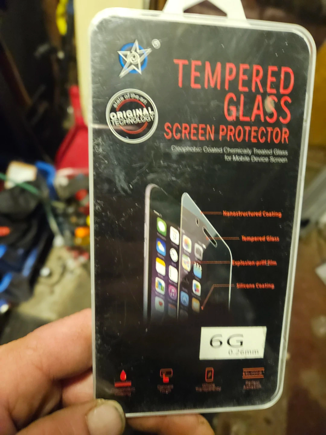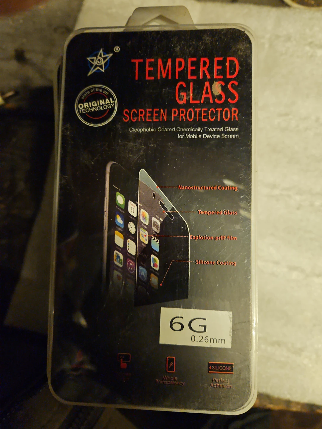 Selling a tempered glass screen protector for a 6G phone. It features cleophobic coated chemically treated glass for mobile device screens.