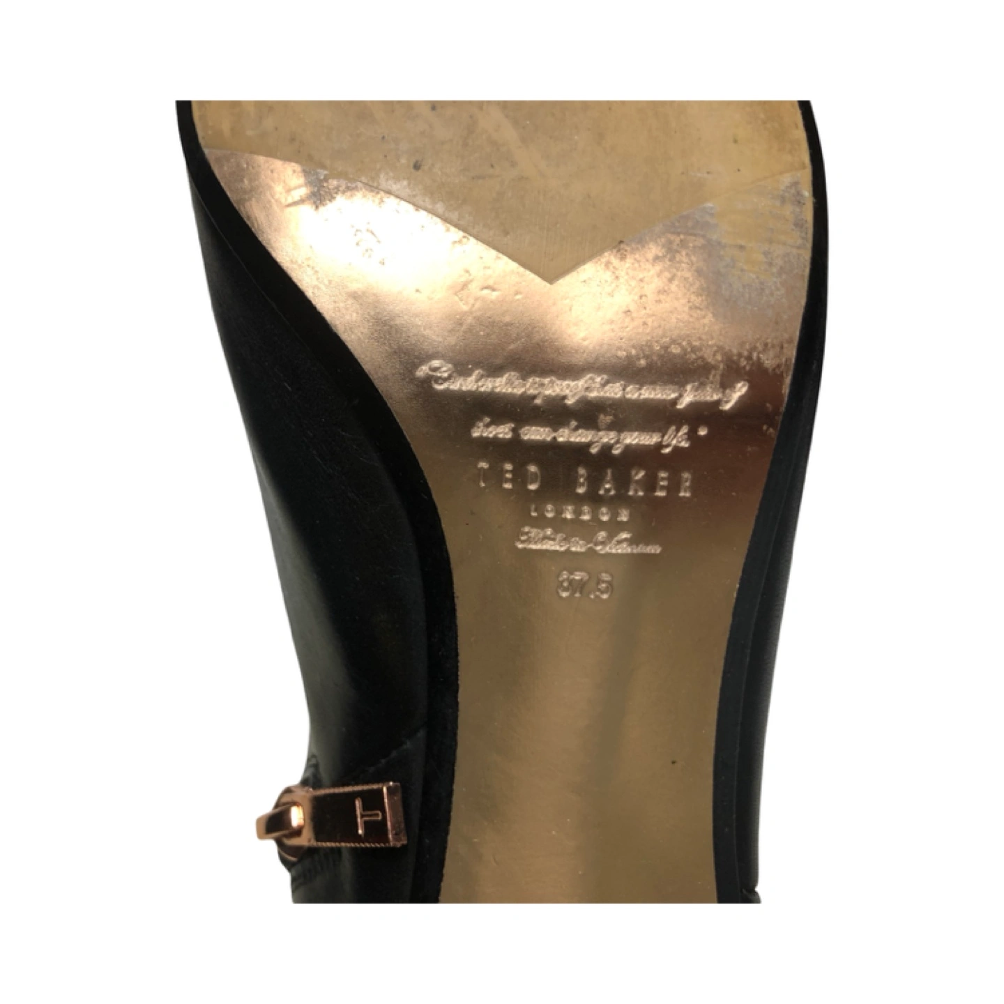 Selling a pair of Ted Baker “Amaedi” kitten heel ankle boots in black leather. These stylish boots feature a pointed toe with a metallic accent and a small heel. They have a zipper closure and a signature Ted Baker bow detail at the back.