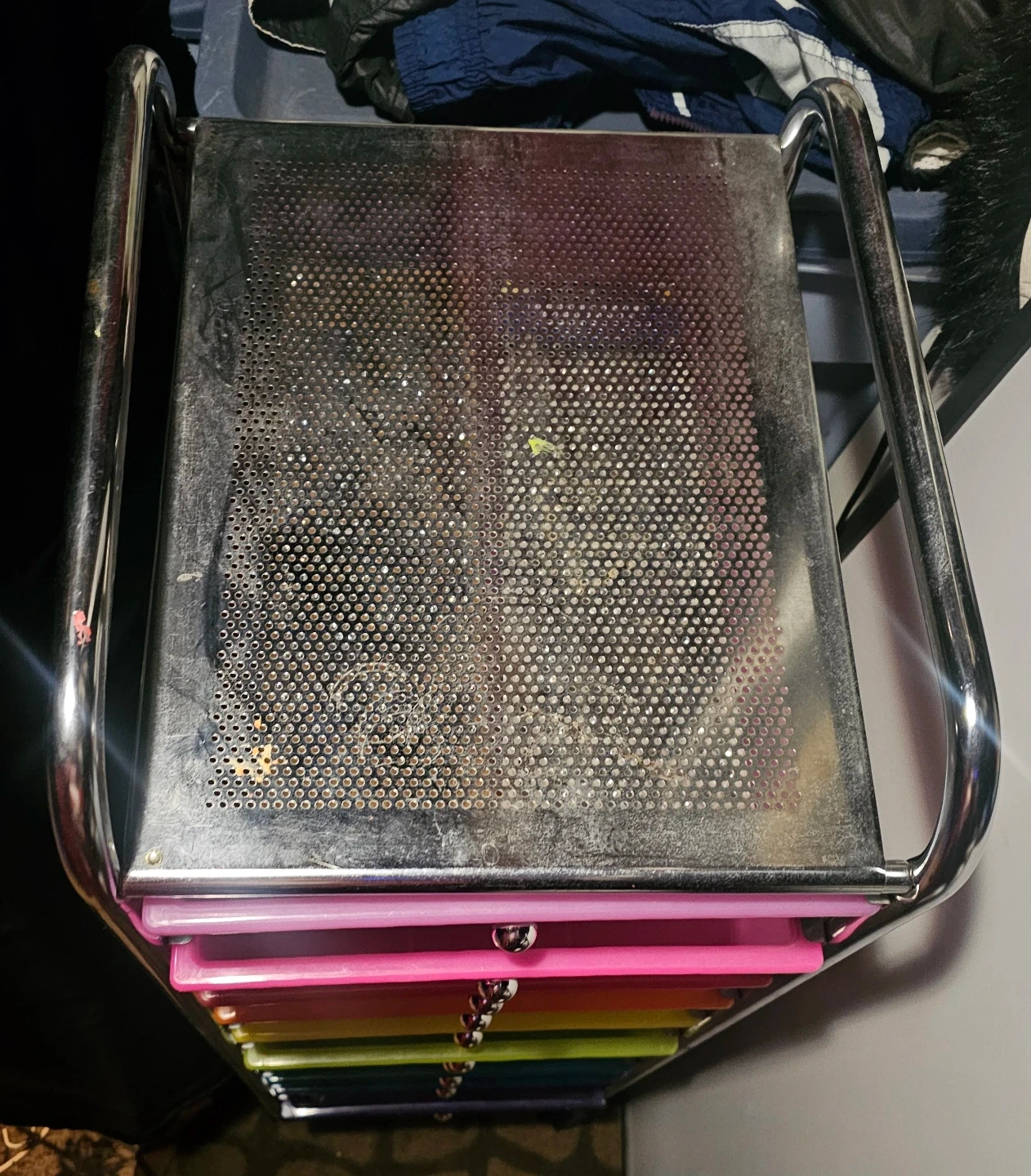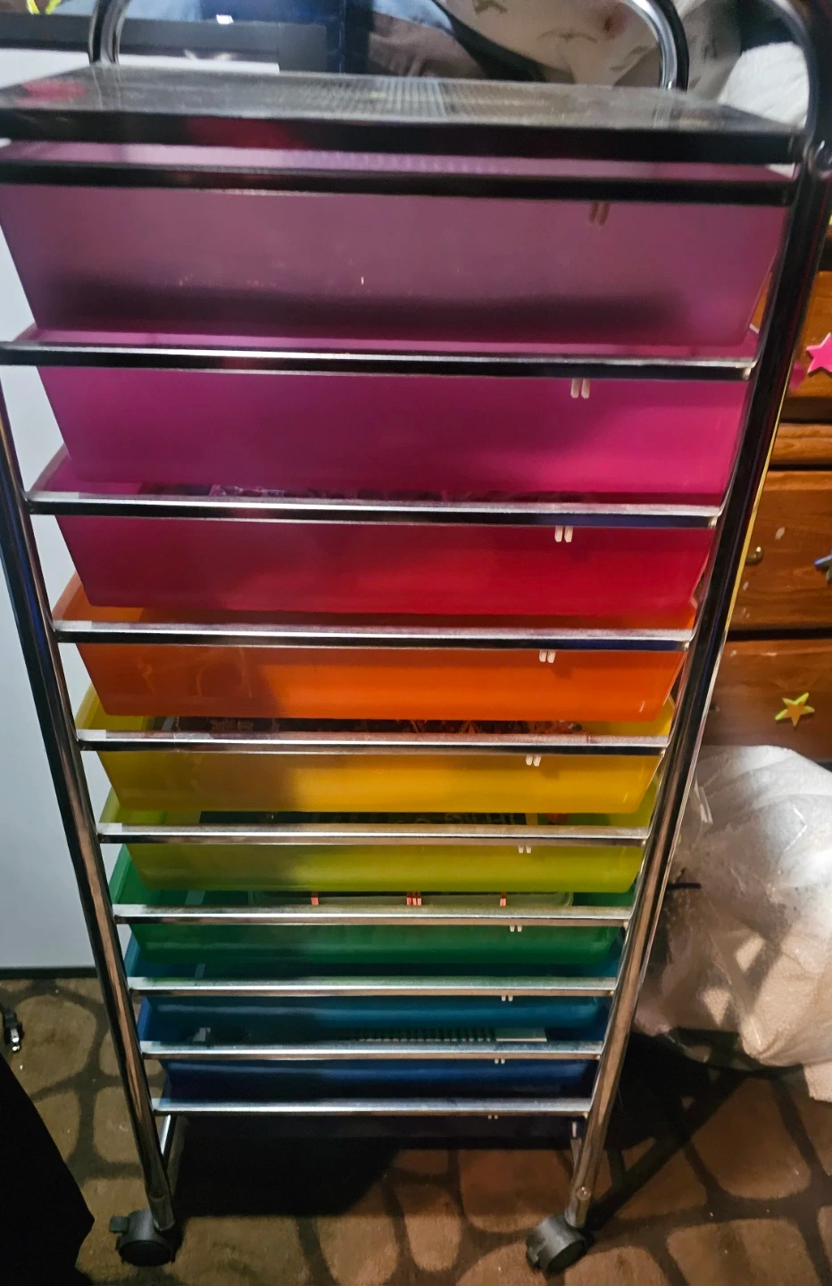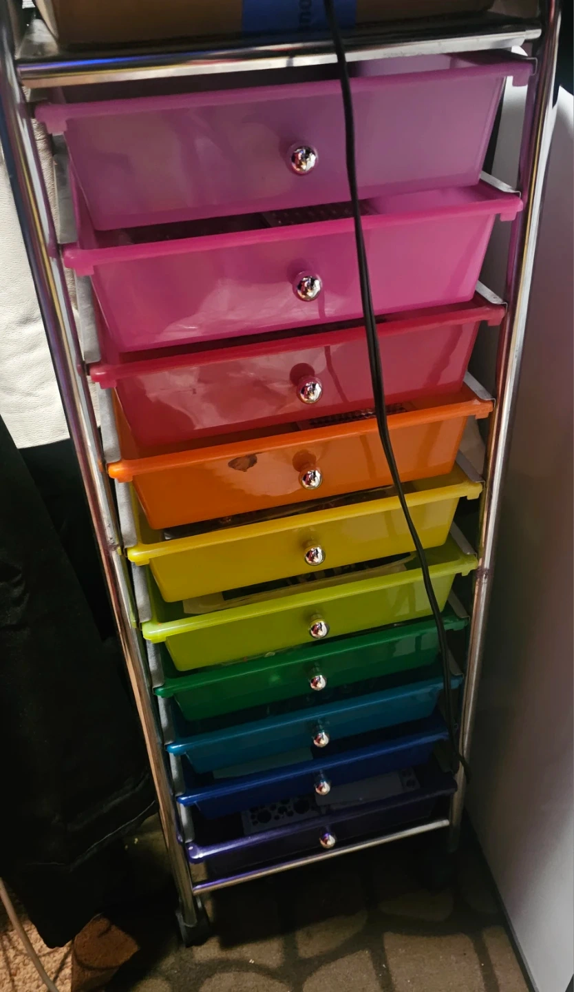 Selling a rolling cart with rainbow-coloured drawers! It's perfect for storing art supplies, toys, or anything else you need to keep organized. The drawers are all in great shape and the cart rolls smoothly. Great for a craft room or kids room!