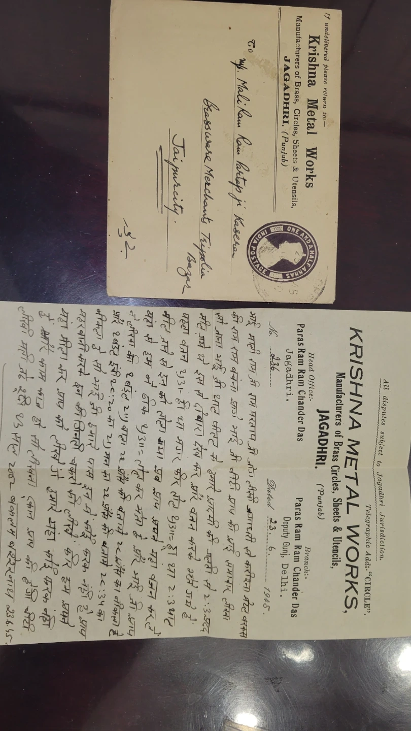 Here's a vintage letter from Krishna Metal Works, manufacturers of brass circles, sheets, and utensils from Jagadhri, Punjab. The letter is dated June 23, 1945, and includes correspondence regarding weights and measures. It's addressed to Mali Ram Ram Partap ji Kasera in Jaipurcity.