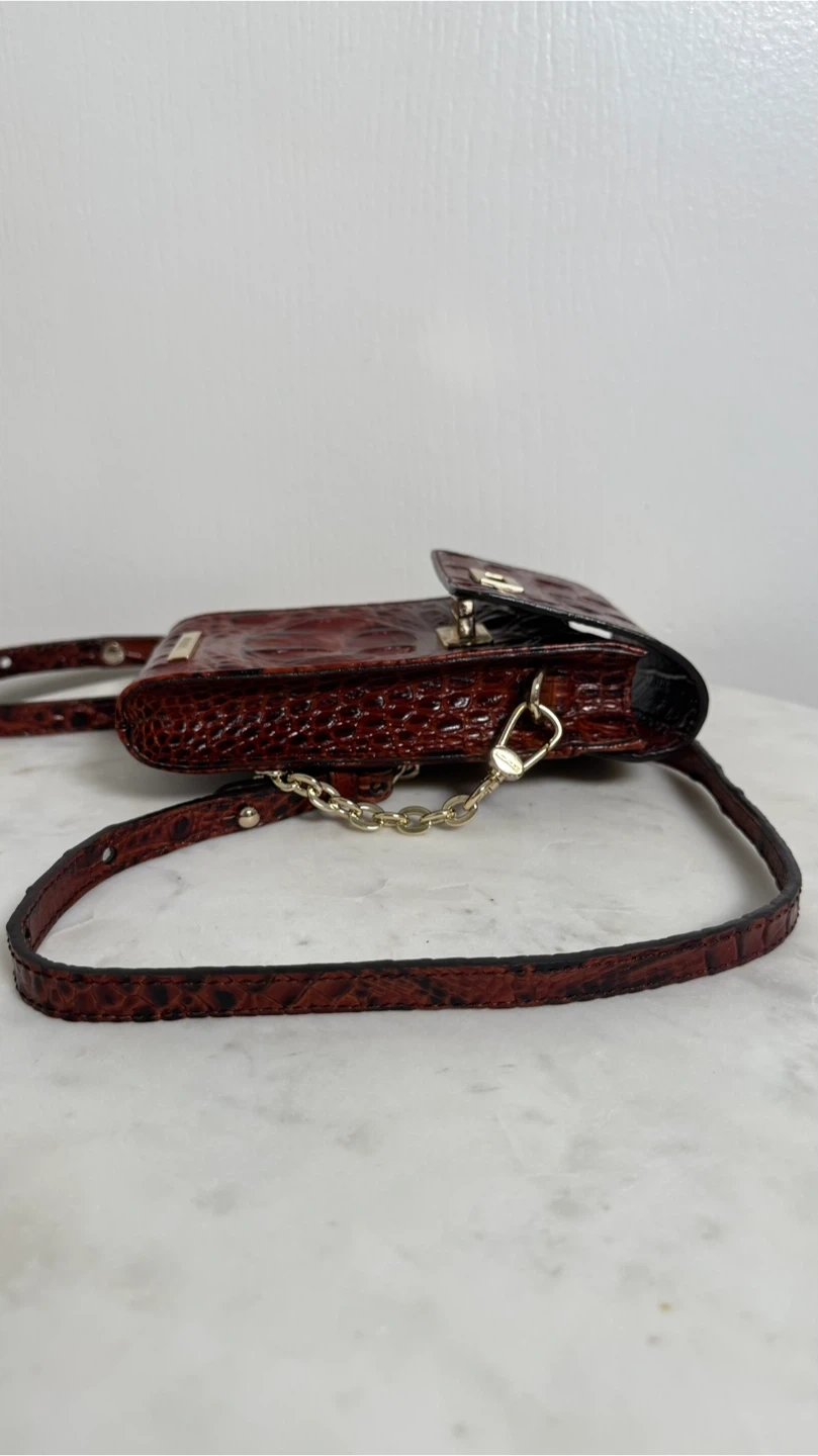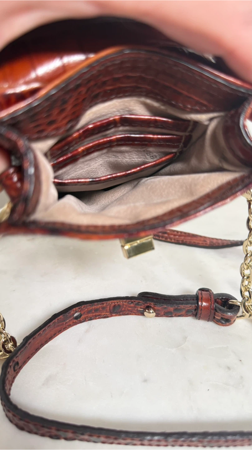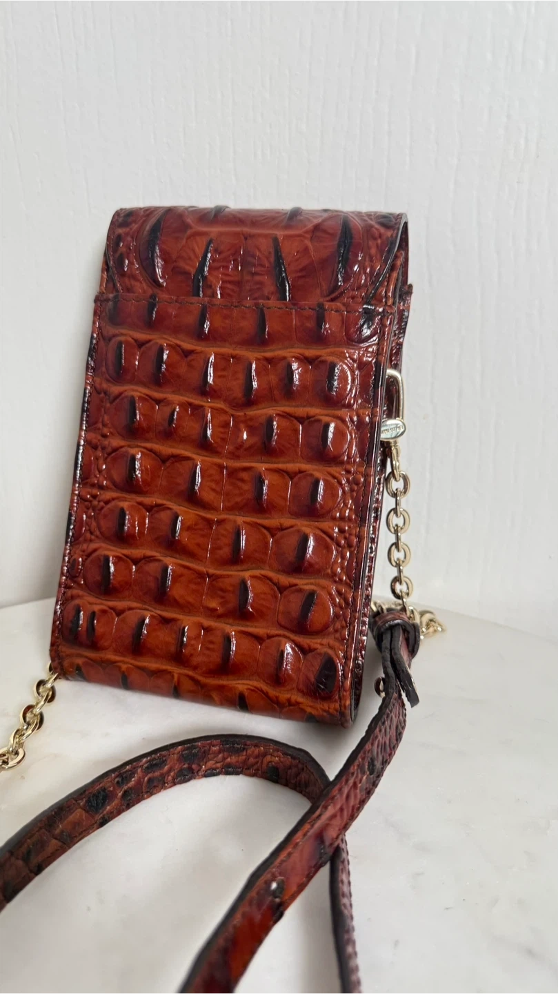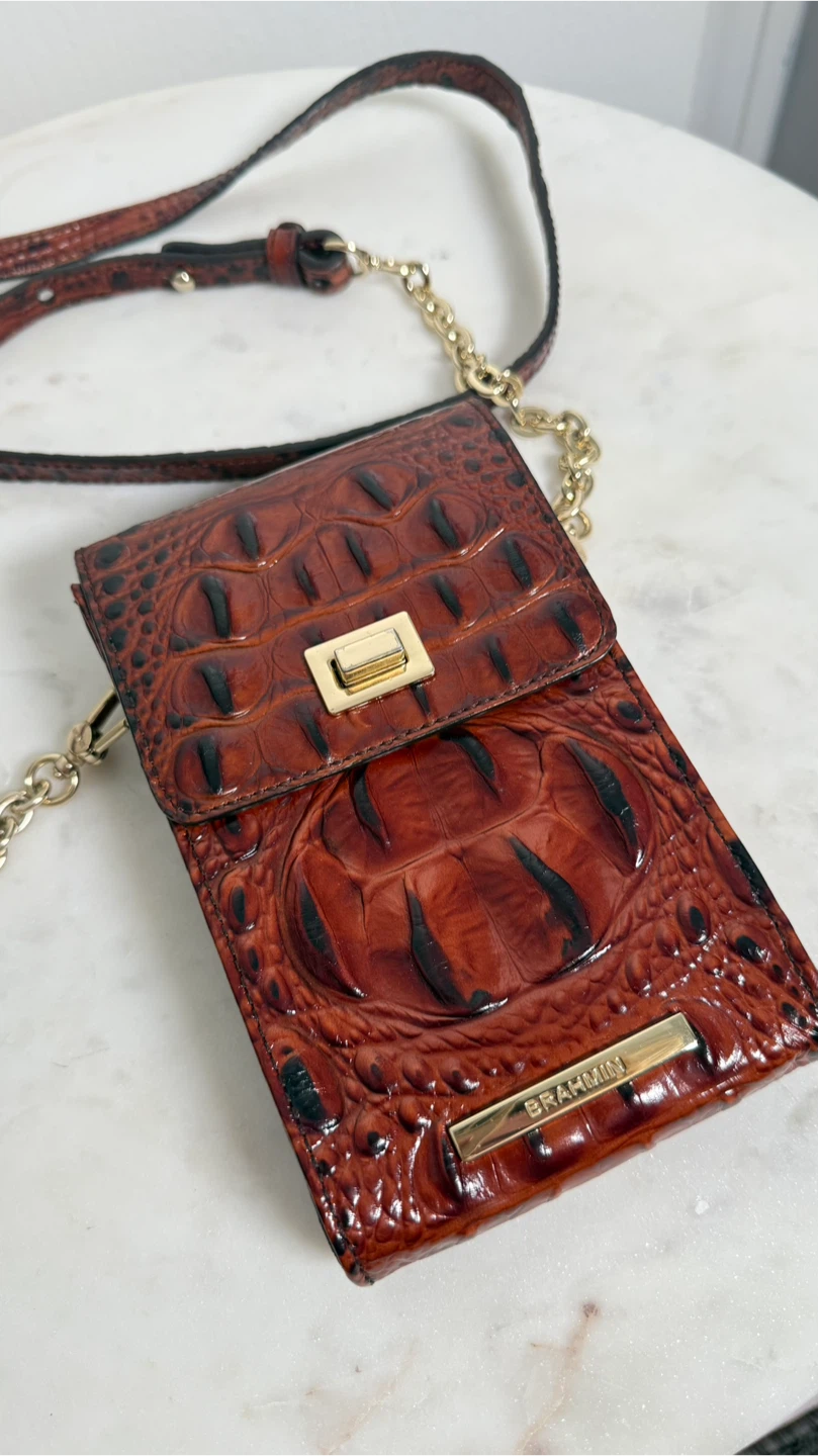 Here's a stylish Brahmin crossbody bag perfect for carrying your phone and essentials! It features a unique brown croc-embossed design and a convenient crossbody strap. The bag includes a chain detail and a secure closure. Great for keeping your phone safe and accessible while on the go!