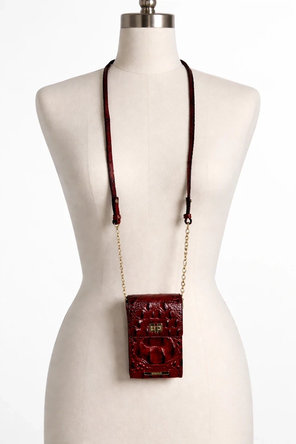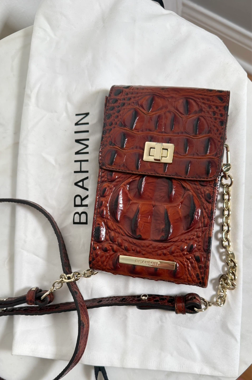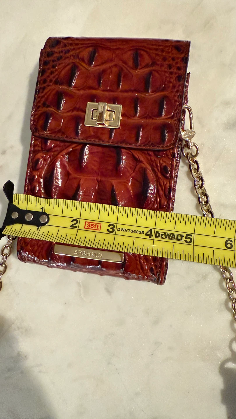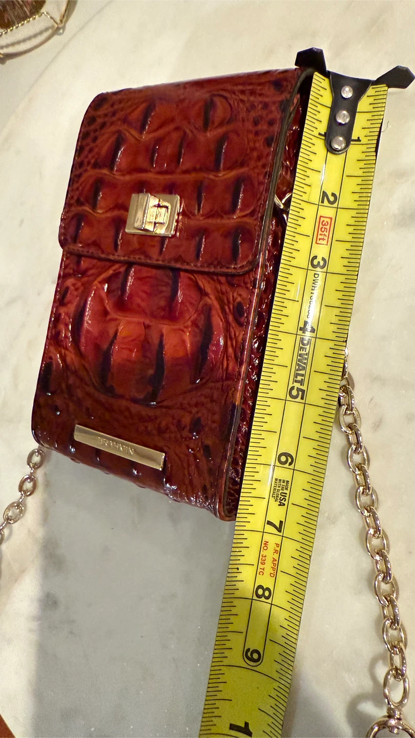 Here's a stylish Brahmin crossbody bag perfect for carrying your phone and essentials! It features a unique brown croc-embossed design and a convenient crossbody strap. The bag includes a chain detail and a secure closure. Great for keeping your phone safe and accessible while on the go!