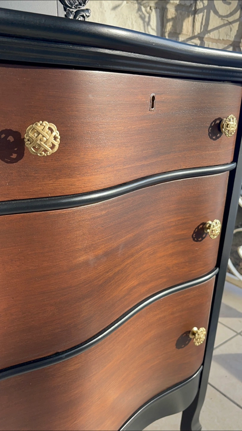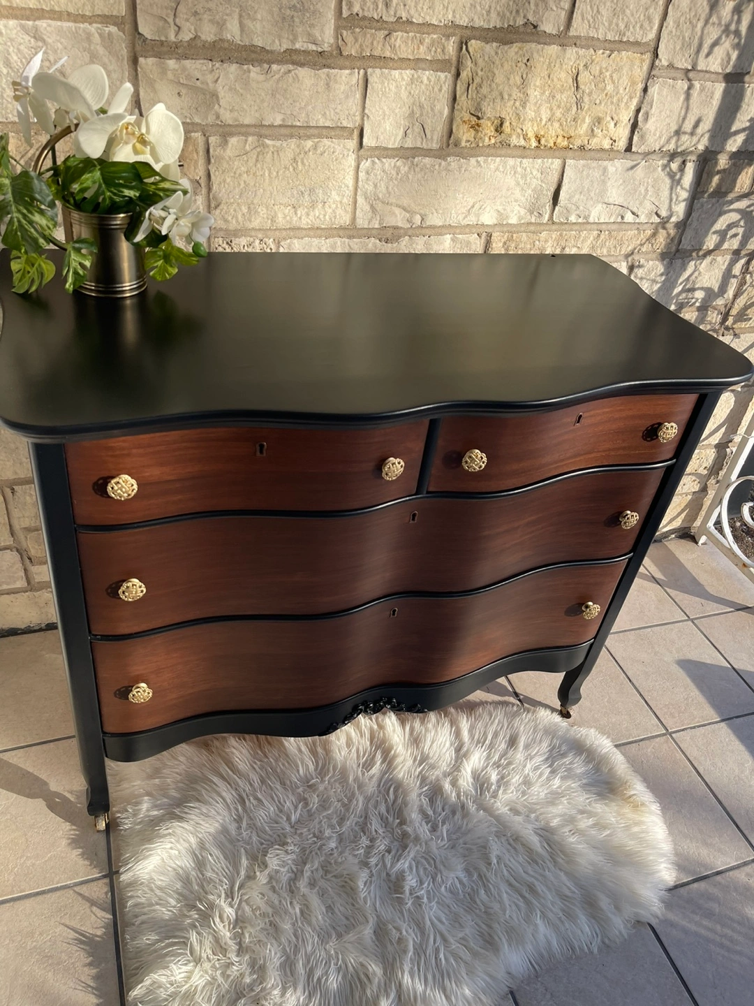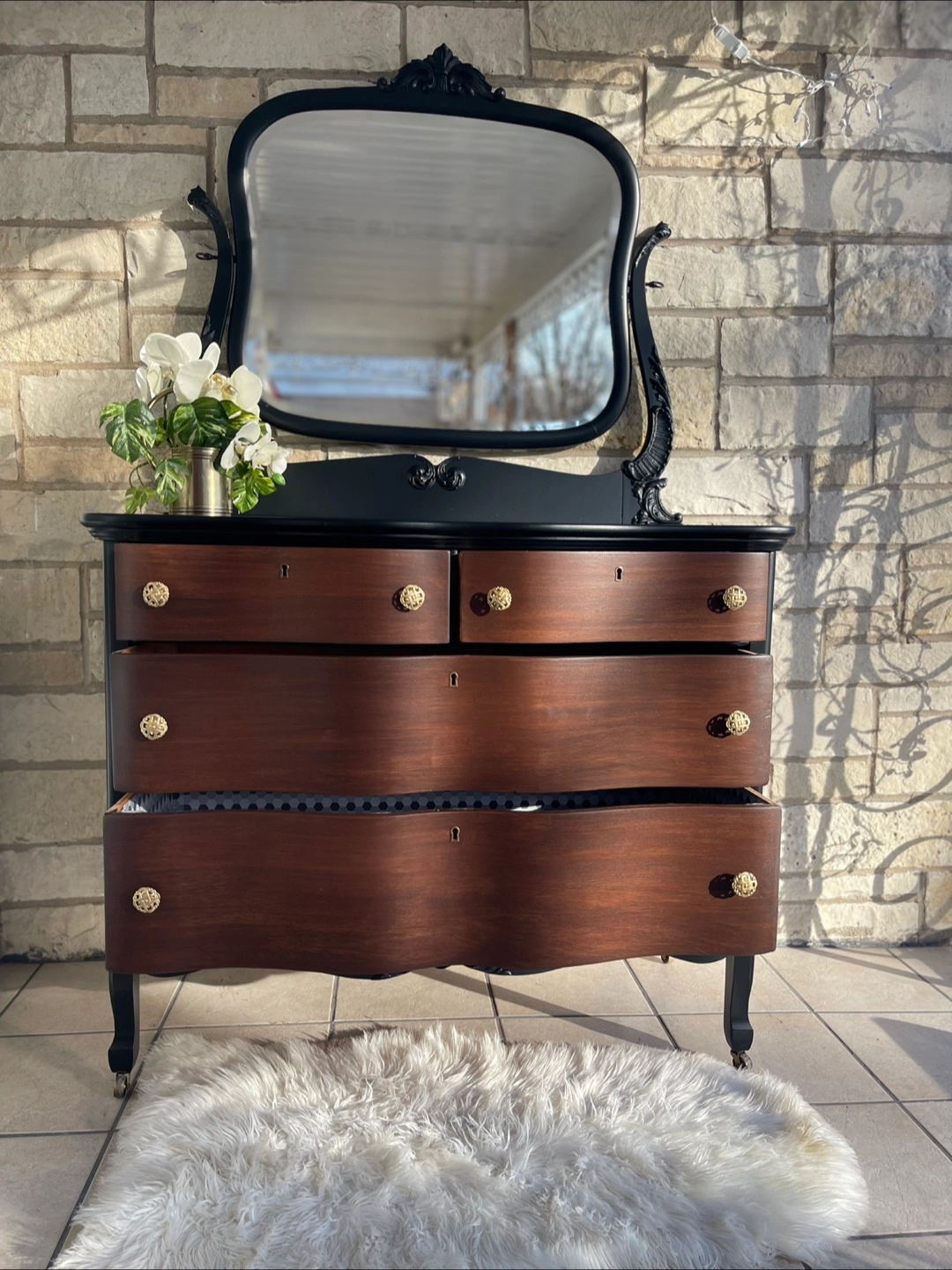 Features primer, paint, stain and 3 layers of polycrylic for extra protection and durability. The body and mirror are painted black for a timeless decor. Paired up with gold hardware and casters, drawers are gliding very smooth. New contact paper added. Solid wood