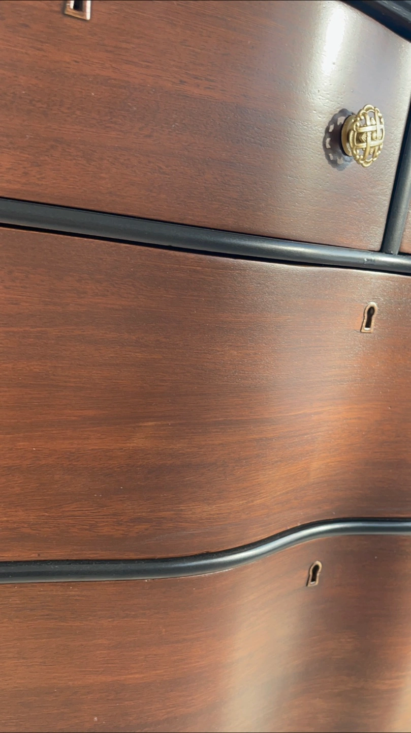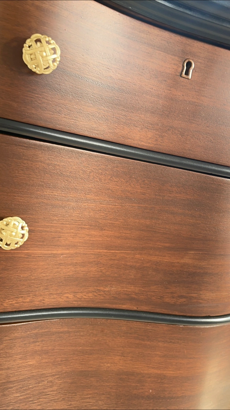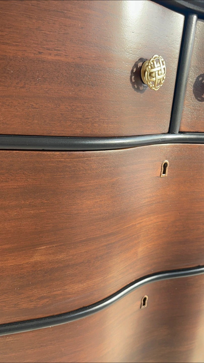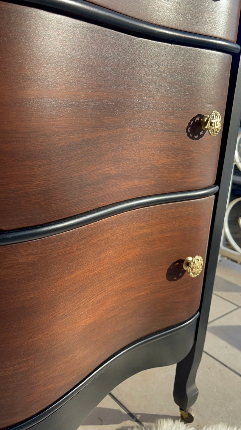 Features primer, paint, stain and 3 layers of polycrylic for extra protection and durability. The body and mirror are painted black for a timeless decor. Paired up with gold hardware and casters, drawers are gliding very smooth. New contact paper added. Solid wood
