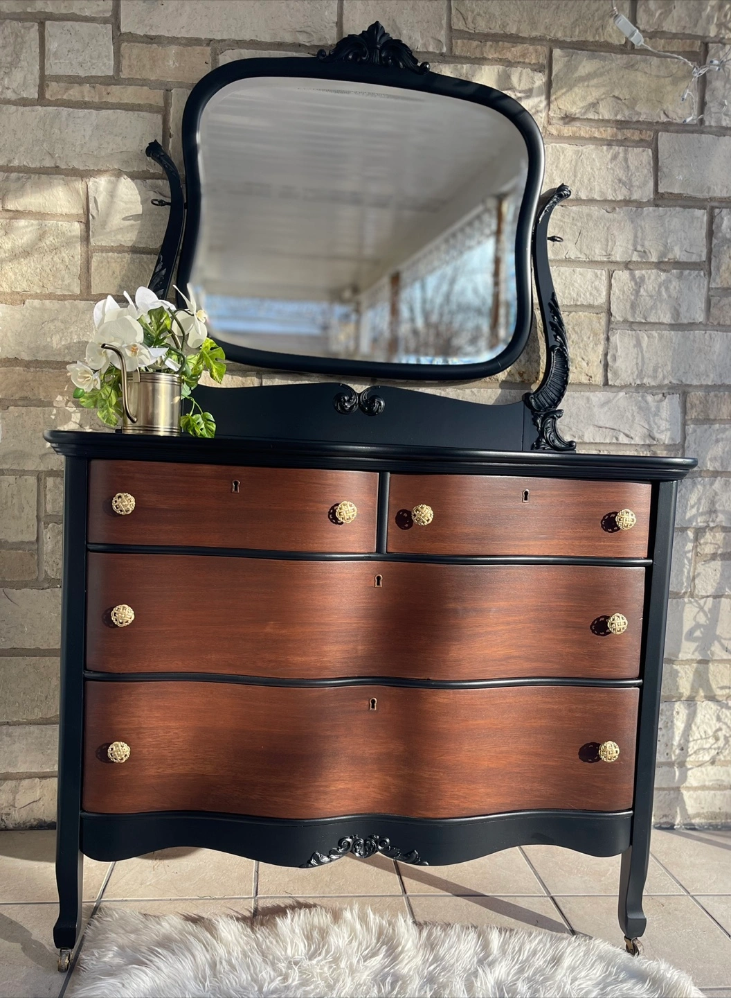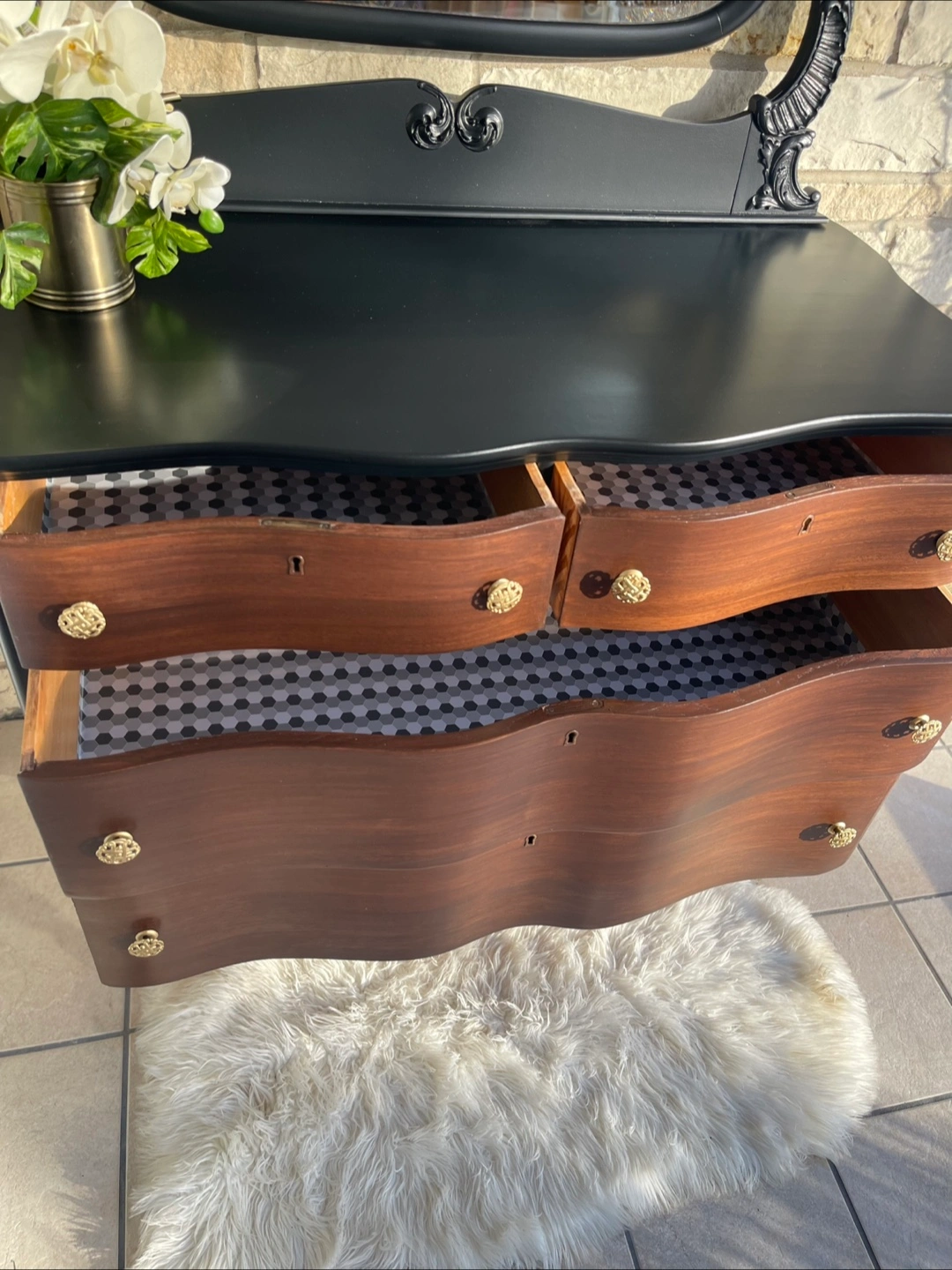 Beautiful Vintage Vanity with mirror/entrance piece/ dressing table restored in two-tone: black and wood.
