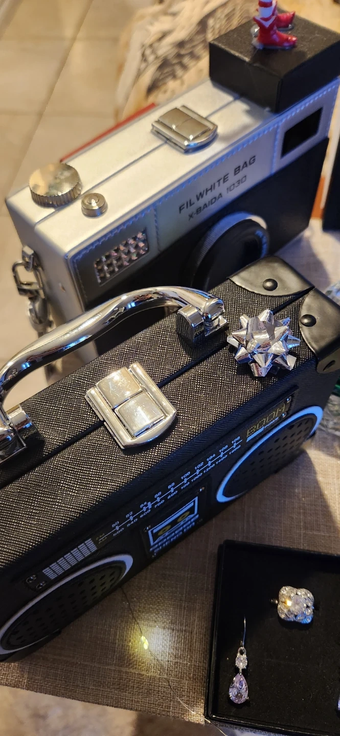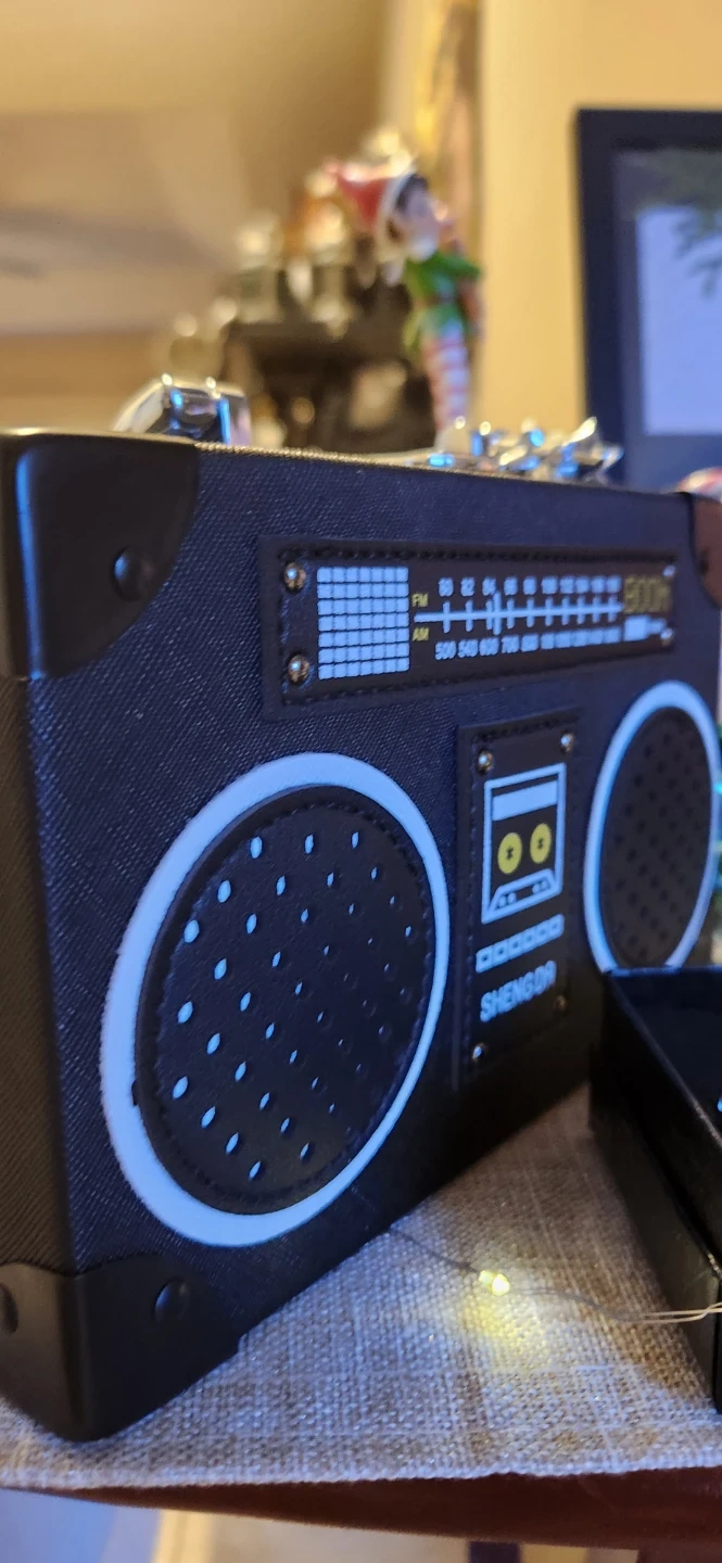 Selling a cute Sheng Da handbag shaped like a vintage radio boombox! It's in great condition and ready for a new owner. The bag is black with white accents, giving it a fun retro look. Perfect for adding a unique touch to your outfit!
