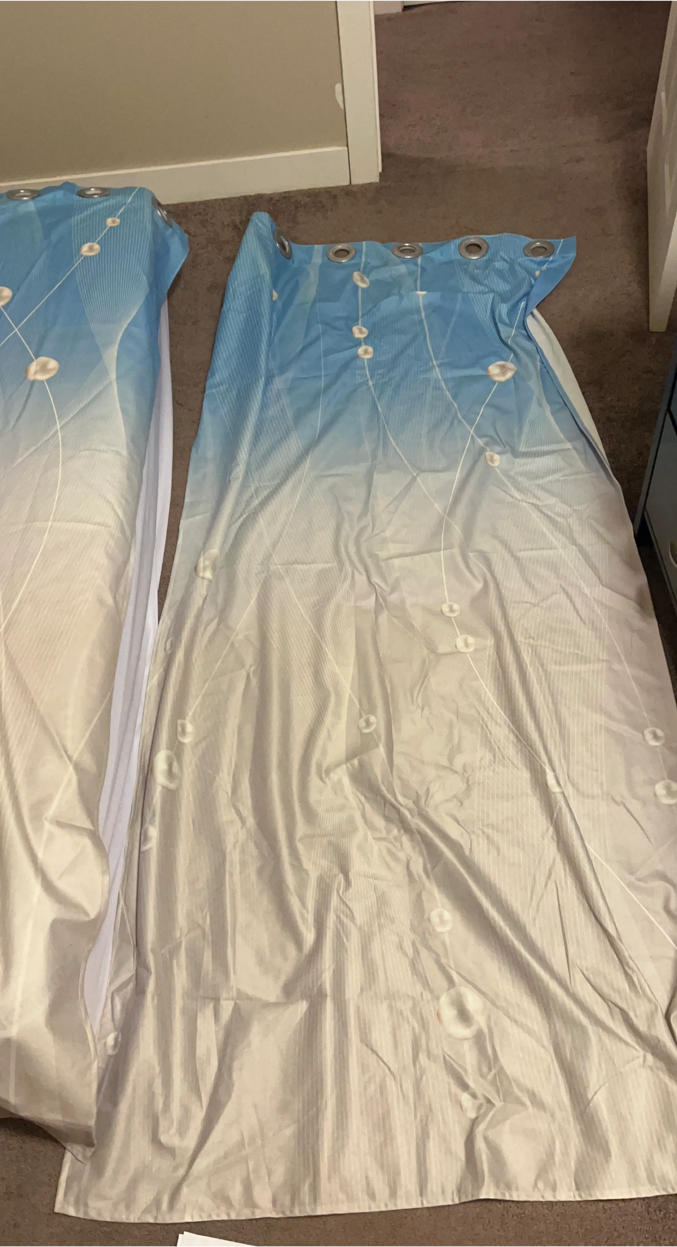 I have a set of curtain panels in a nice blue and white ombre design. They're in good condition and would add a nice touch to any room!