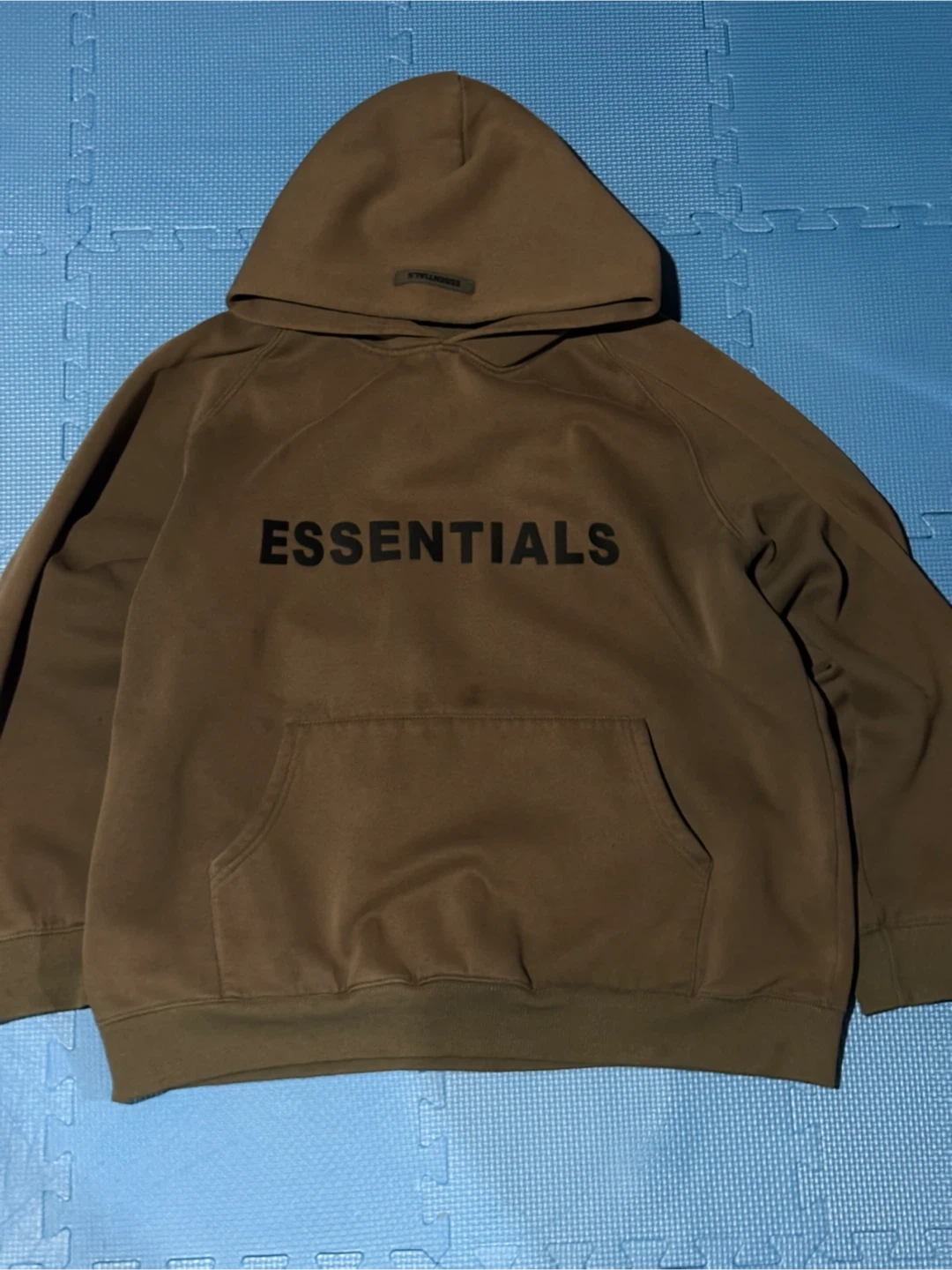 Selling a brown Essentials hoodie. It's in great condition and ready for a new owner! It has the Essentials logo printed on the front.