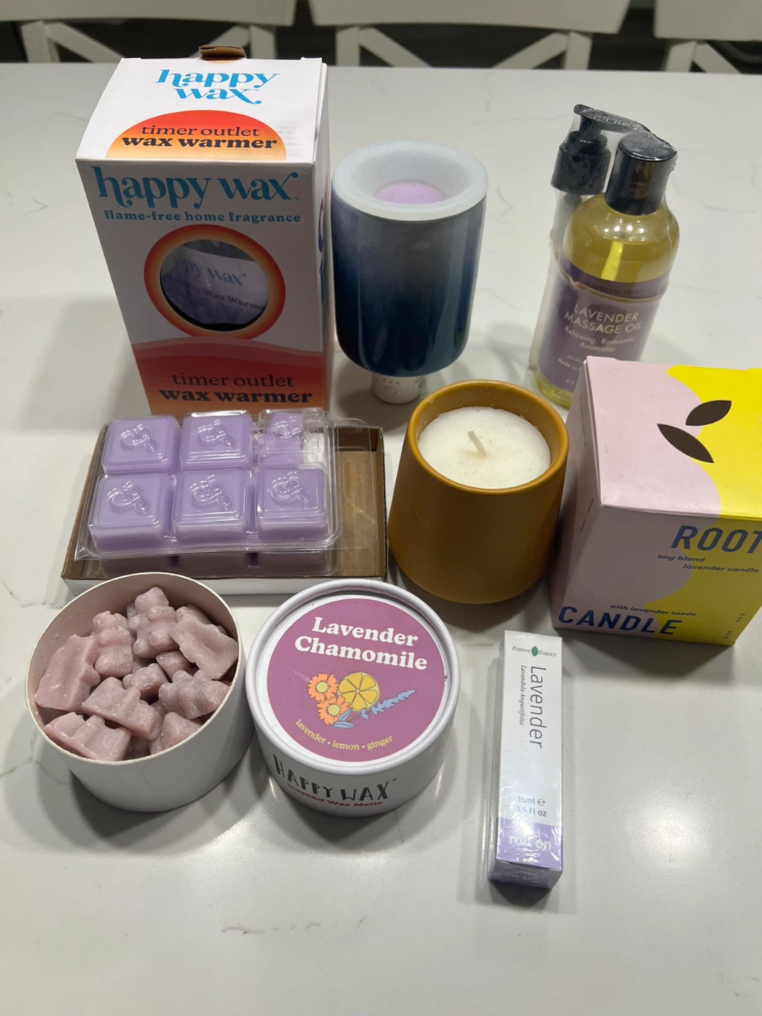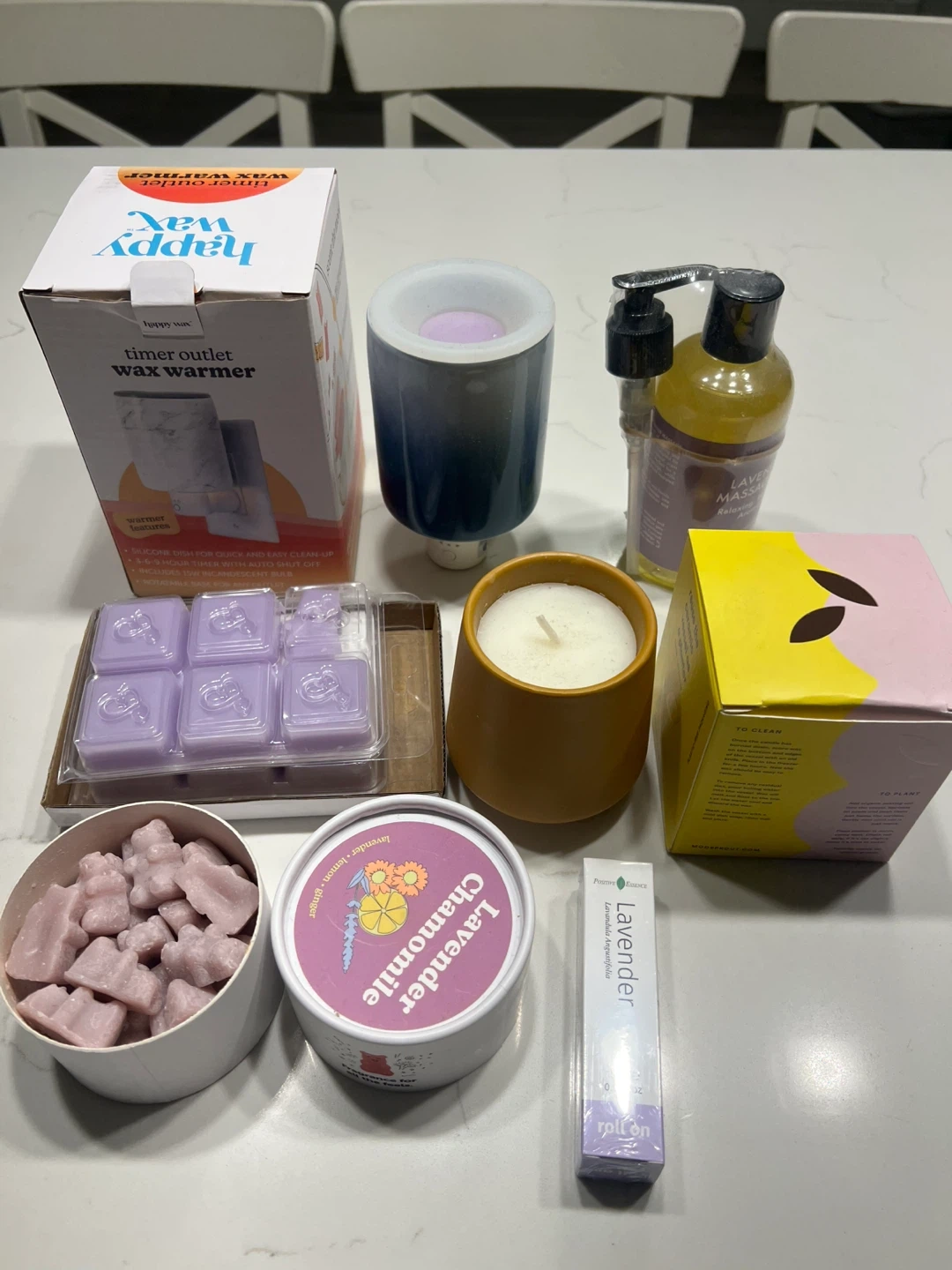 Selling a variety of home fragrance items! Included are candles, a Happy Wax timer outlet wax warmer, lavender massage oil, lavender chamomile candle, and a lavender roll-on essential oil. Perfect for creating a relaxing atmosphere in your home