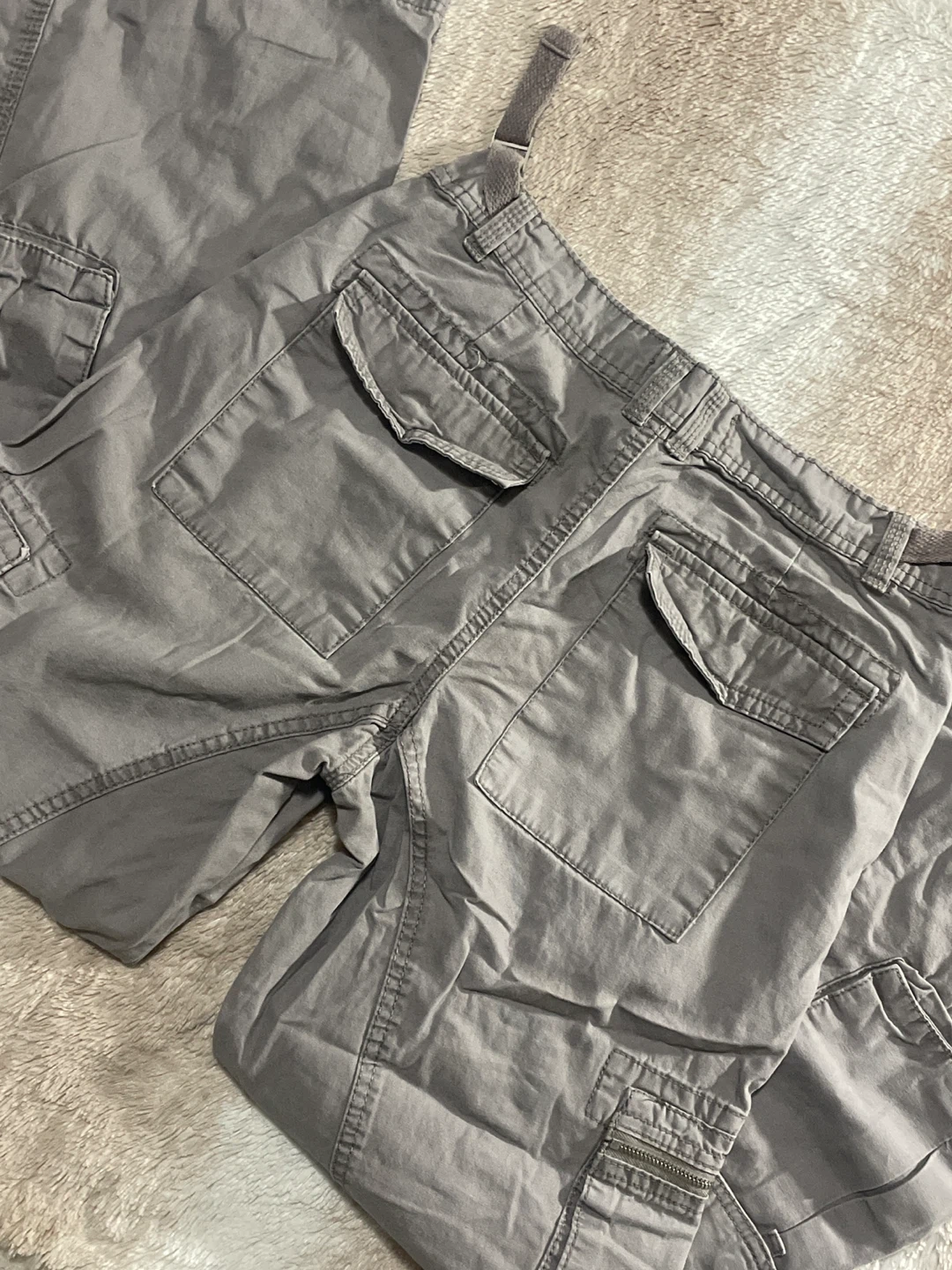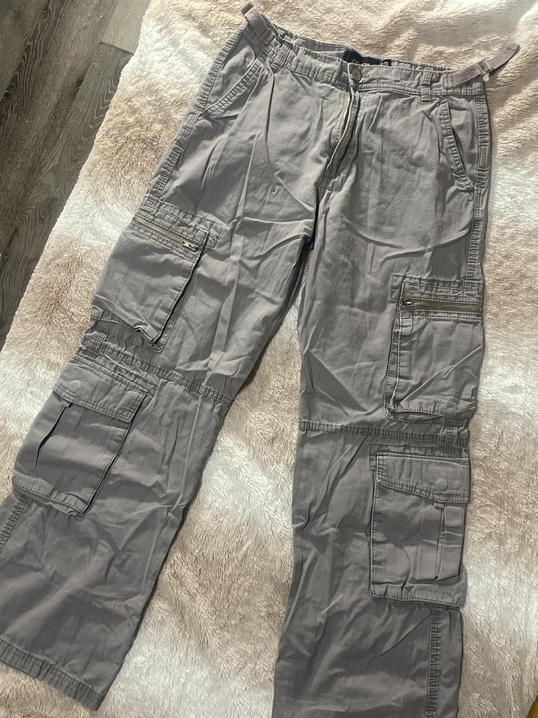 Here are some low rise purple-grey cargo pants. They have adjustable waistband and many pockets, perfect for a street wear look!