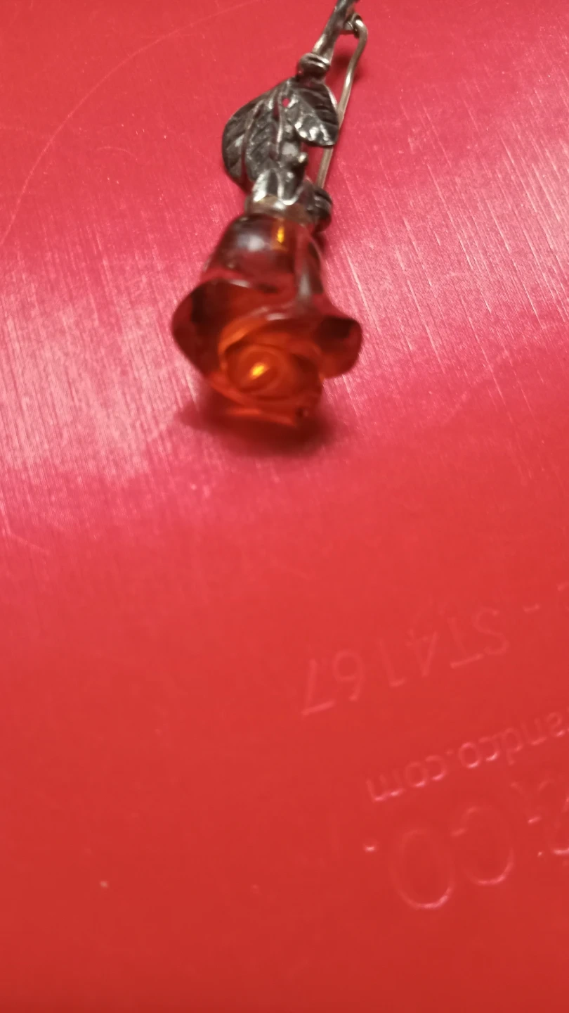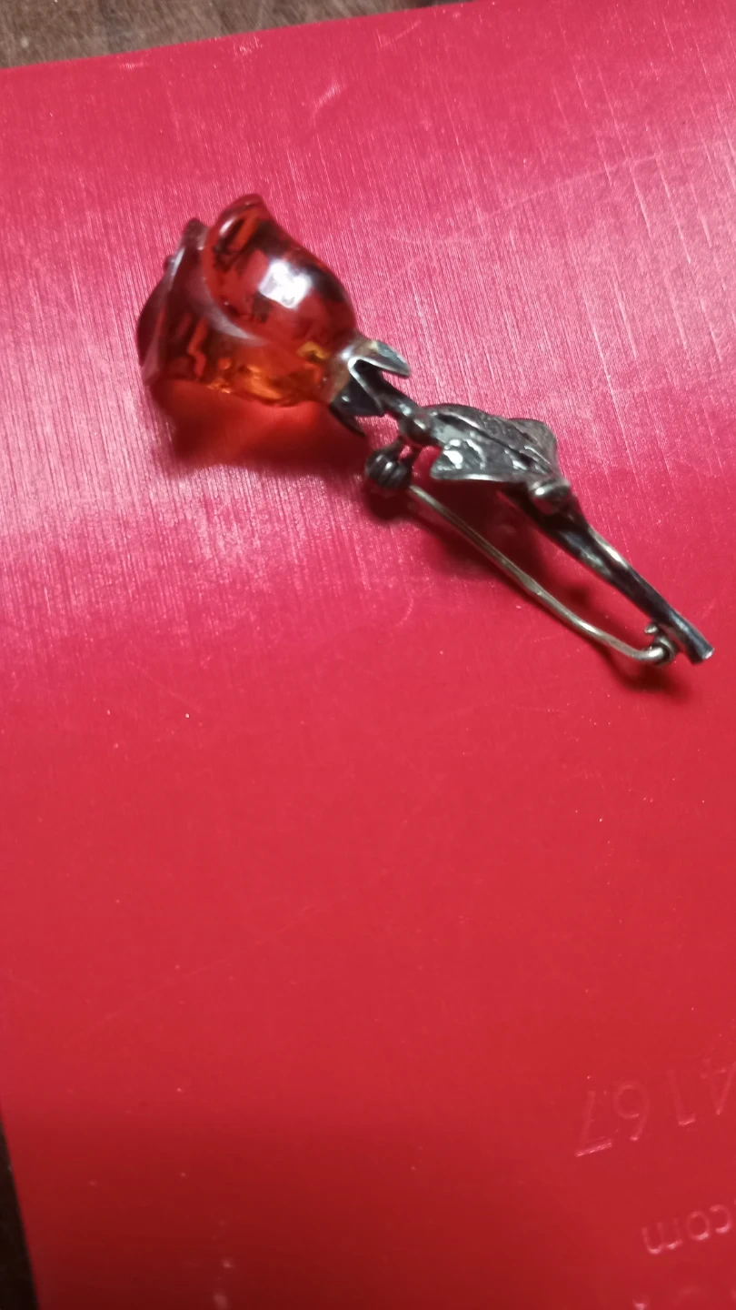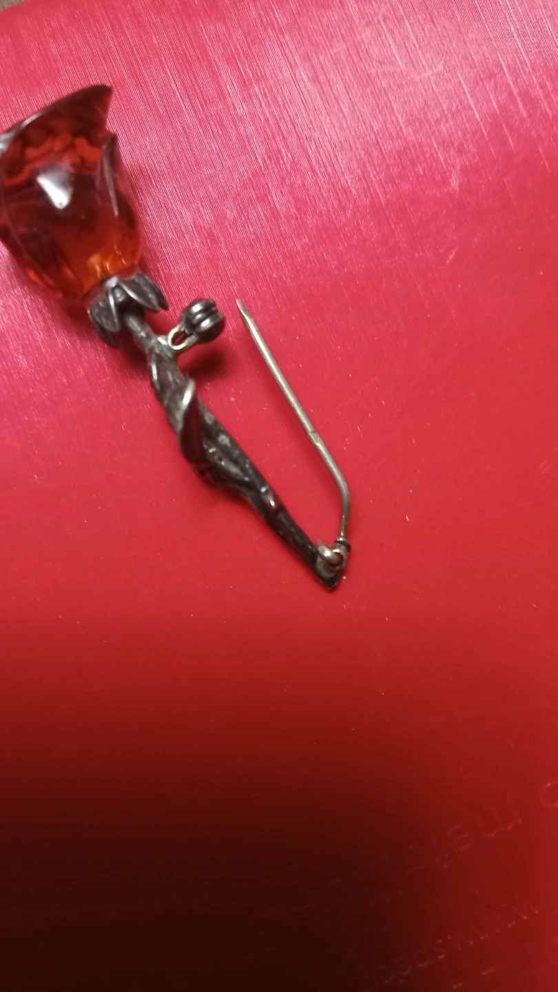 Selling a beautiful rose pin brooch. It features a rose design in an amber colour with silver-tone leaves and stem. A lovely accessory to add to your collection!