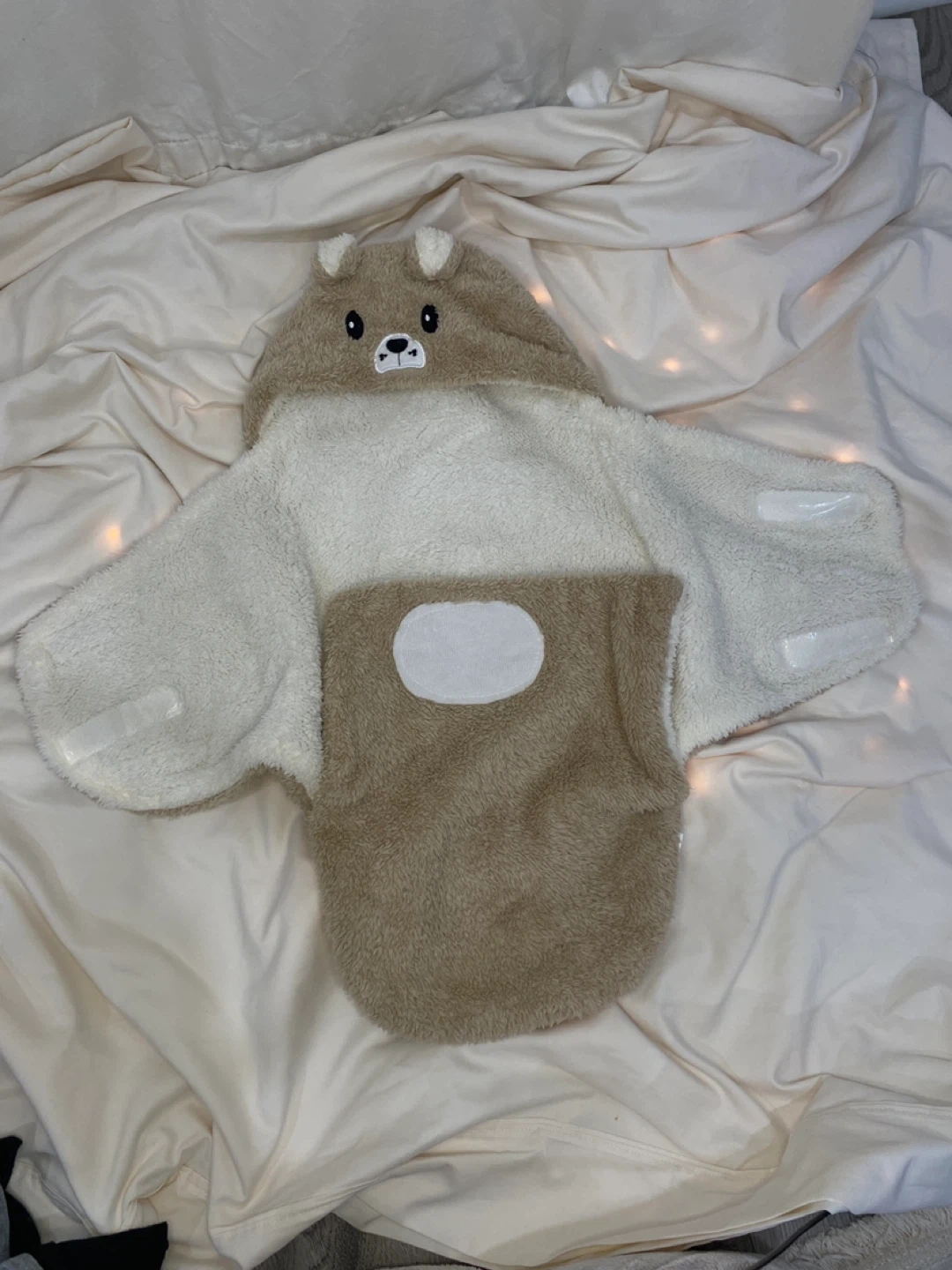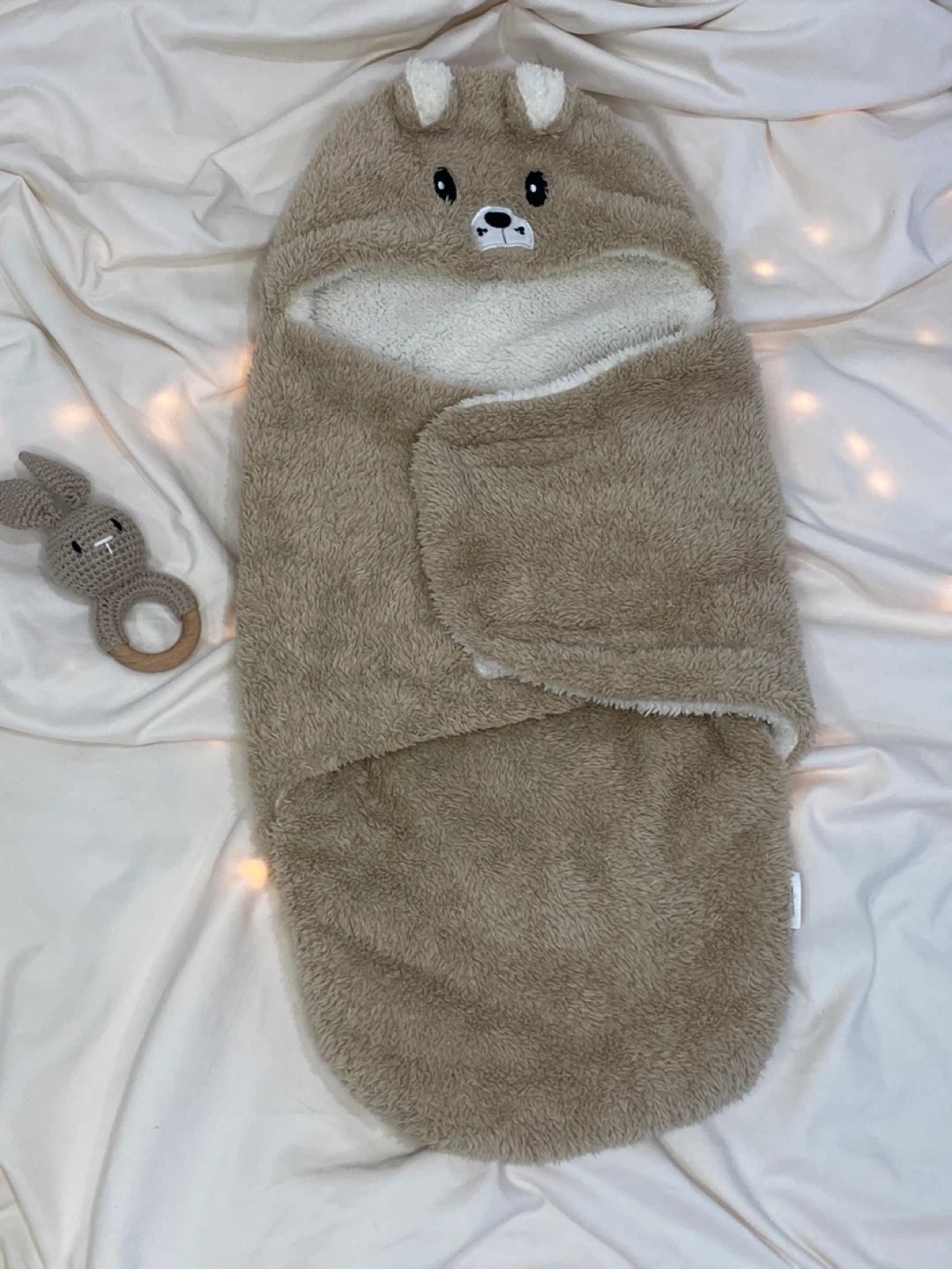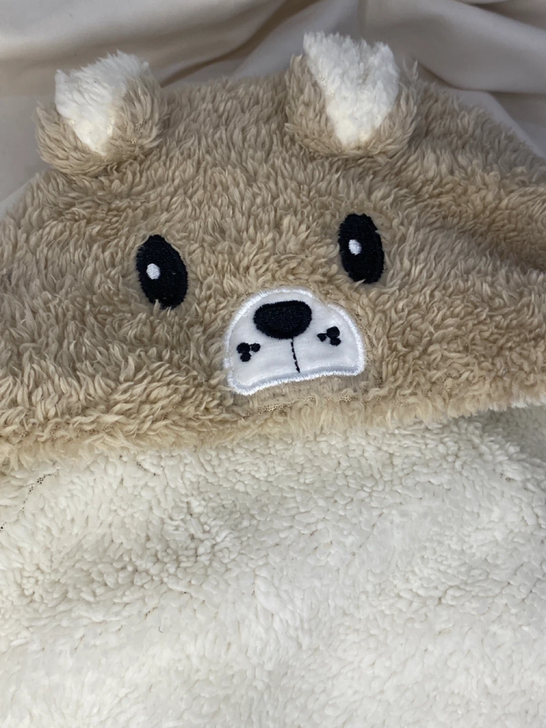 Jolie couverture pour bébé en forme d'ours, parfaite pour les petits de 3 à 6 mois! Elle est super douce et chaude, idéale pour les sorties ou pour emmailloter bébé à la maison. La composition est 100% polyester