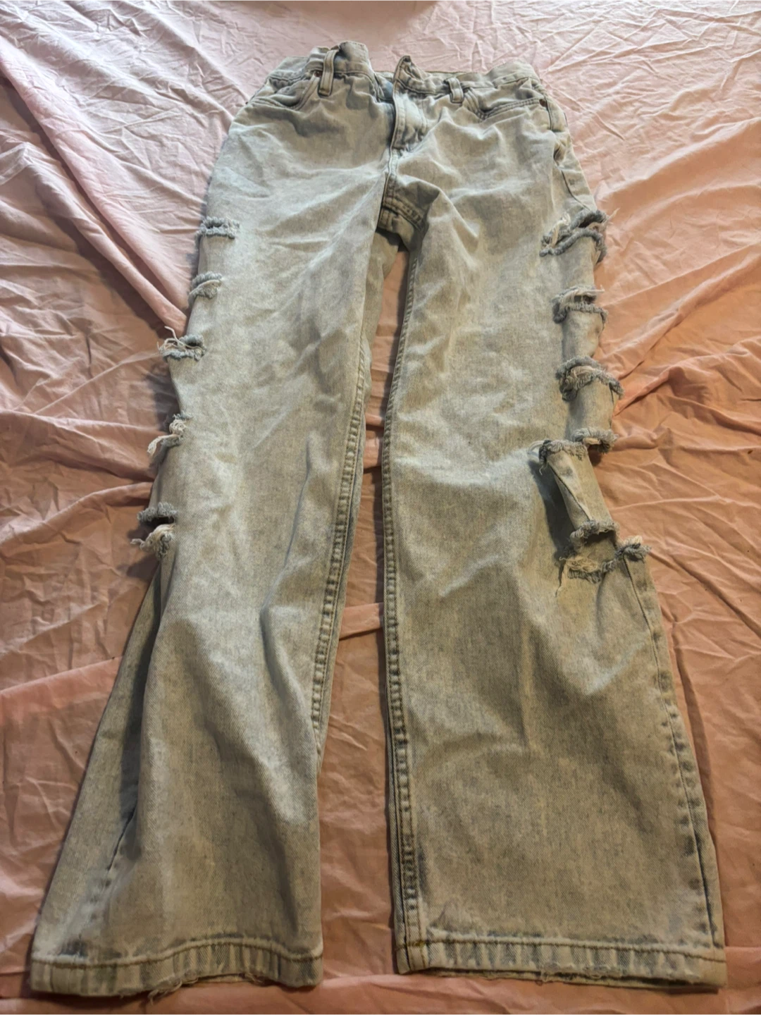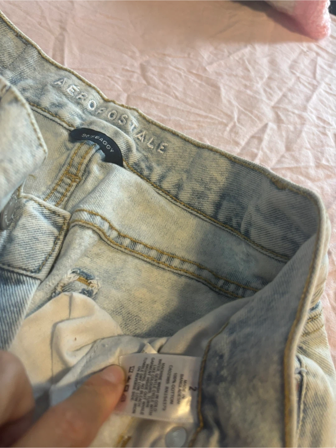 Selling a pair of Aeropostale jeans in size 2! They're a light wash denim with a unique distressed design on the sides. Made of cotton, they're comfy and stylish for everyday wear