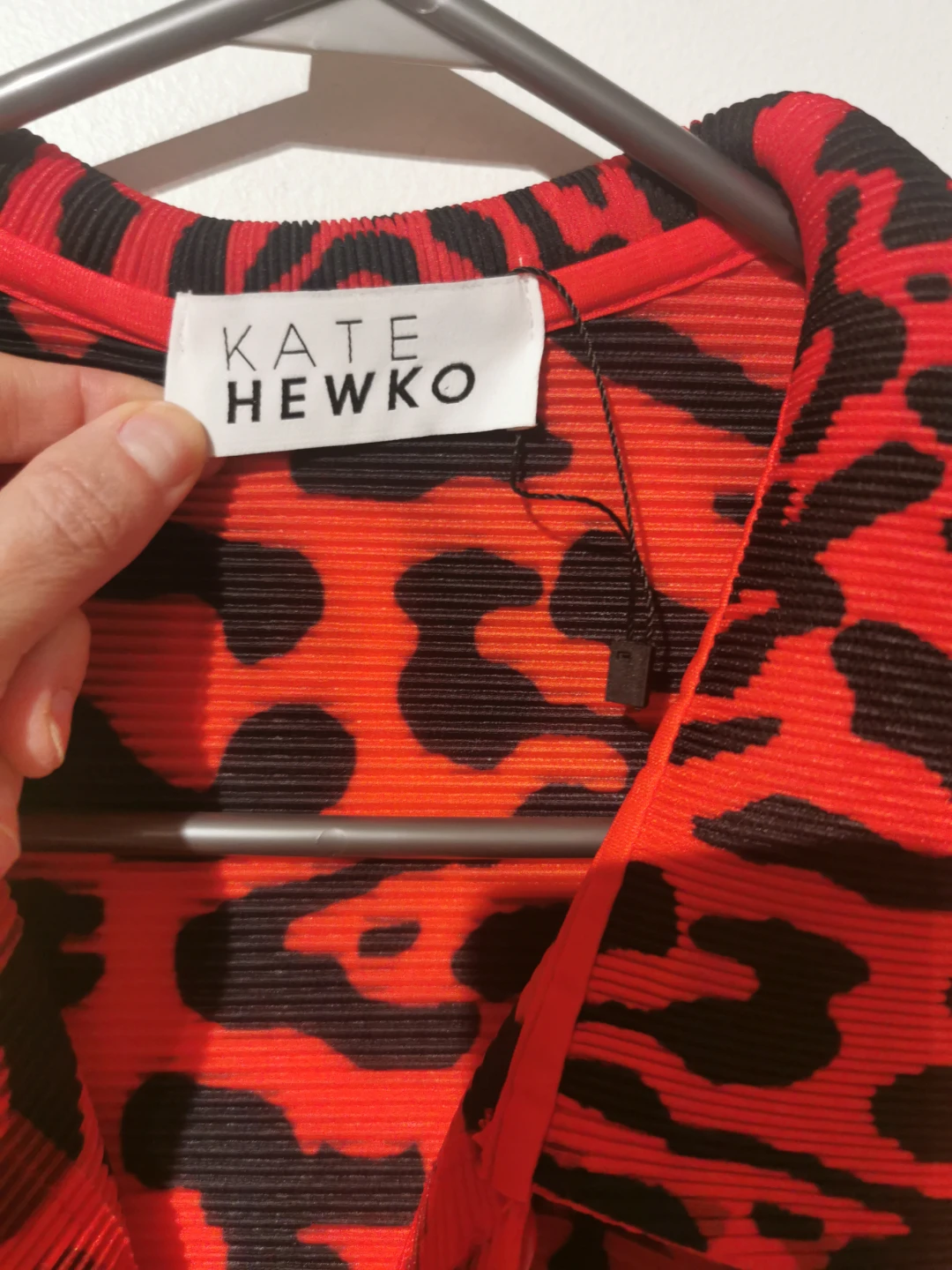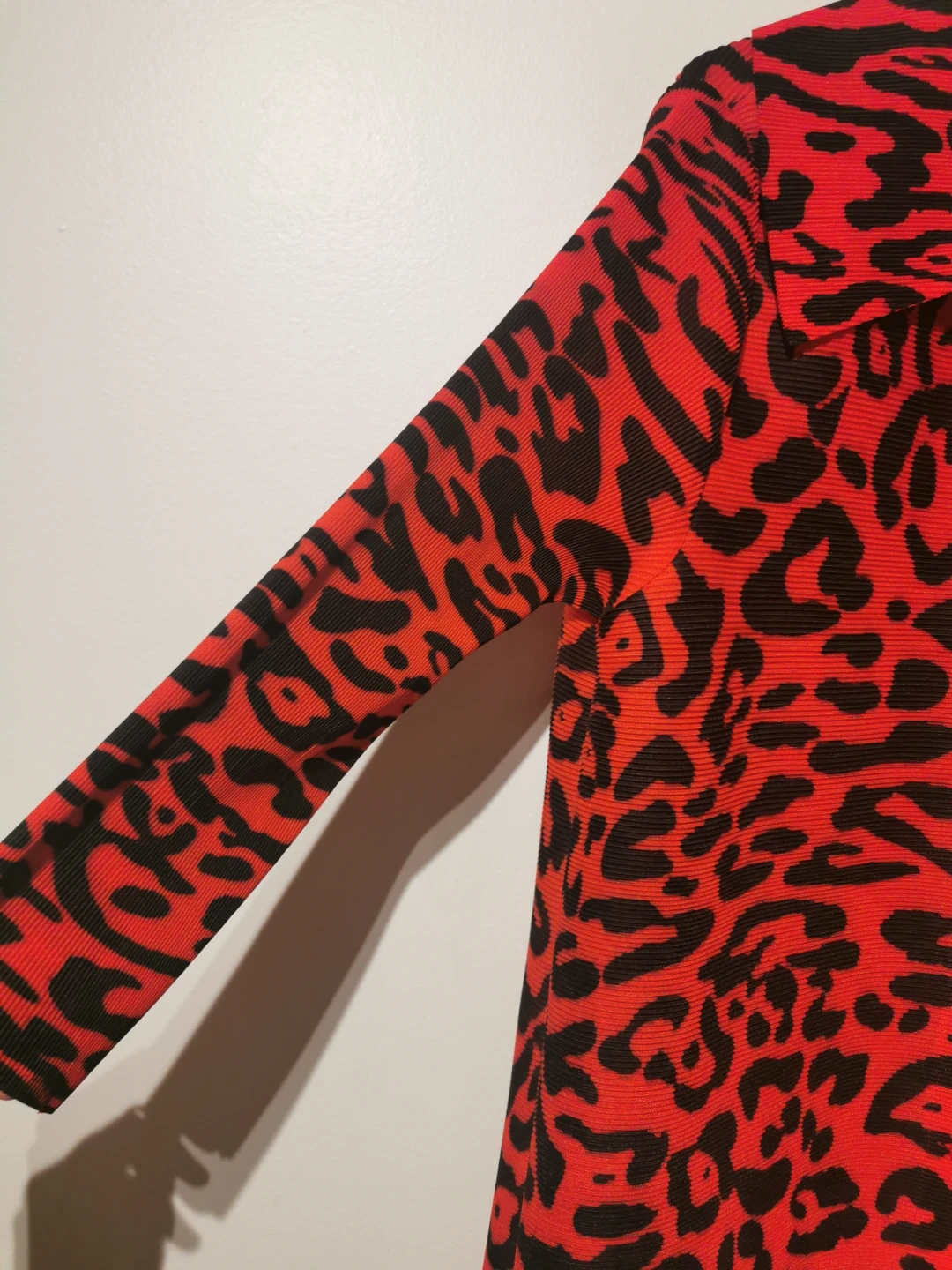 Selling a Kate Hewko Leopard Glam Shirt Dress! This dress is made of 100% polyester and features a striking red and black leopard print. It's a unique and stylish piece to add to your wardrobe!