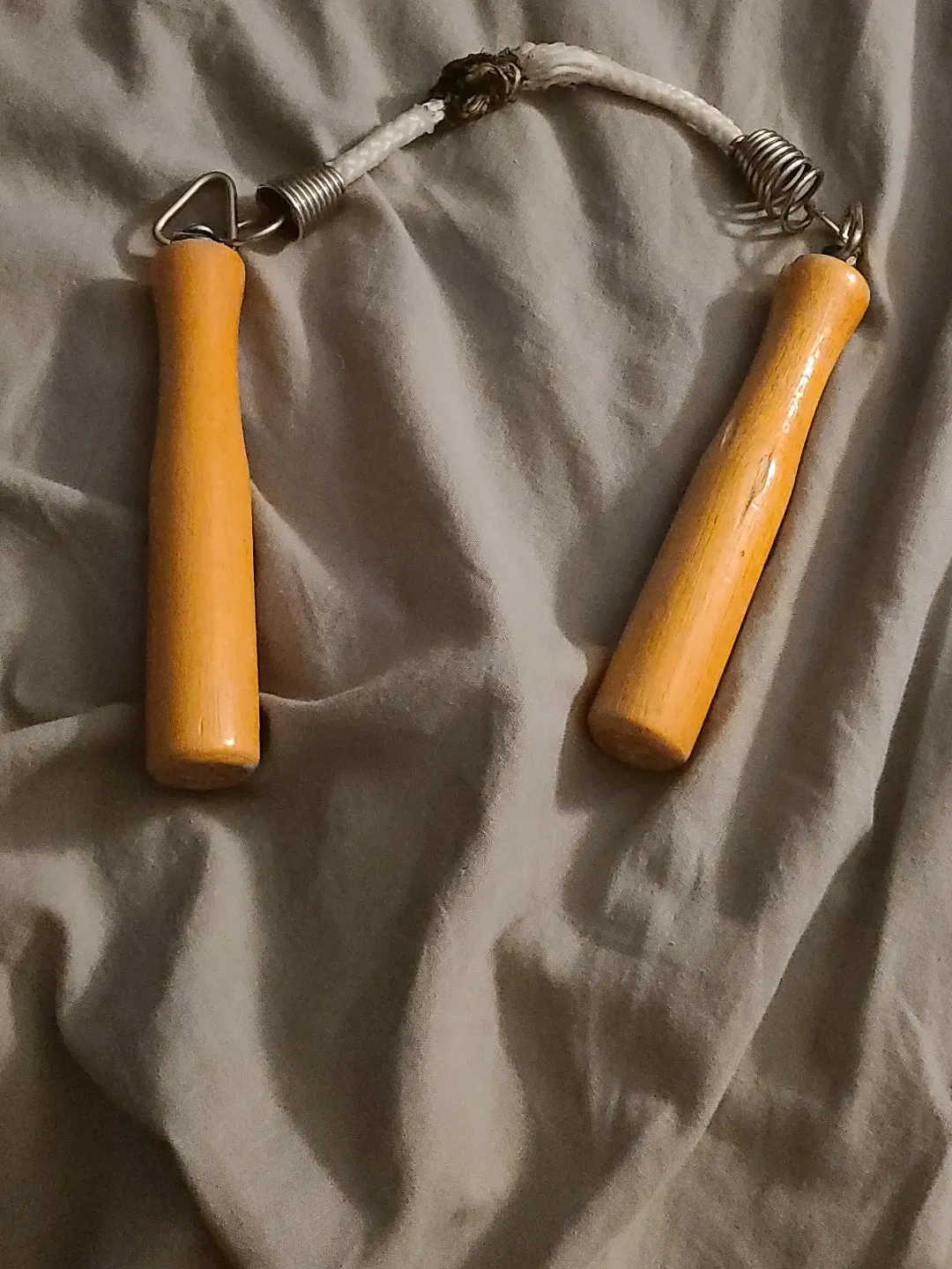 Selling a pair of wooden nunchucks. They feature a rope connection between the handles, and have some wear from use and home made.