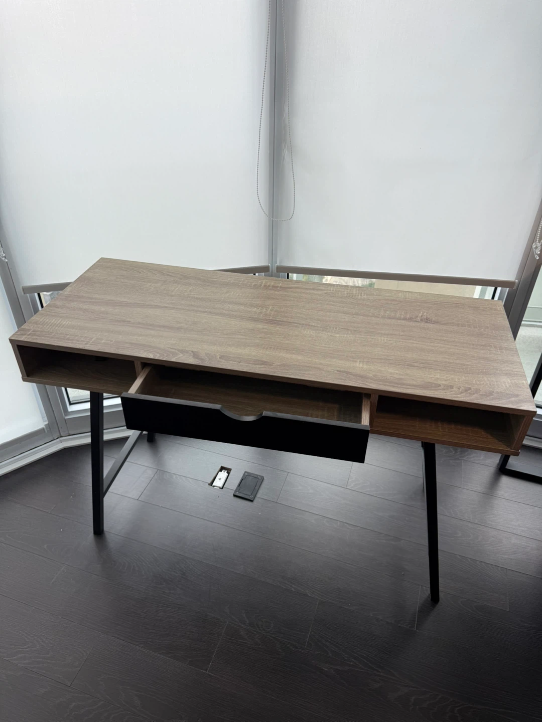 Here's a desk with a wood-look top and black legs. It has a drawer and open storage compartments on either side. It's in great shape and ready for a new study/workspace!