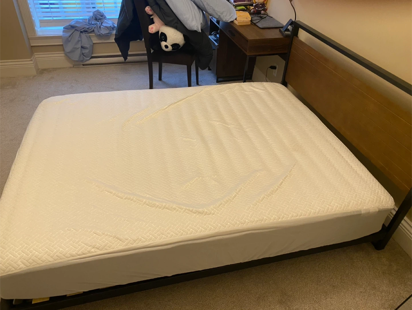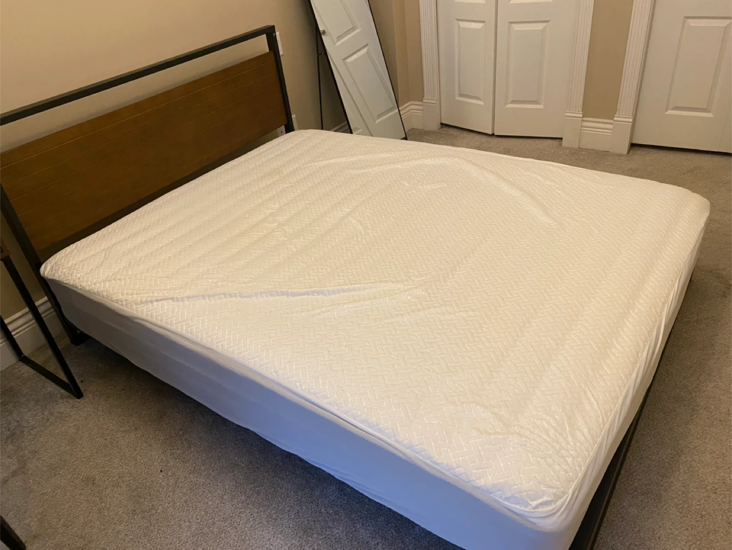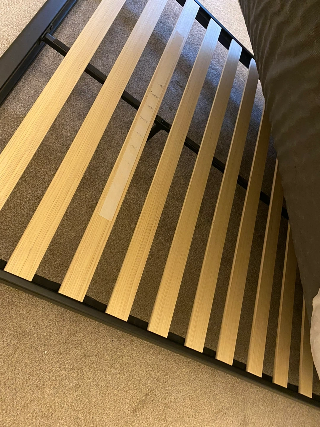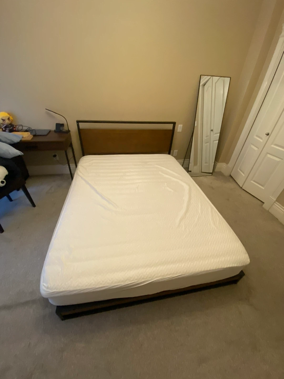 Selling a queen size bed frame. It's made of metal and bamboo, and it's in great shape. Dimensions are 80.00 x 59.50 x 14.00 inches. It's a sturdy and stylish bed frame that's easy to assemble.